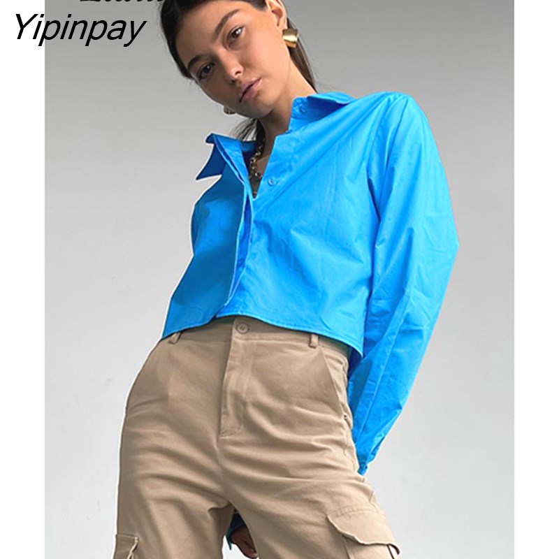 Yipinpay 2023 Spring Minimalist Long Sleeve Women Blue Shirt Korea Style Button Up Solid Woman Crop Tops Blouse Female Clothing