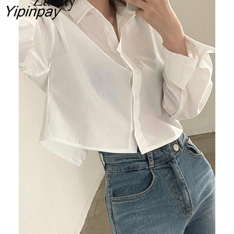 Yipinpay 2023 Spring New Casual Long Sleeve Women White Shirt Korea Style Solid Button Split Woman Crop Tops Blouse Party Clothing