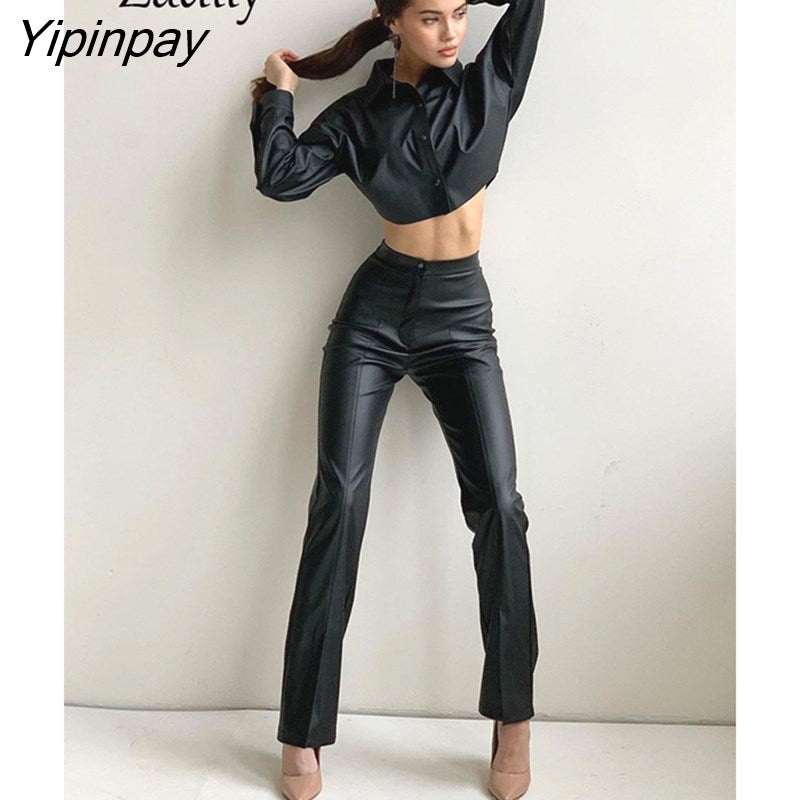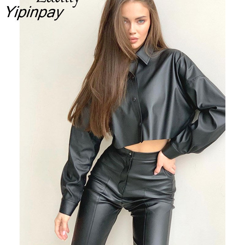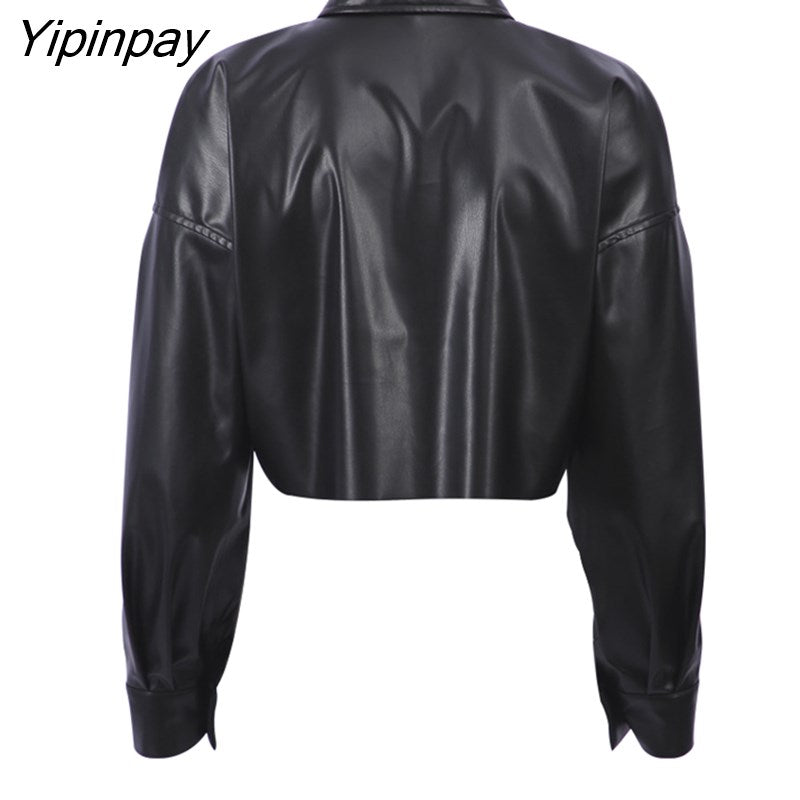 Yipinpay 2023 Spring New In Streetwear Long Sleeve Black Pu Shirt Women Sexy Button Up Woman Crop Tops Blouse Female Clothing