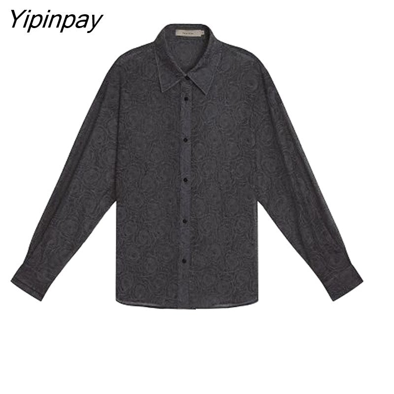 Yipinpay 2023 Spring Sexy Long Sleeve Floral Embroidery Shirt Blouse Women Lace Transparent Button Up Oversize Female Shirts Tops