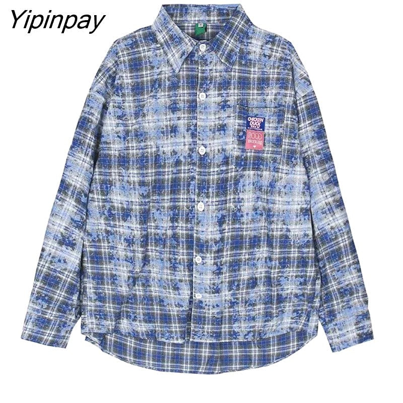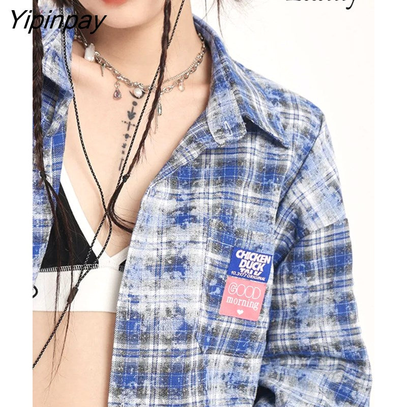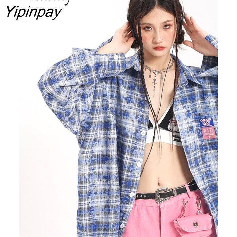 Yipinpay 2023 Spring Streetwear Long Sleeve Plaid Print Shirt Women Oversize Button Up Turn Down Collar Ladies Tunic Blouse Tops