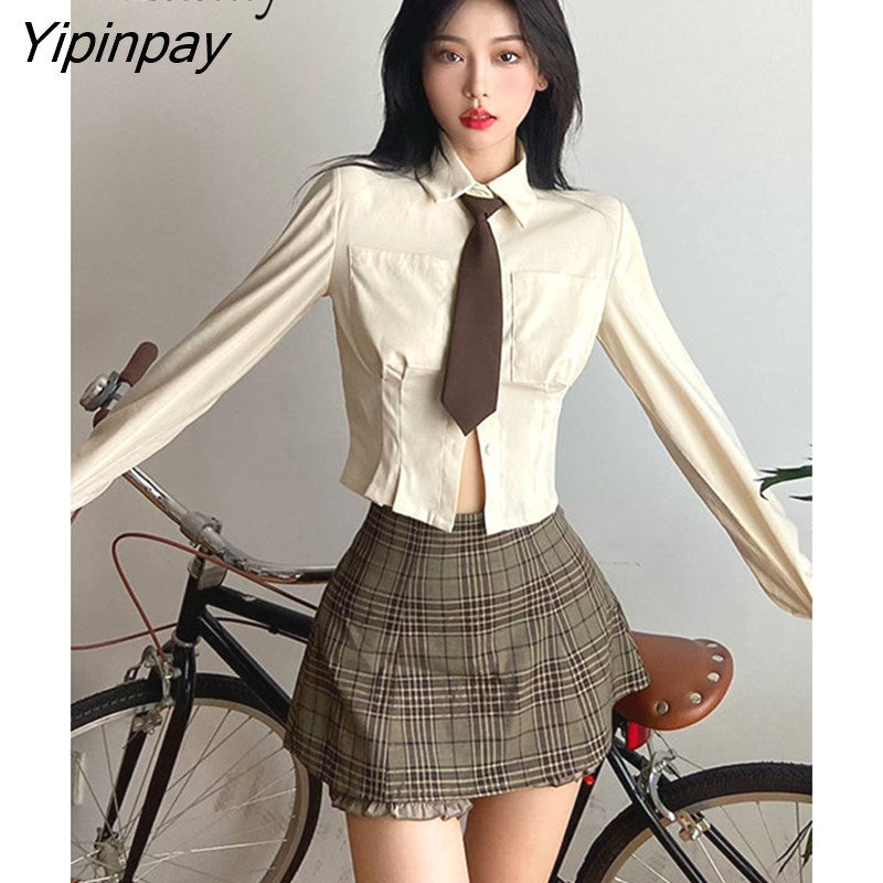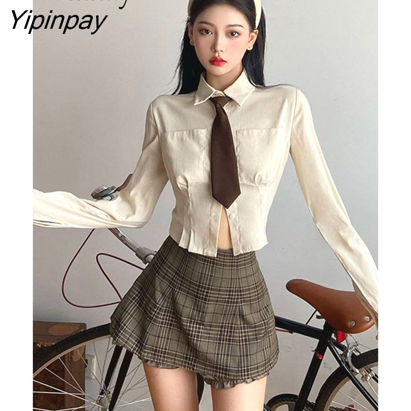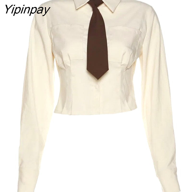 Yipinpay 2023 Spring Sweet JK Long Sleeve Shirt Women Korea Style Slim Button Up Tie Ladies Crop Top Blouse Autumn Female Clothing