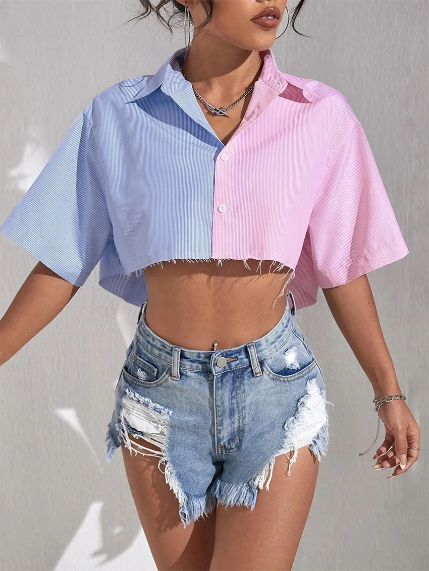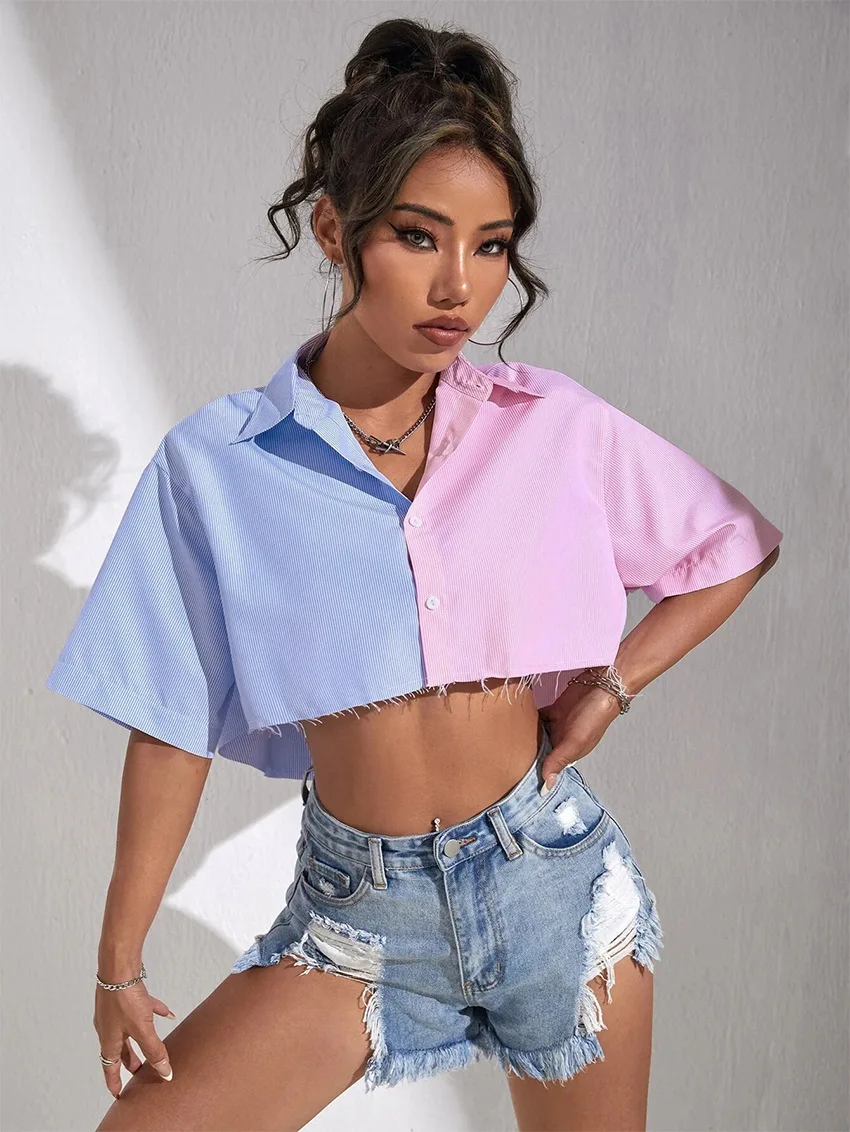 Yipinpay 2023 Summer New Streetwear Short Sleeve Women Shirt Y2K Patchwork Button Up Woman Crop Tops Blouse Party Female Clothing