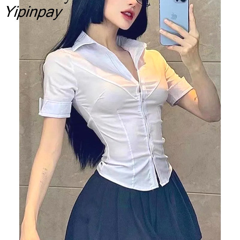 Yipinpay 2023 Summer Sexy Slim Short Sleeve White Shirt Women Button Tie Ladies Blouse Office Cosplay New In Female Clothing Tops