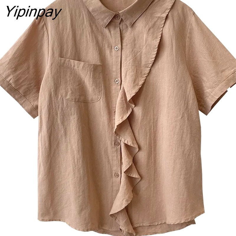 Yipinpay 2023 Summer Short Sleeve Cotton Shirt Women Korean style Ruffles Button Up Solid Ladies Blouse Tunic Casual Clothing Tops