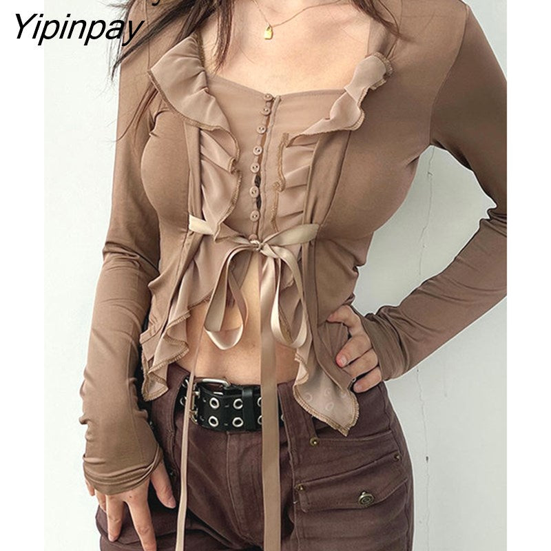 Yipinpay 2023 Summer Y2K Long Sleeve Ruffles Women Shirt Button Up Patchwork Slim Ladies Crop Tops Blouse Party Female Clothing