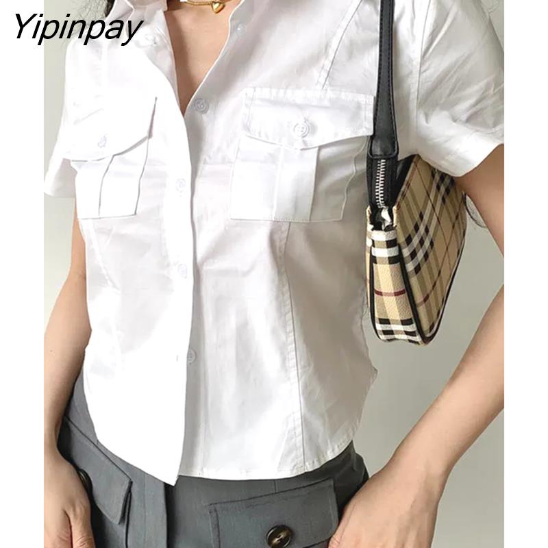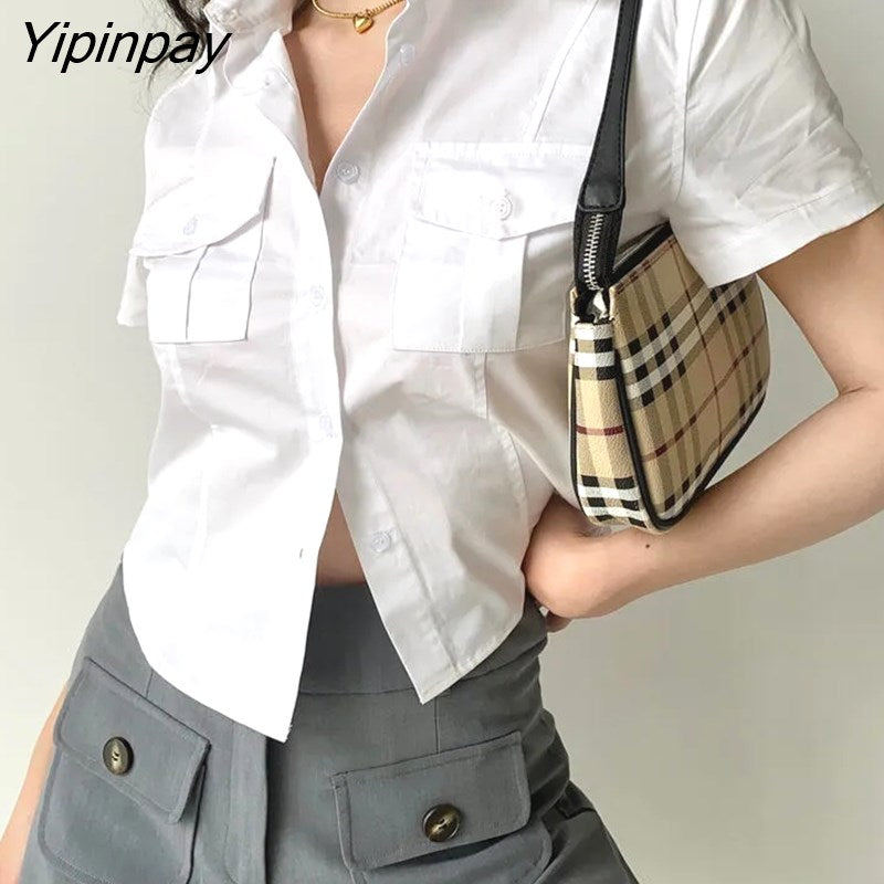 Yipinpay 2023 Summer Y2K Pocket Short Sleeve White Shirt Women Sexy Button Slim Crop Tops Blouse New Streetwear Female Clothing