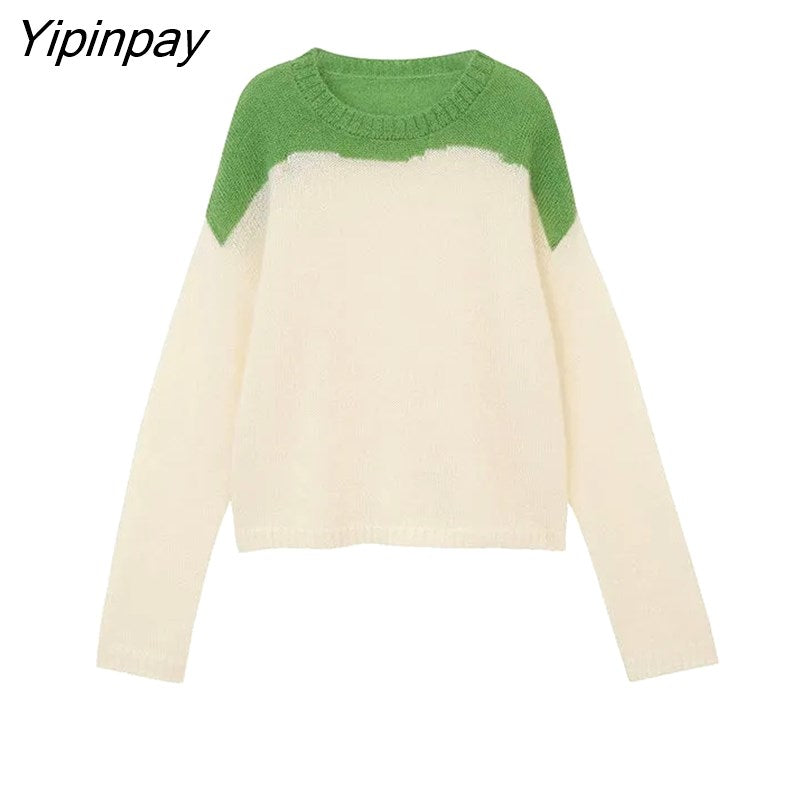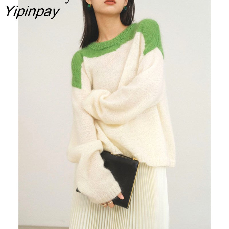Yipinpay 2023 Winter Korean Style Long Sleeve Patchwork Sweater Women Casual Loose Mohair O Neck Pullover Female Clothing Tops