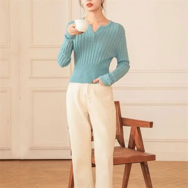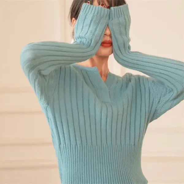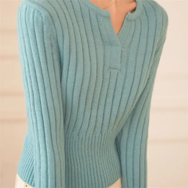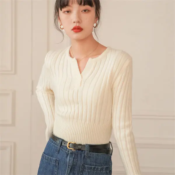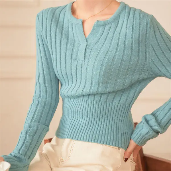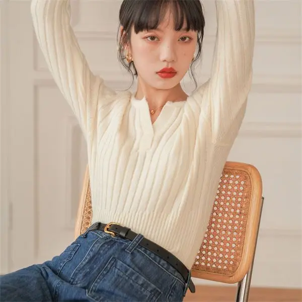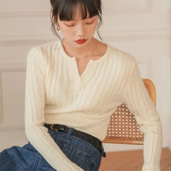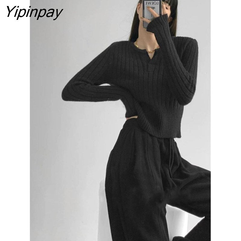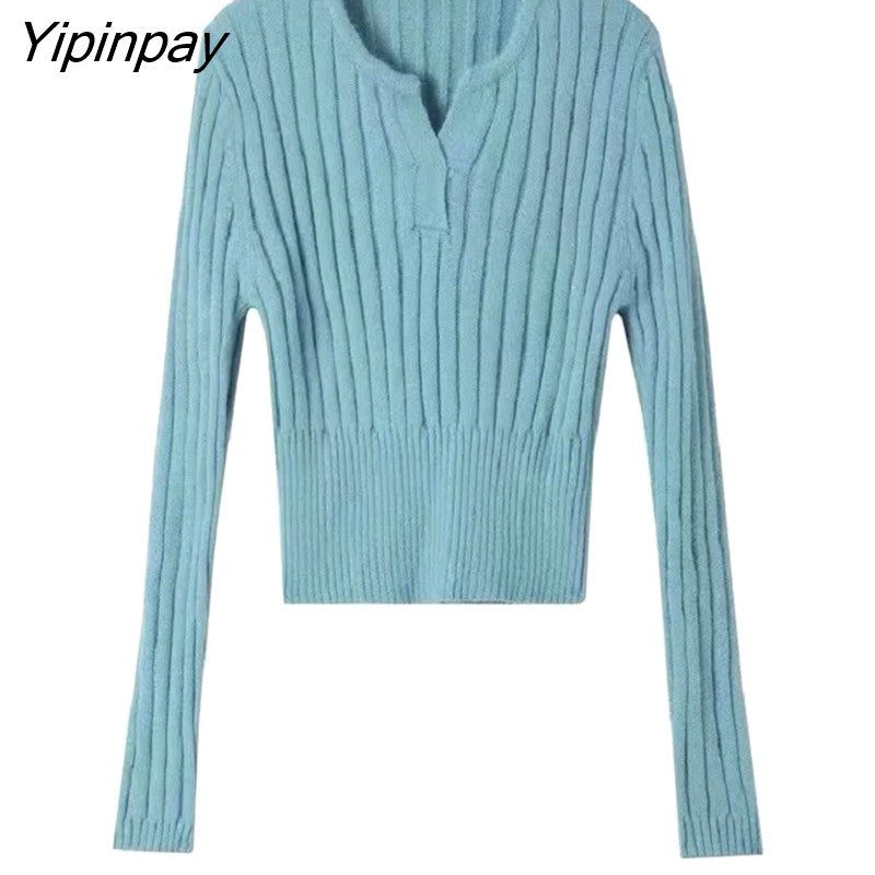 Yipinpay 2023 Winter Korean Style Long Sleeve V Neck Sweater Women Minimalist Slim Crop Tops Ladies Knit Pullovers Female Clothing