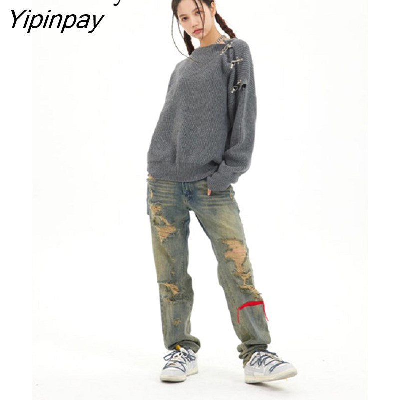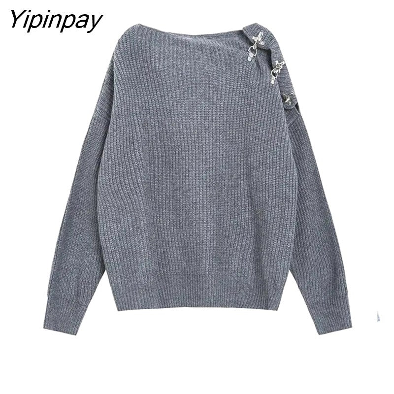 Yipinpay 2023 Winter Streetwear Long Sleeve Sweater Women Metal Buttons Oversize O Neck Ladies Pullover Female Clothing Tops