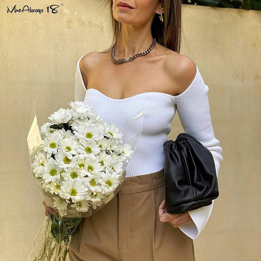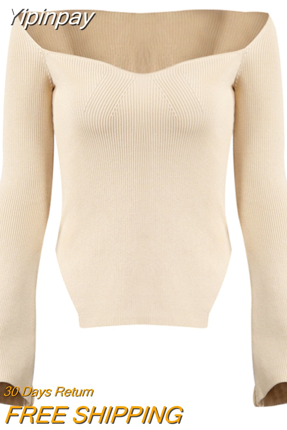Yipinpay Asymmetrical White Knitted Blouse Women Sexy Long Sleeve Bodycon Blouse Black Ladies Basic Knitwear Tops Fashion