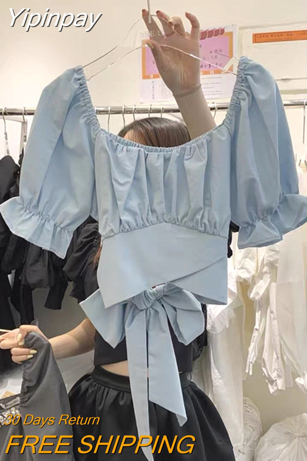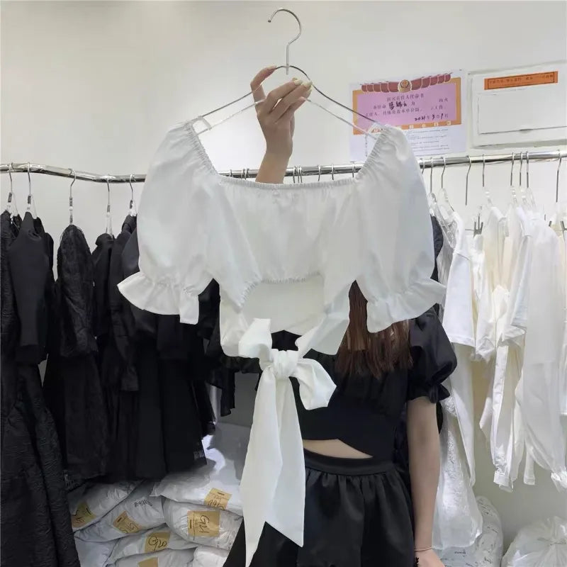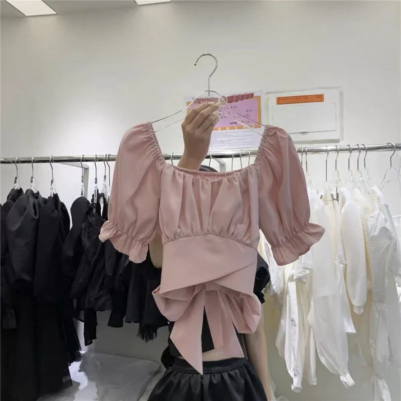 Yipinpay Bandage Crop Top Femme Pink Doll Blouse Blusas Mujer De Moda 2023 Bow Backless Black White Ruffle Pleated Shirt Women