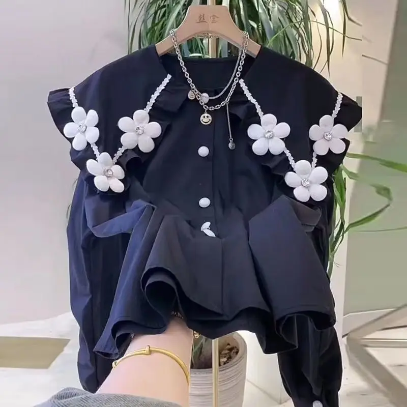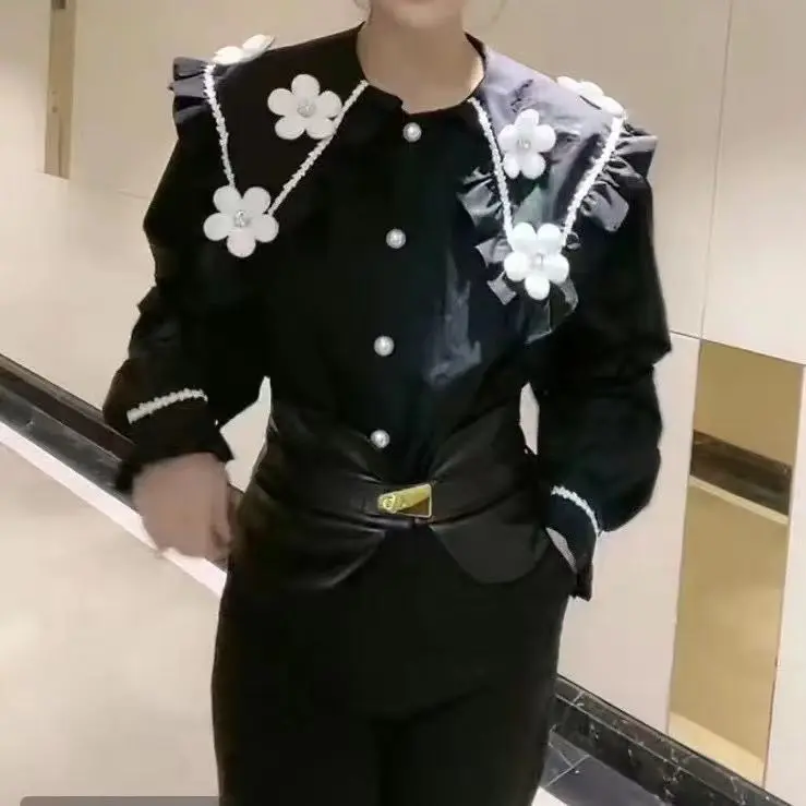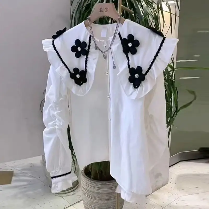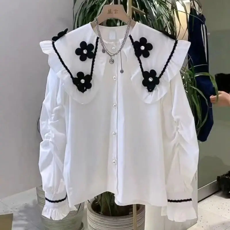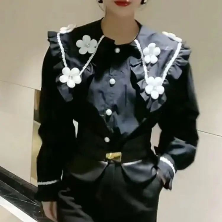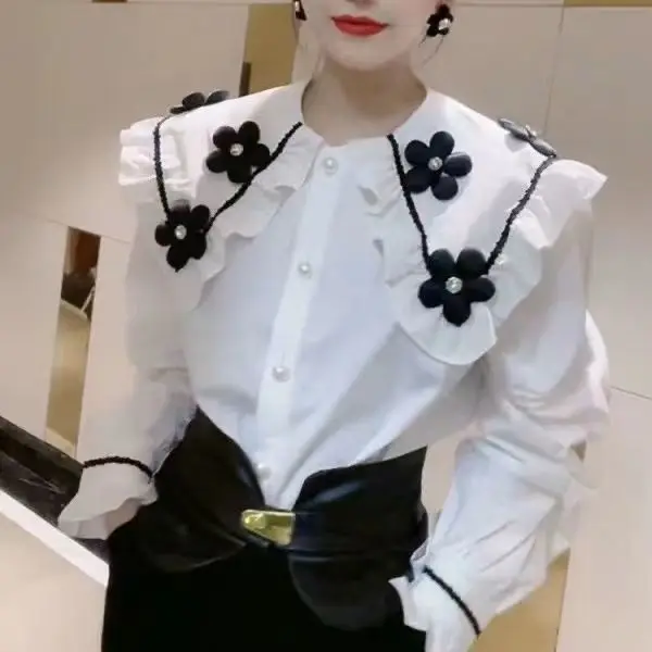 Yipinpay Beaded 3D Flower White Shirt Long Sleeve doll Shirt Top Casual Black Blouse Chemise Femme 2023 Fall Camisas Blusas Mujer