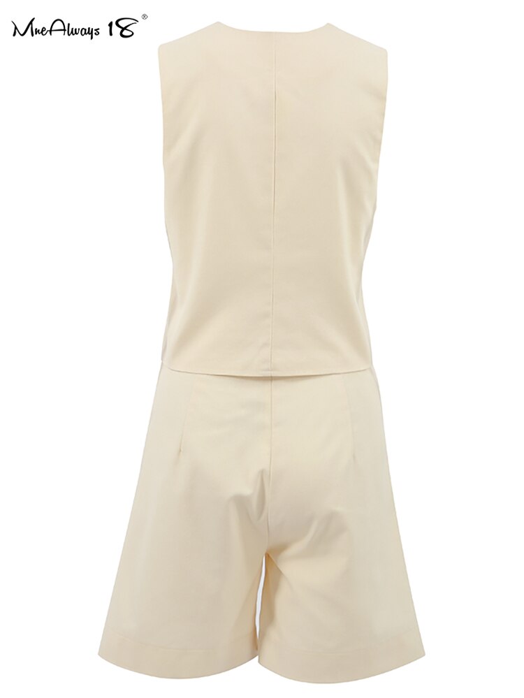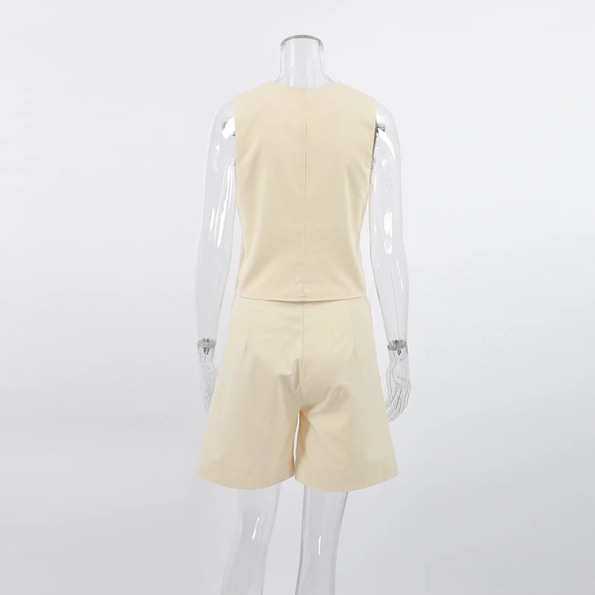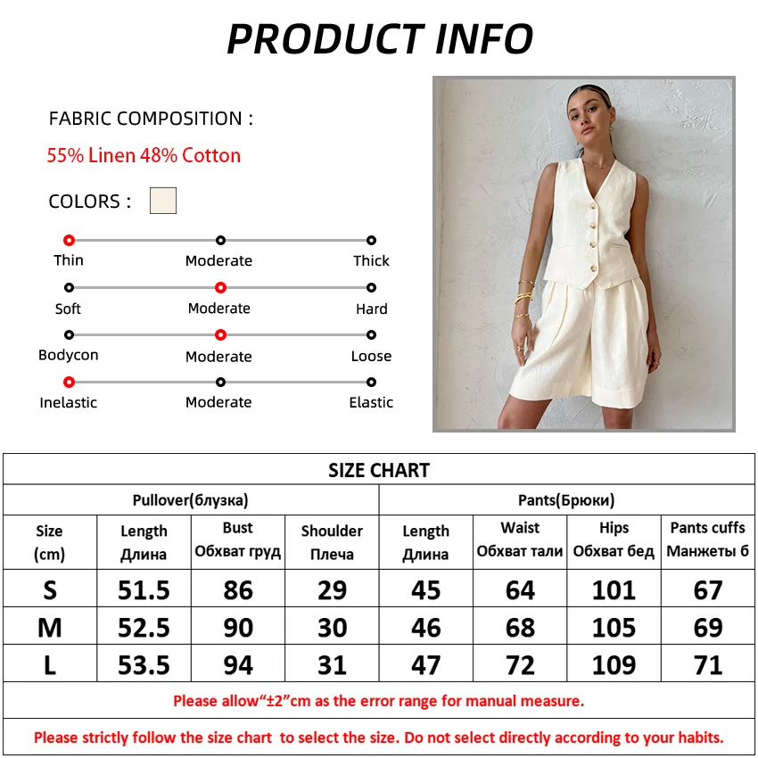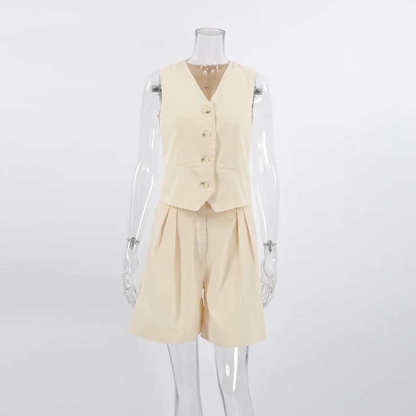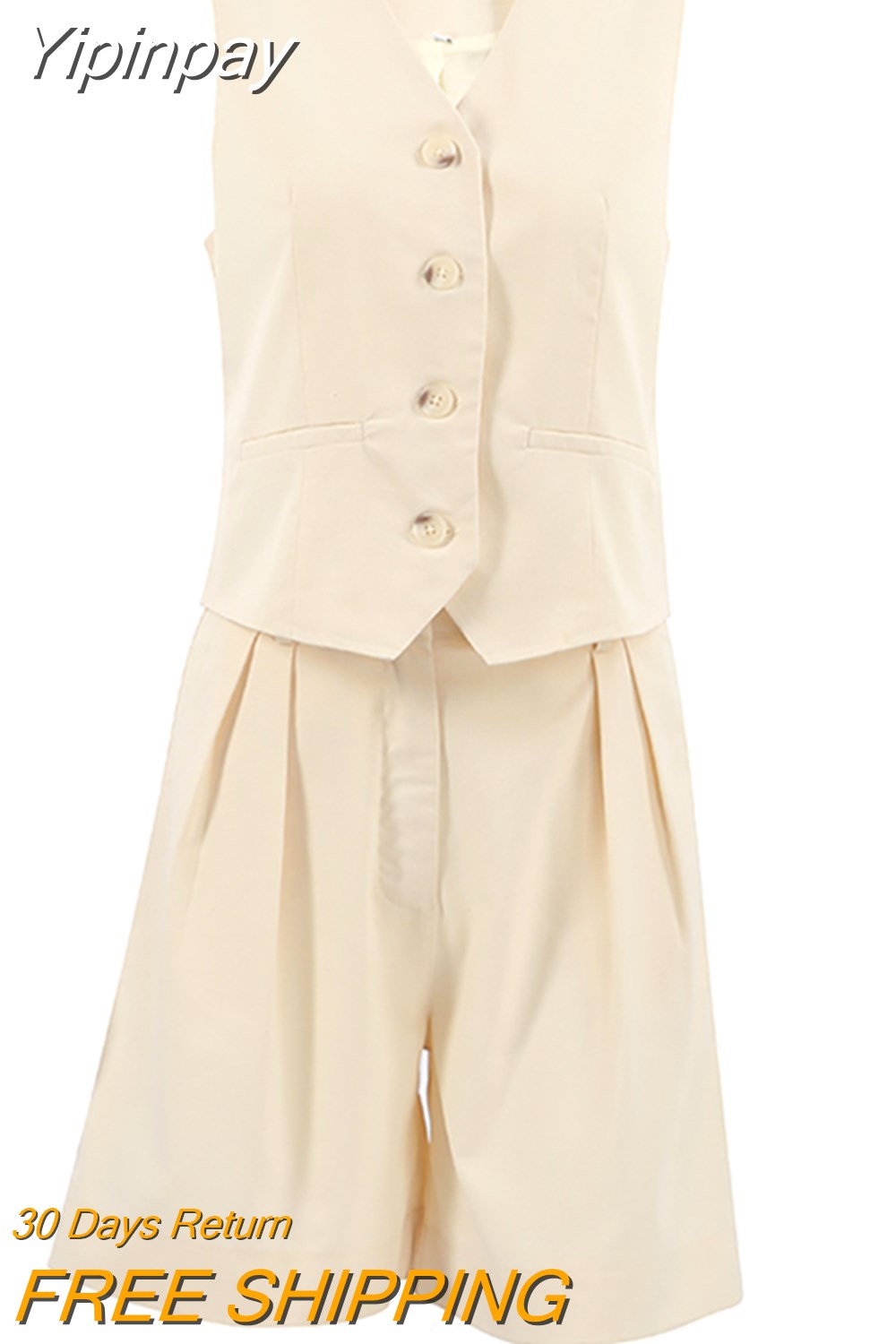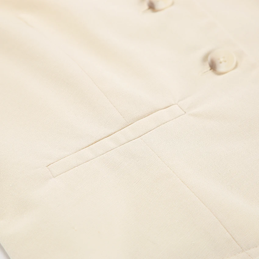 Yipinpay Beige Cotton Linen Blazer Suits 2-Piece Office Outfits Button Tank Tops And Wide Legs Shorts Casual Sets Summer 2023