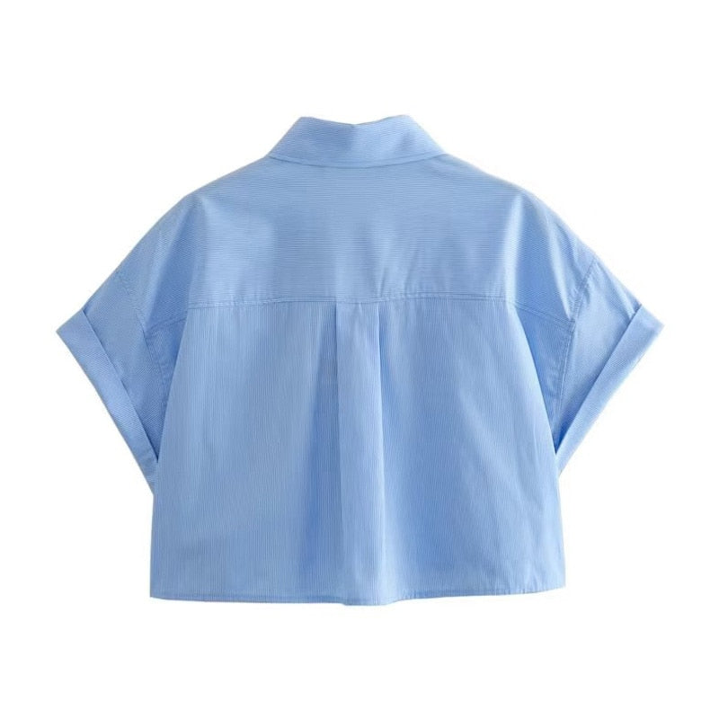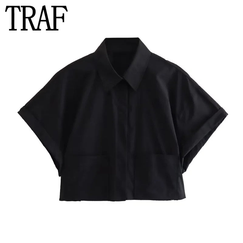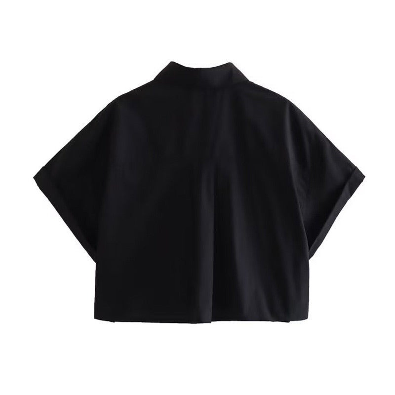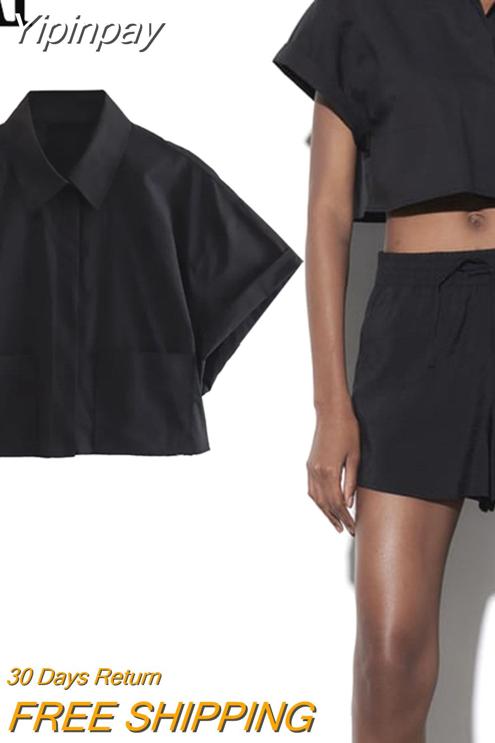 Yipinpay Black Crop Top Women Short Sleeve Cropped Shirt Woman Fashion Loose Summer Blouses For Women 2023 Collared Button Up Shirt