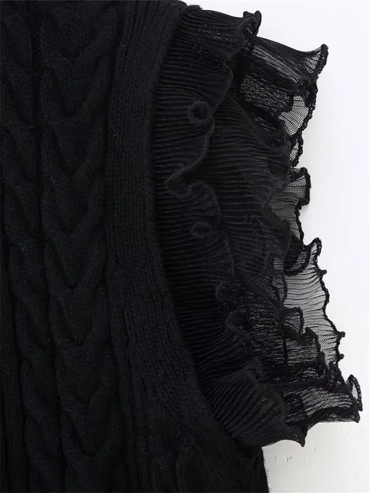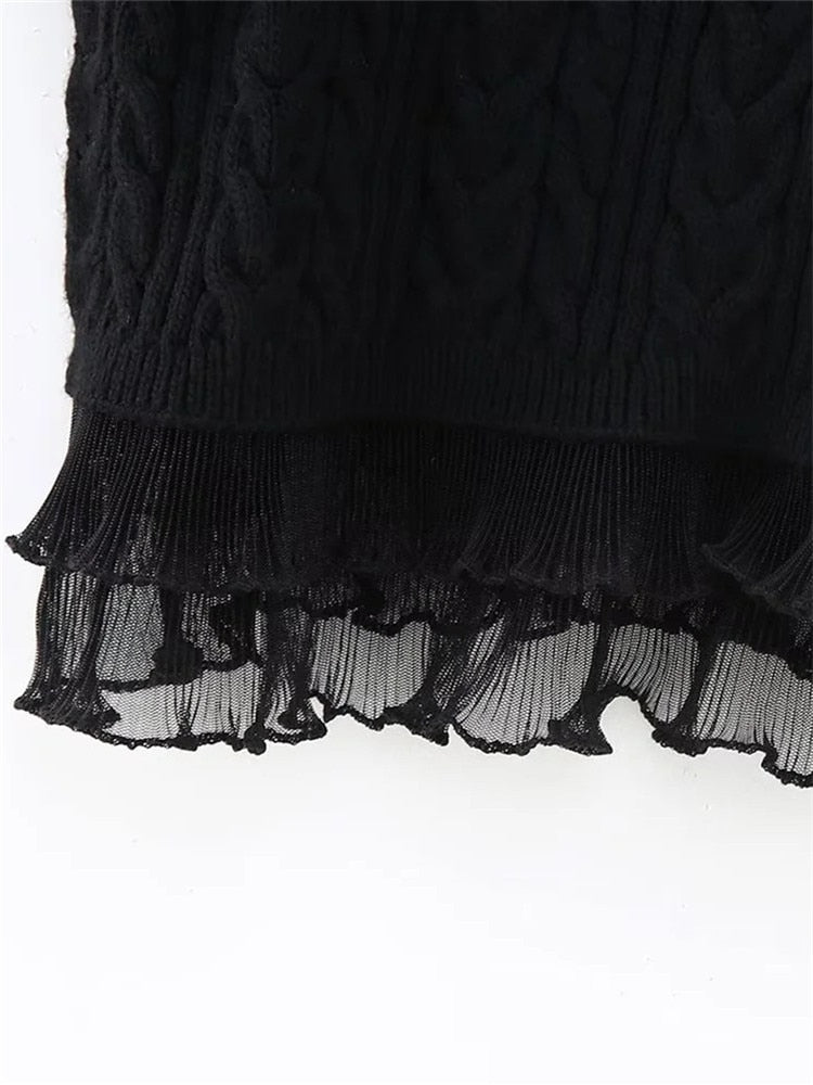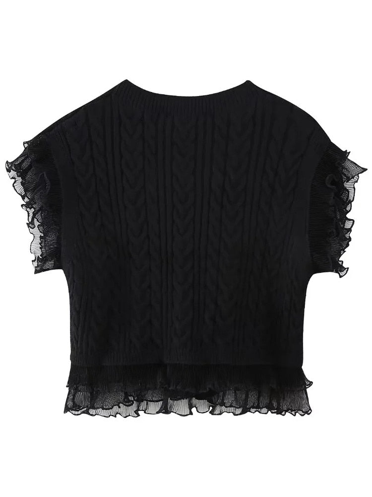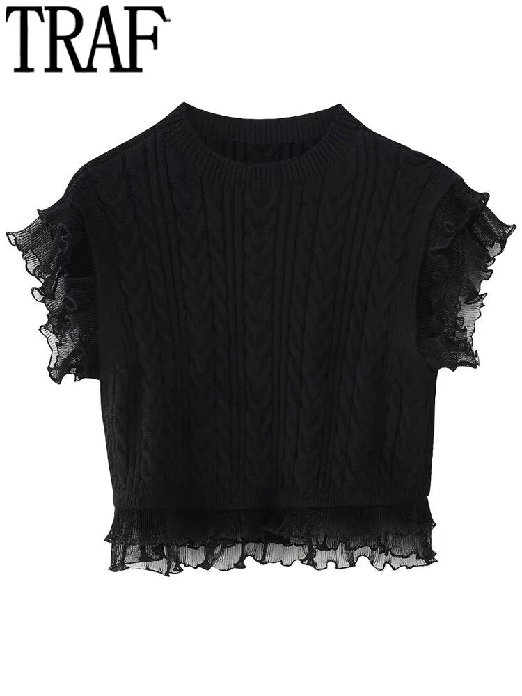 Yipinpay Black Knitted Vest Women Ruffle Women's Sleeveless Sweater Cropped Sweaters Women Winter 2023 Knit Top O-Neck Pullovers