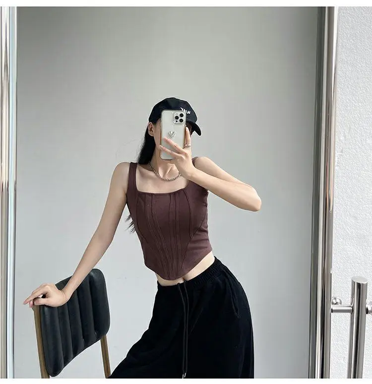 Yipinpay Bright Line Decoration Corset Tops Women Summer New Slim Square Neck Sleeveless Irregular Crop Top Outwear