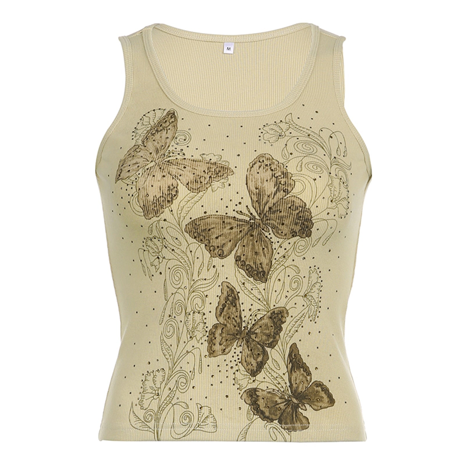 Yipinpay Butterfly Tank Tops Rhinestone Vintage Skin Knitted Mini Vest Women O Neck Sleeveless Cute Harajuku Sweats Chic