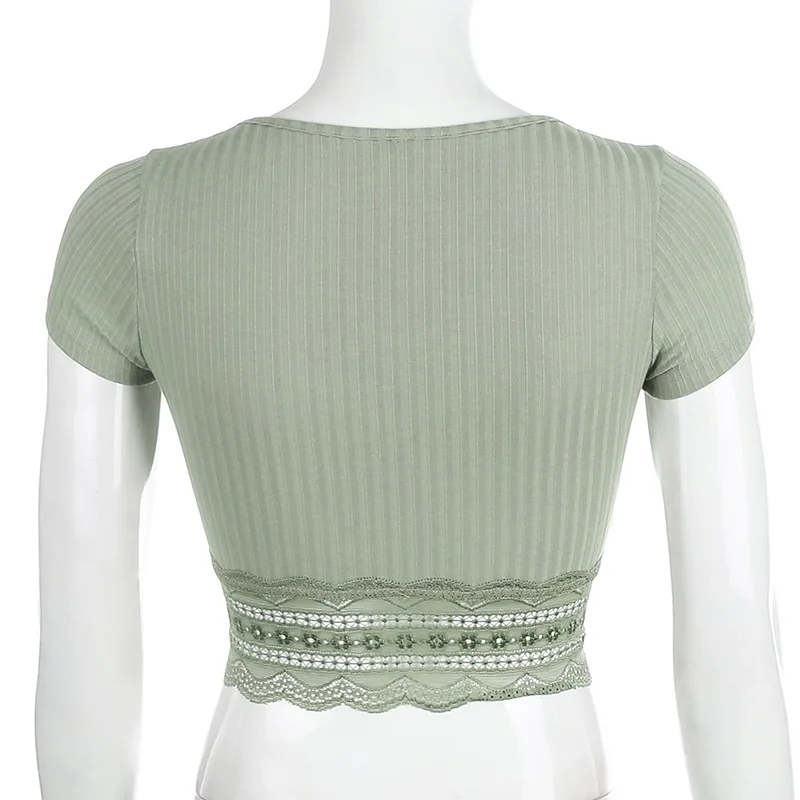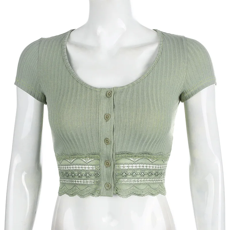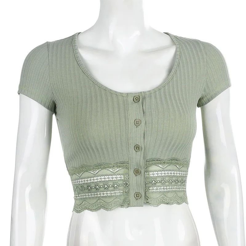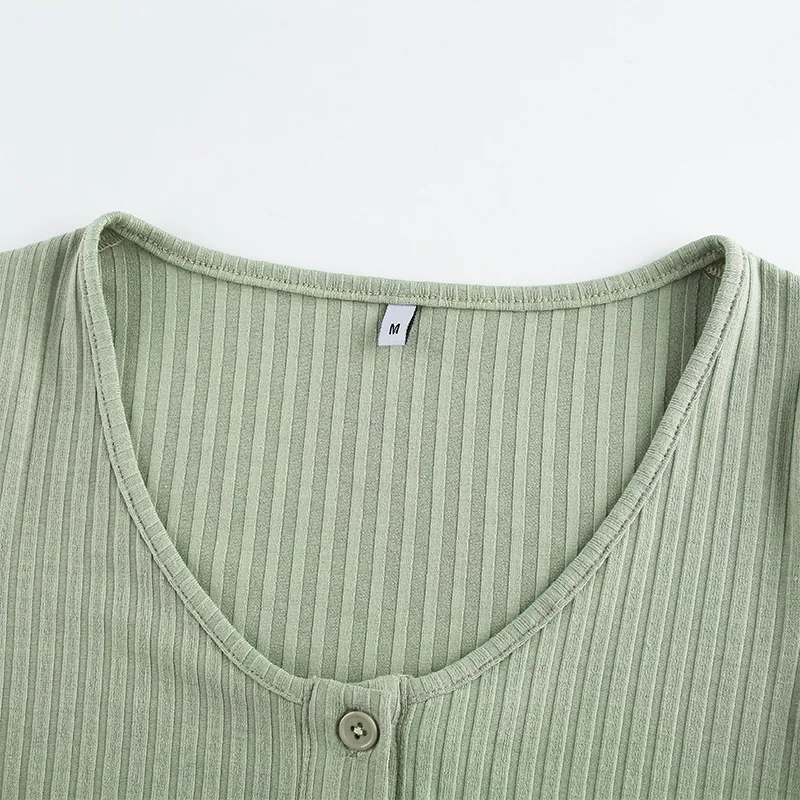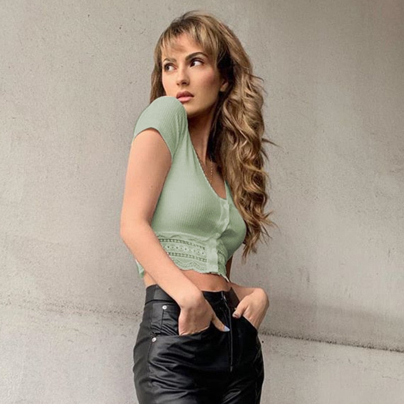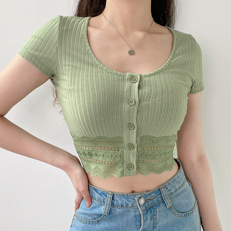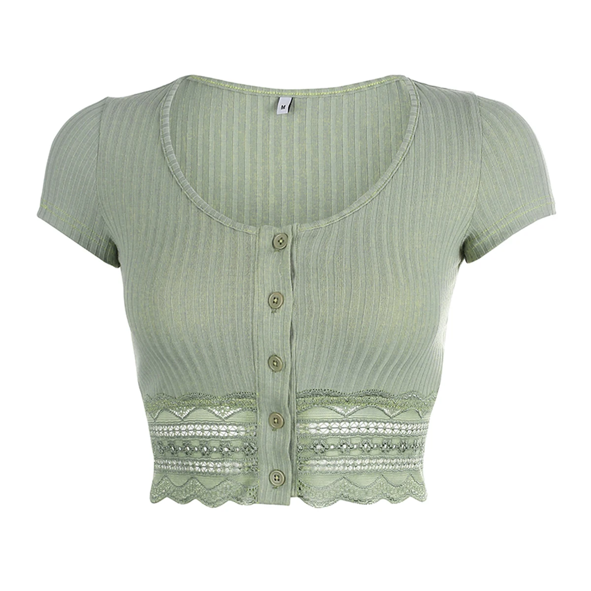 Yipinpay Button Sexy Crop Top Women Ribbed Knit Korean Style Short Sleeve T Shirts Fashion Casual Green Summer Tops Women Clothes