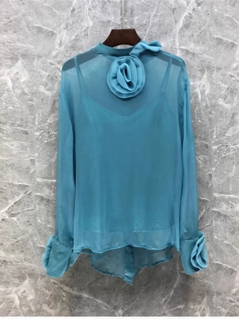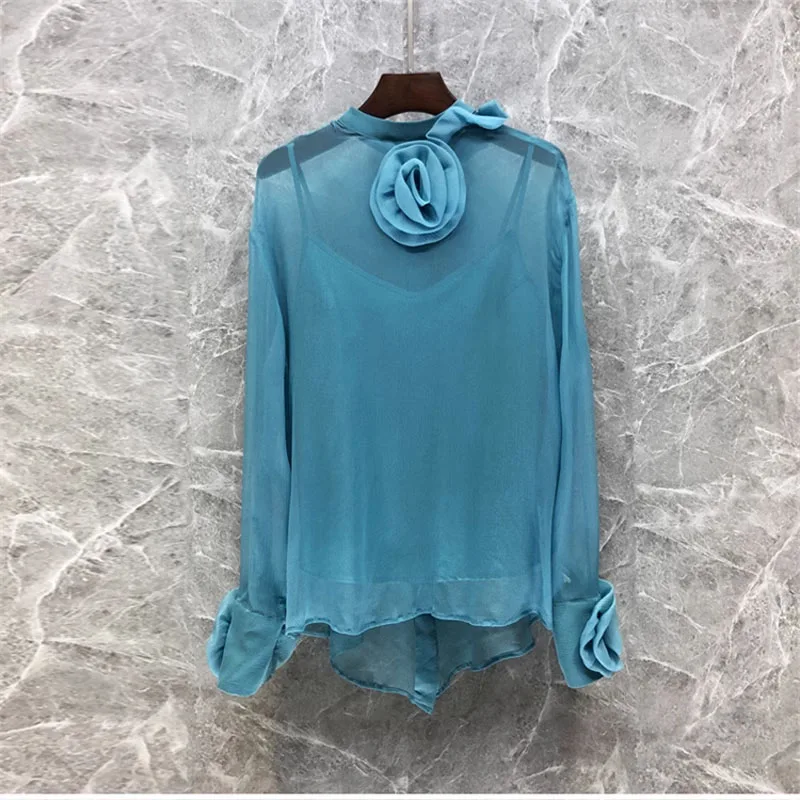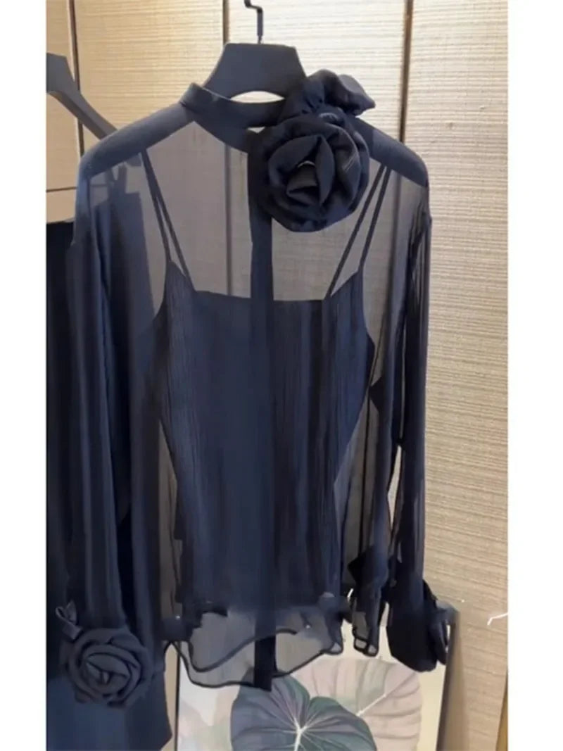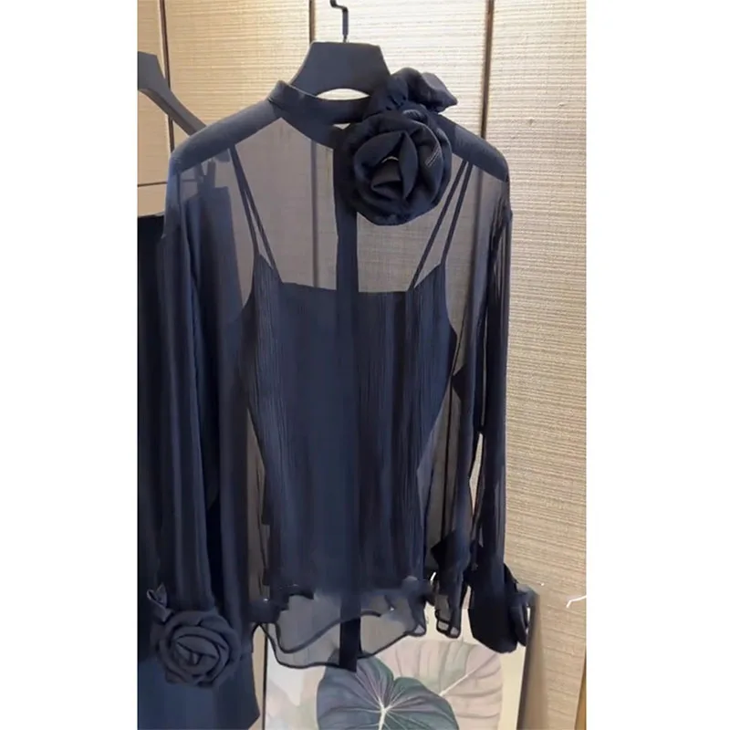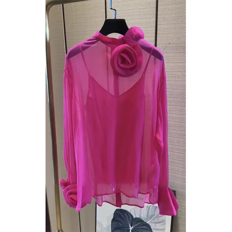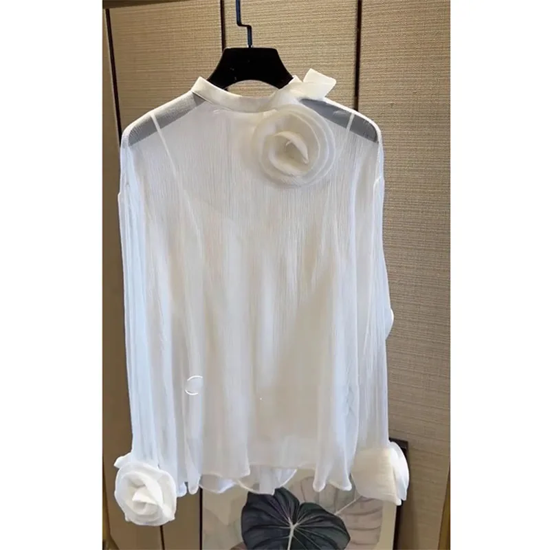 Yipinpay Button Shirts Top Temperament 3D Flower Sunscreen Shirt Transparent Blusas Mujer Thin 2023 Spring Blouses White Tops