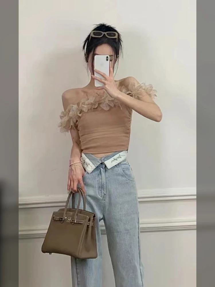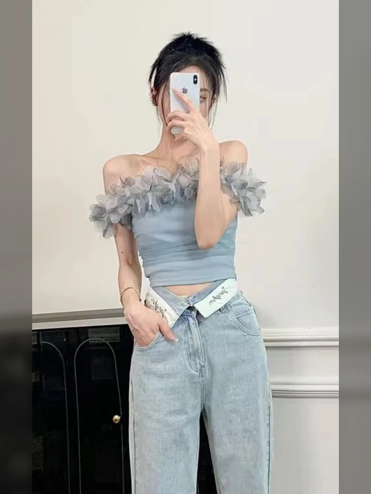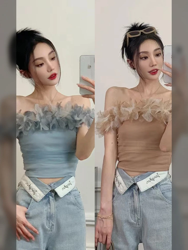 Yipinpay Camis Sexy Slim Blusas Mujer Blue Strapless Shirt Chemise Femme Tops Tees Slash Feather Blouses Korean Shirts for Women