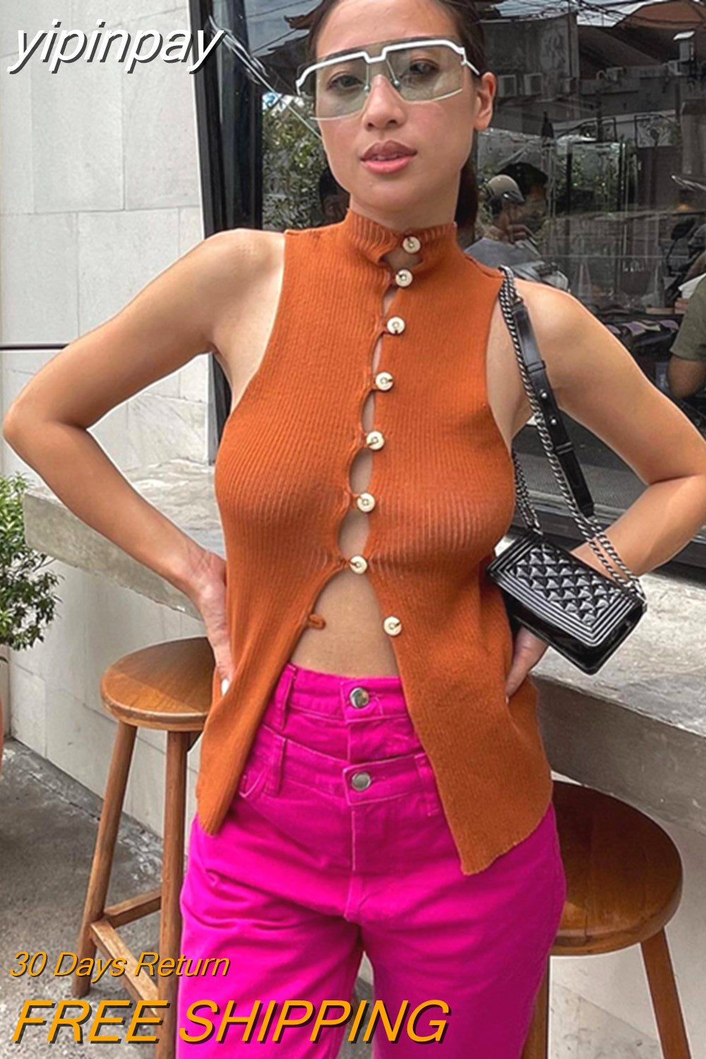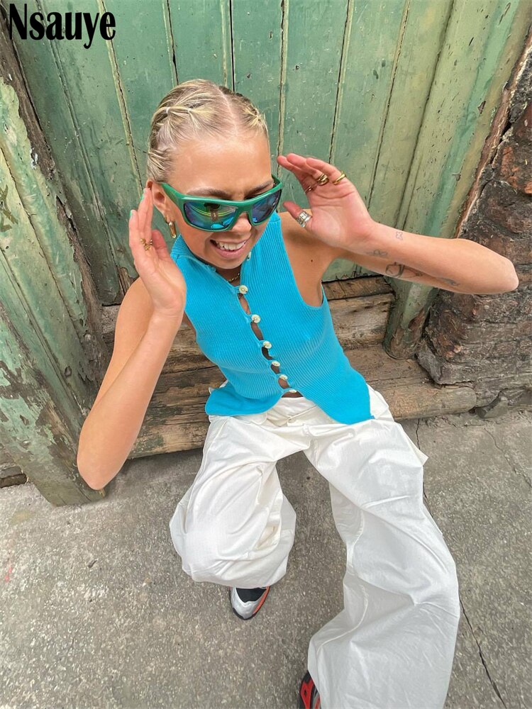yipinpay Casual Button Women Knitted Sweater Y2K Vest Cardigans Crop Tops 2023 Skinny Sleeveless Sexy V Neck Tank Top Club T Shirt