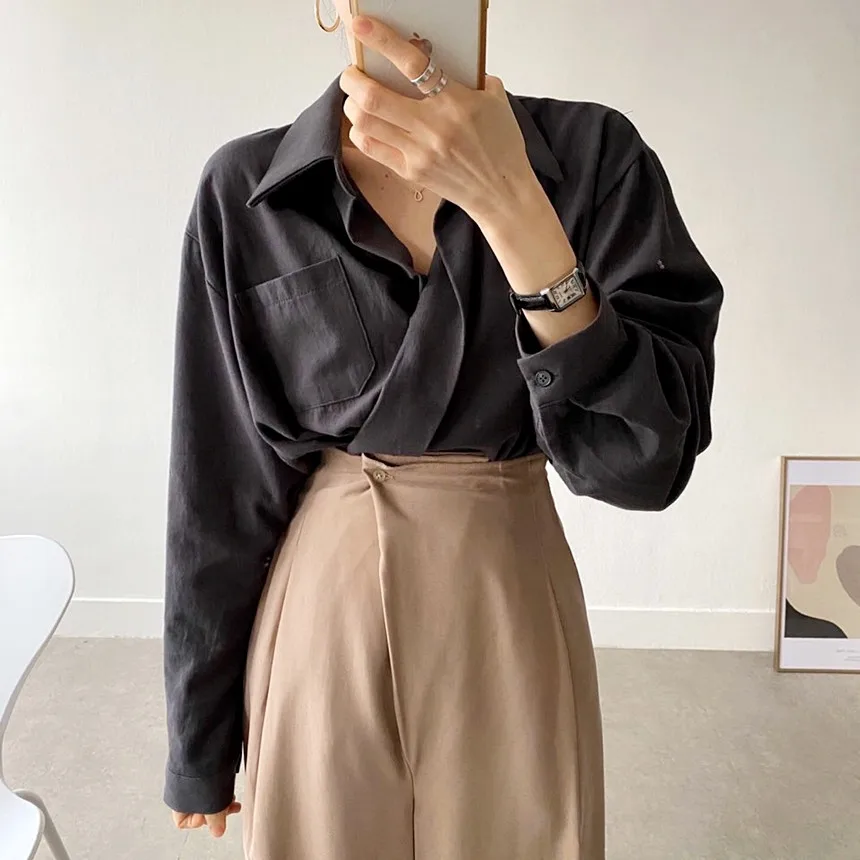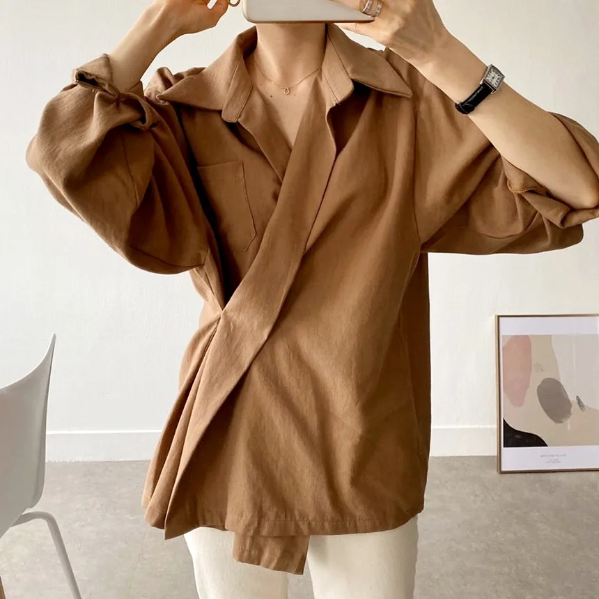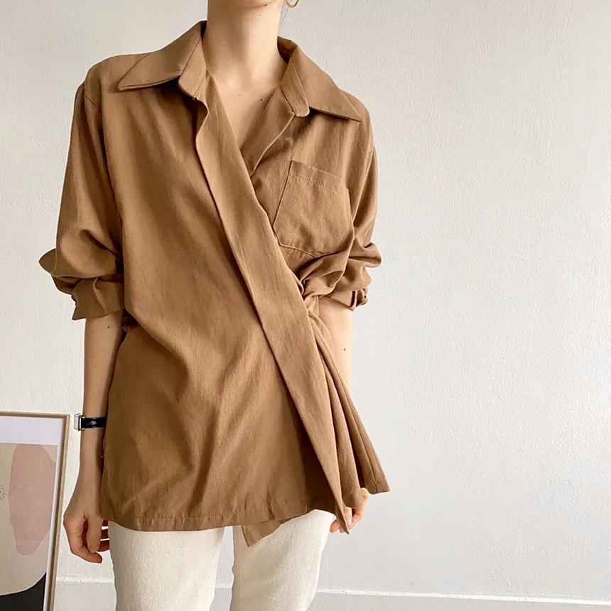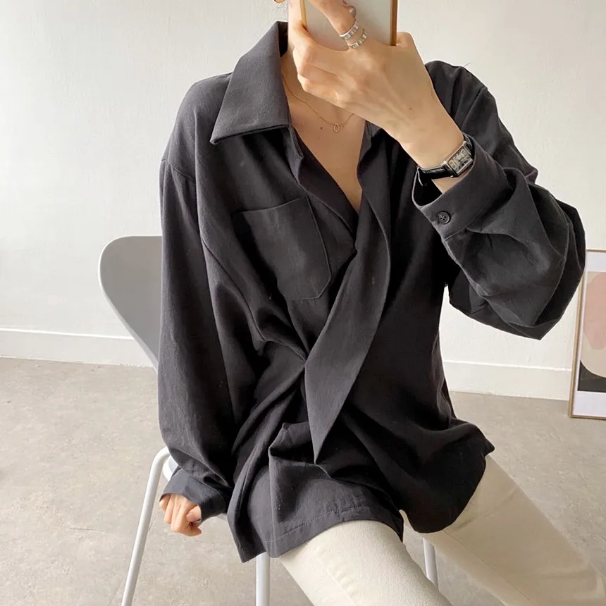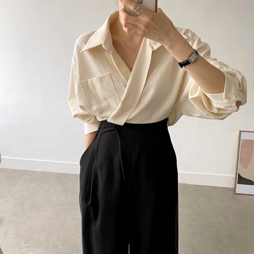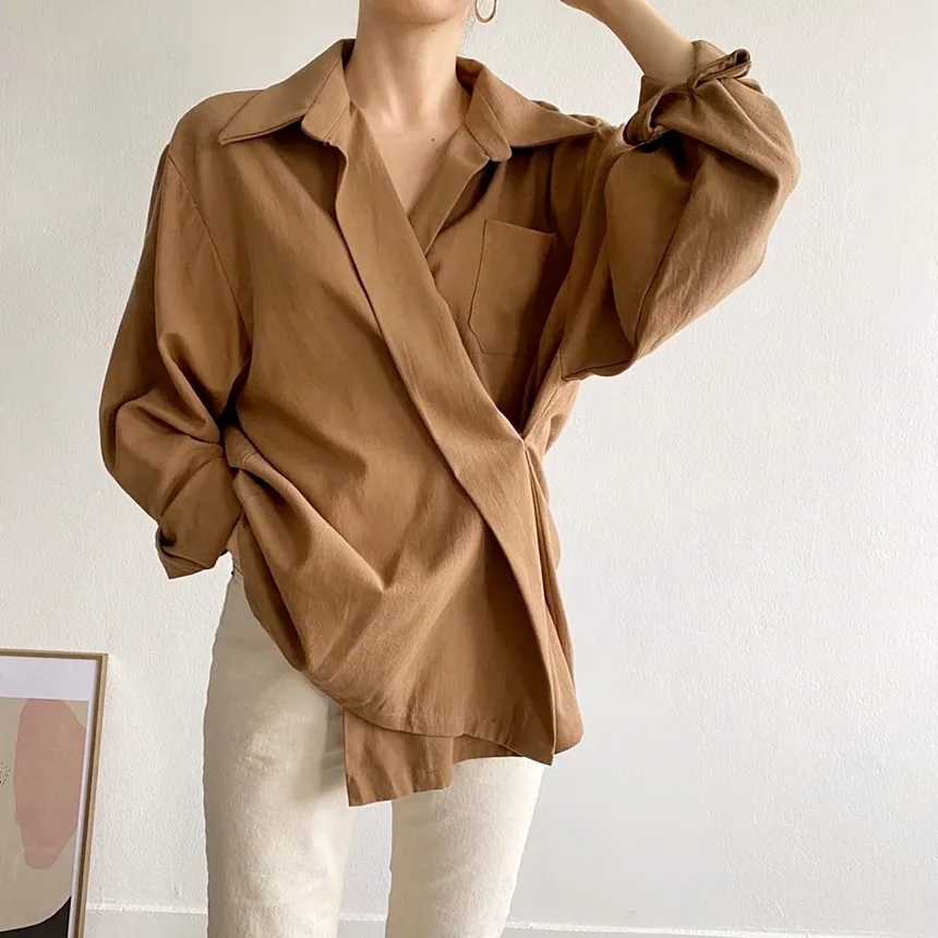 Yipinpay Chic Lapel Blouse Women Fashion Elegant Long Sleeve Shirts Office Ladies Spring Autumn New Cross Loose Tops