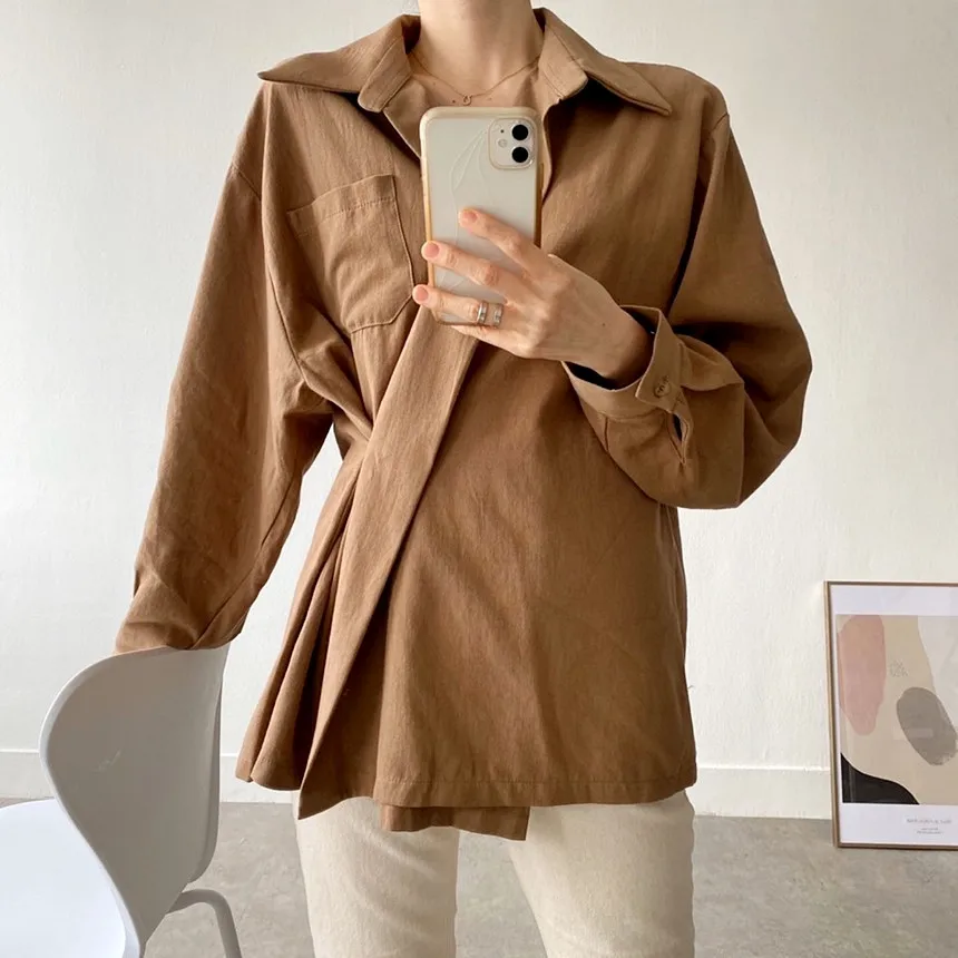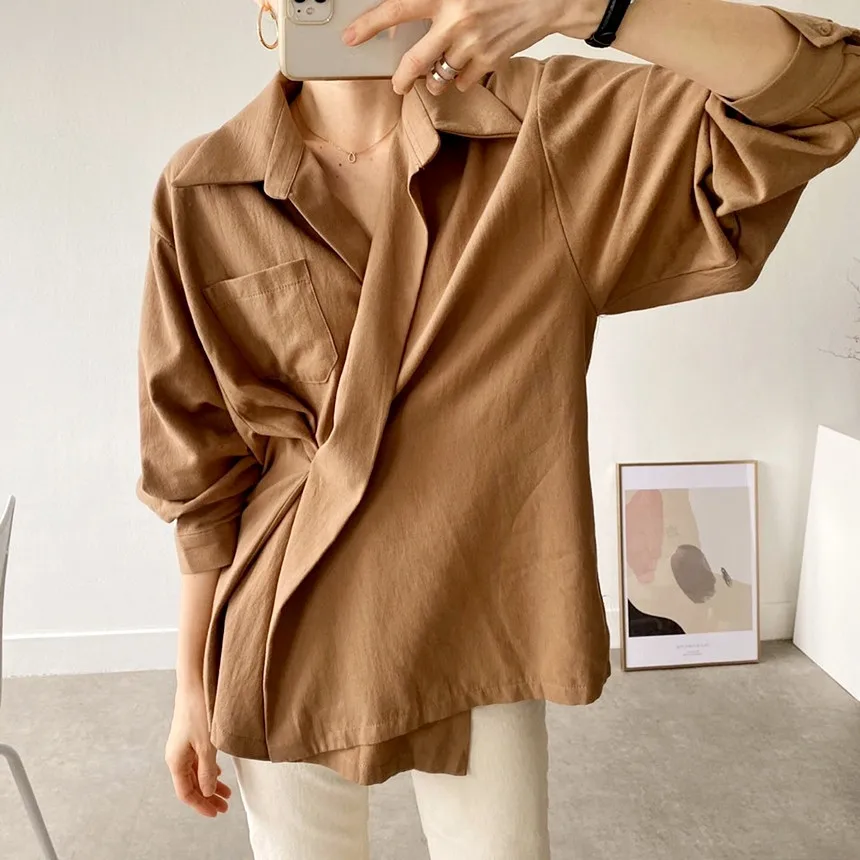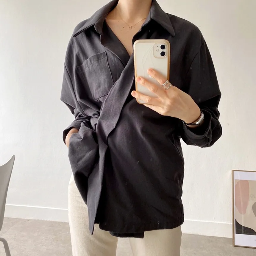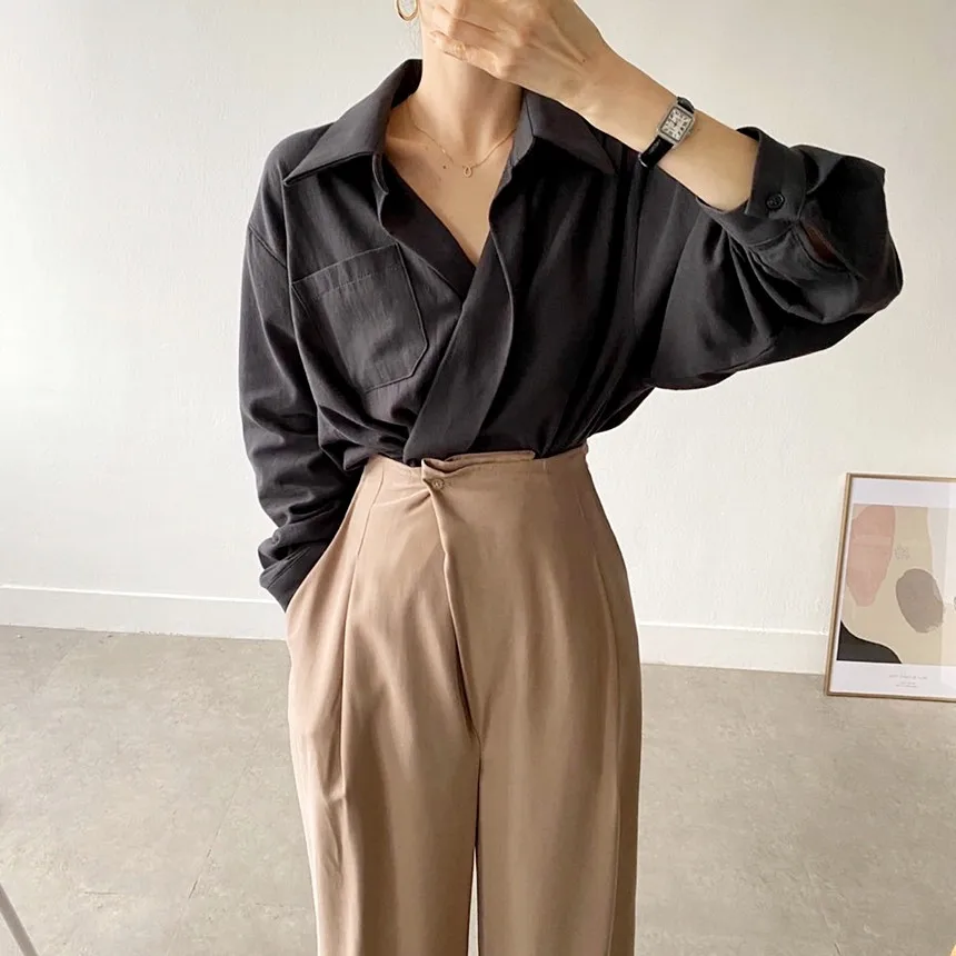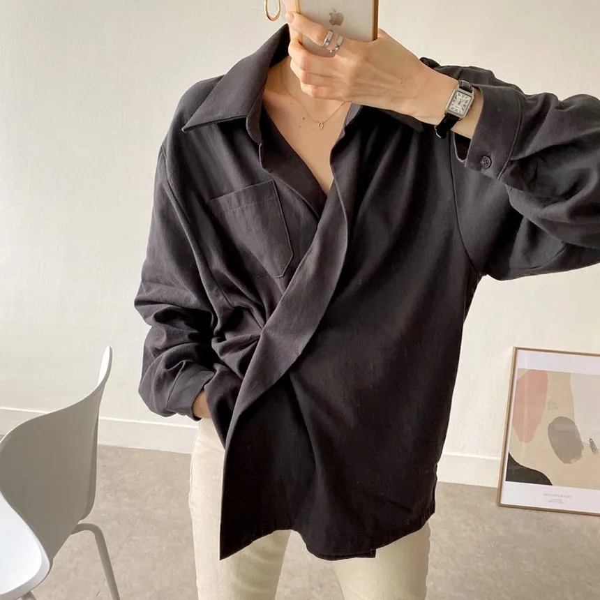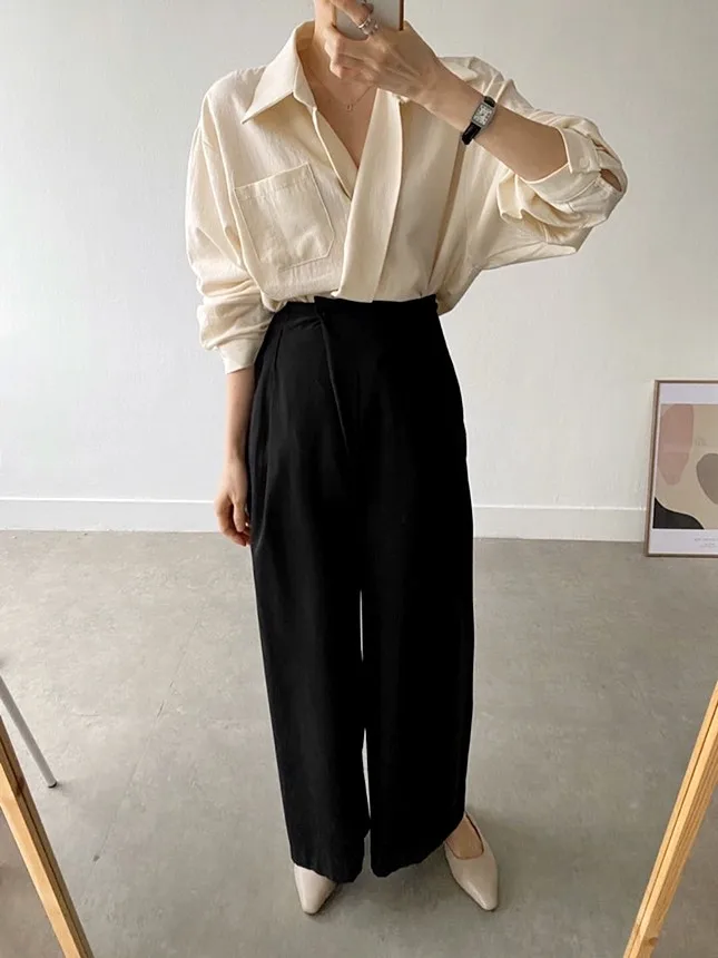 Yipinpay Chic Lapel Blouse Women Fashion Elegant Long Sleeve Shirts Office Ladies Spring Autumn New Cross Loose Tops
