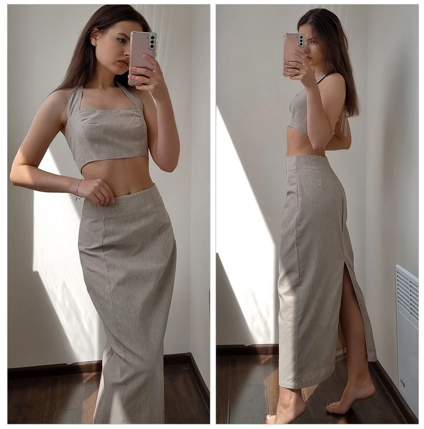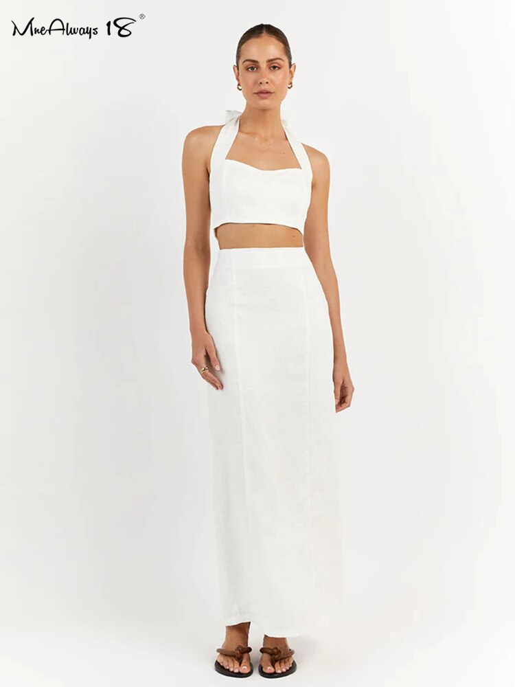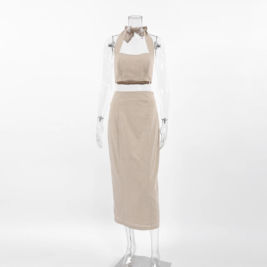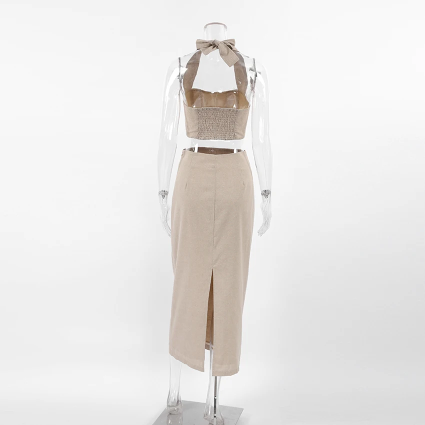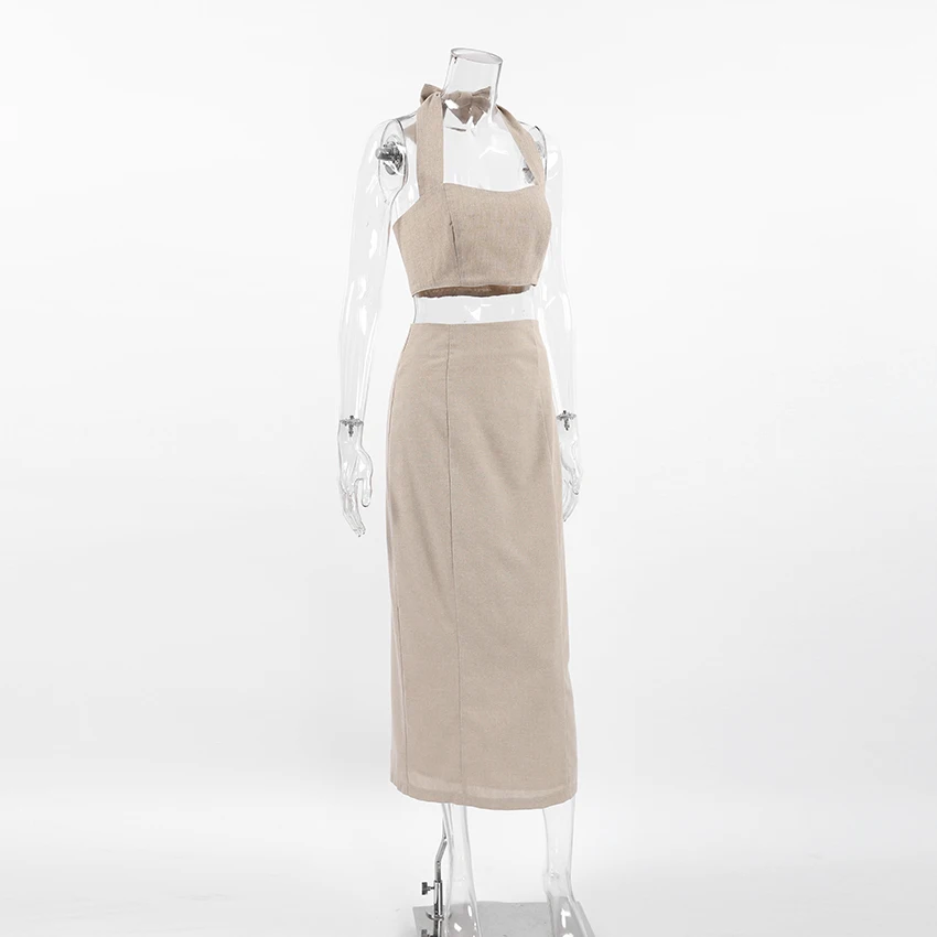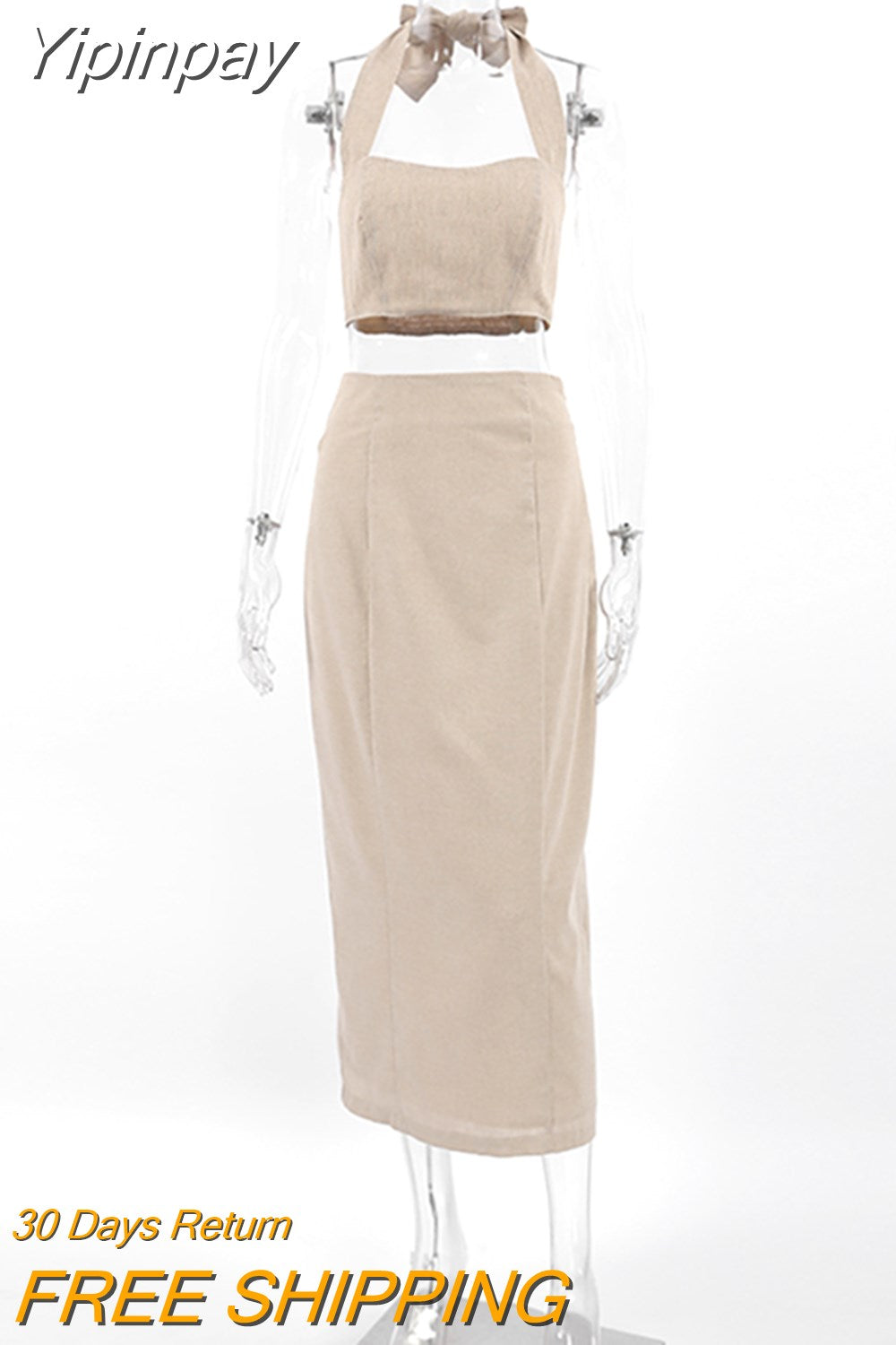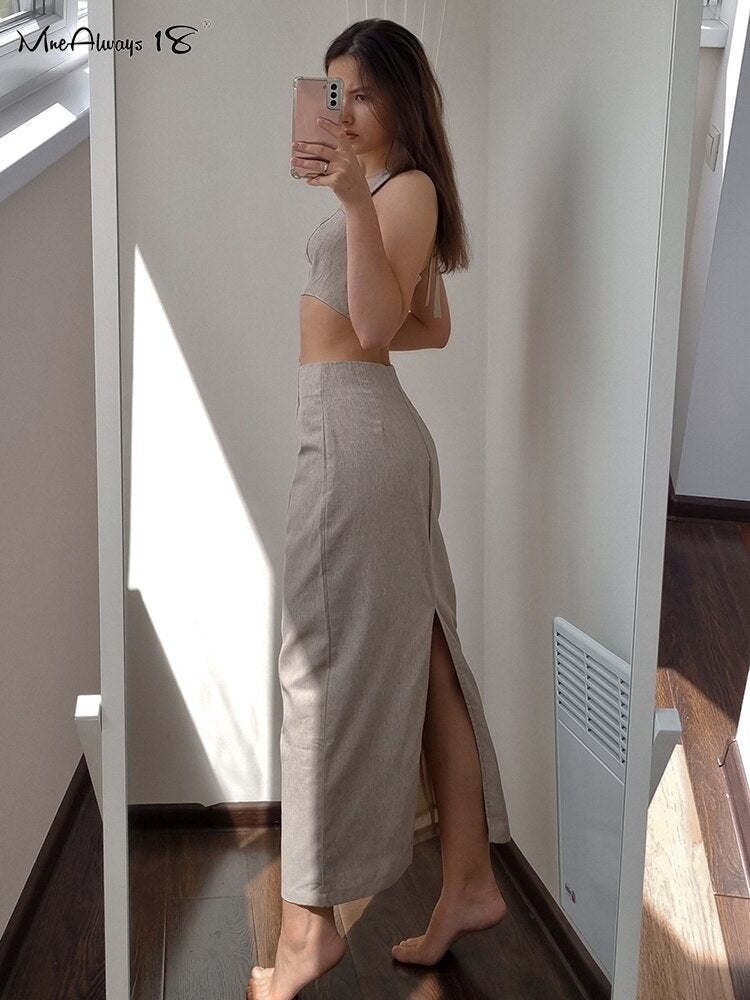 Yipinpay Elegant Cotton Linen Skirts Sets Vacation 2023 Bandage Top Women High Waist Split Skirts Summer 2-Piece Skirts Sets