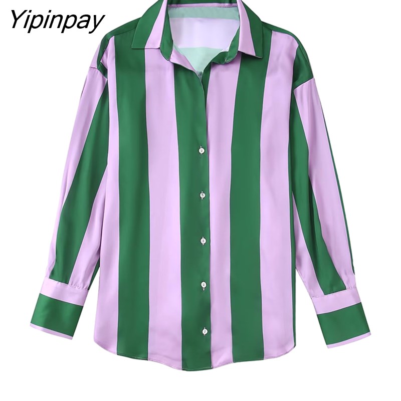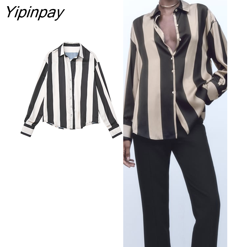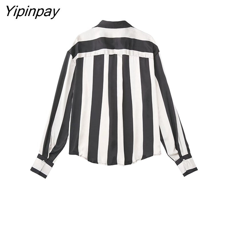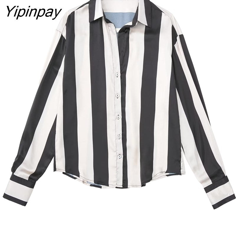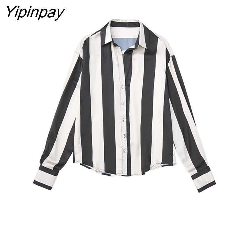 Yipinpay Fashion 2023 Autumn Women Striped Print Blouses Casual Loose Thin Tops Vintage Single Breasted Long Sleeve T-Shirts