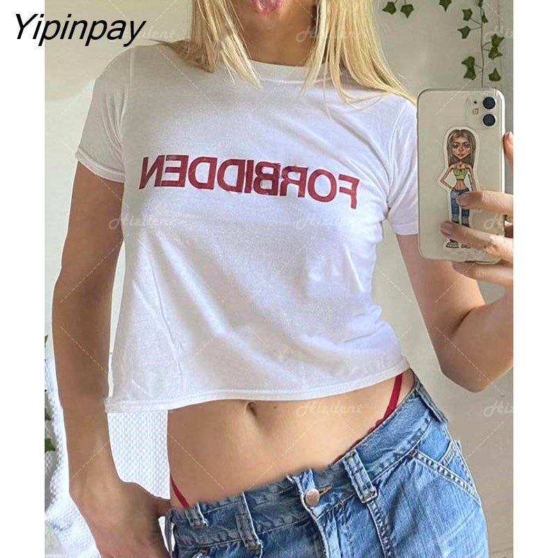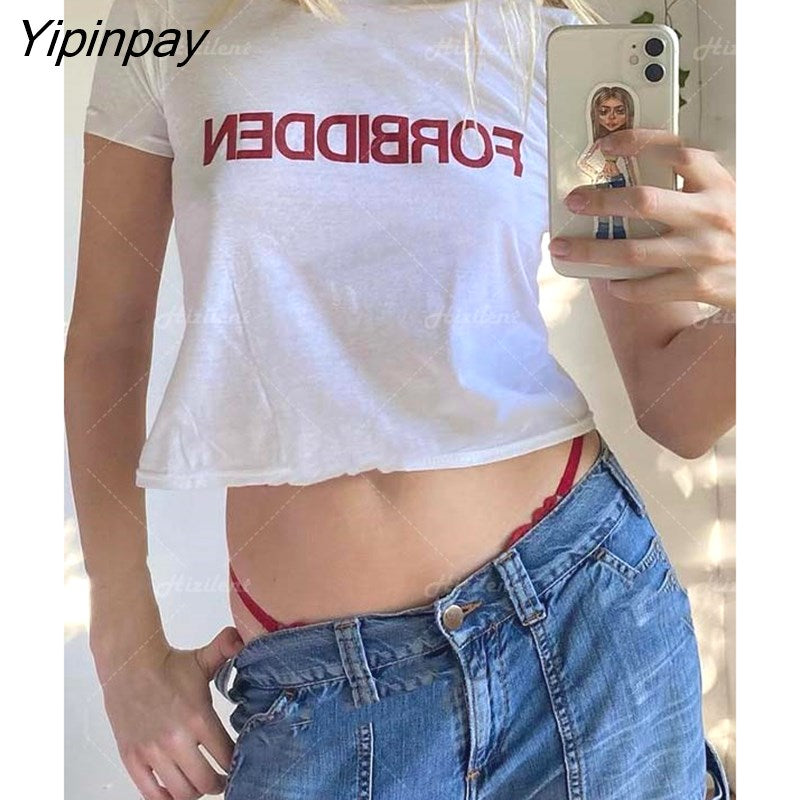 Yipinpay Fashion Letter 2000s Print fairy grunge Summer E-girl White 90s Crop Tops Slim Streetwear Harajuku Goth Short Sleeve T-shirt