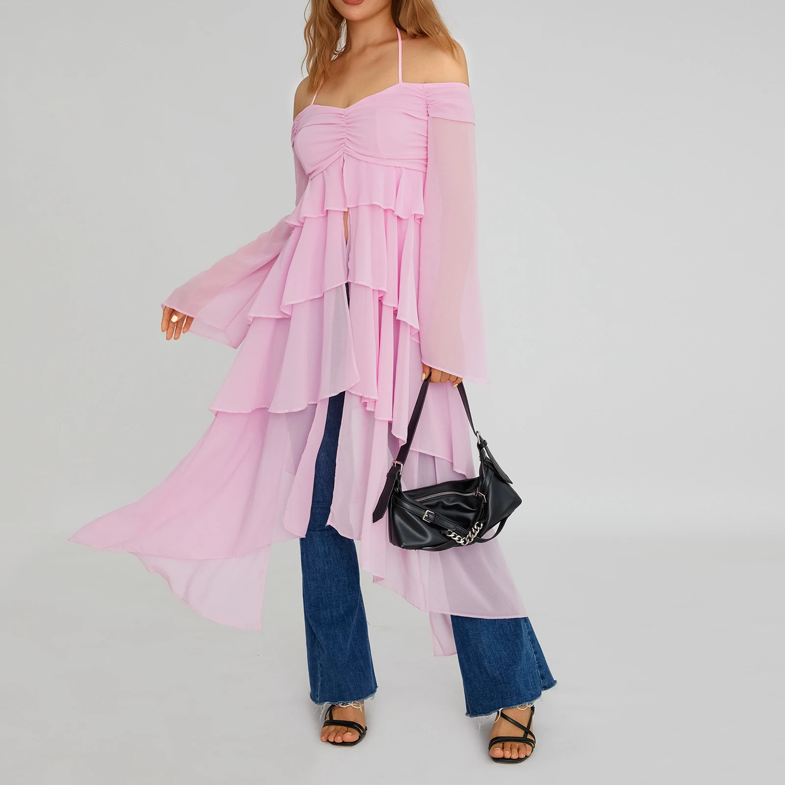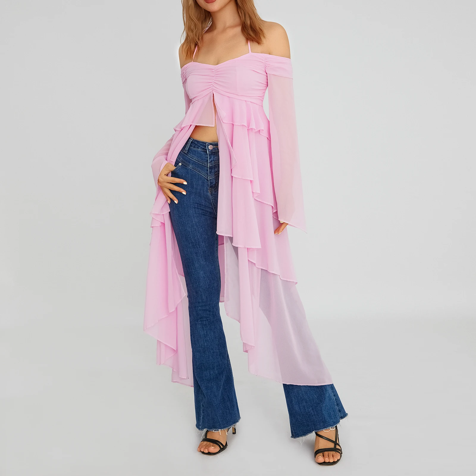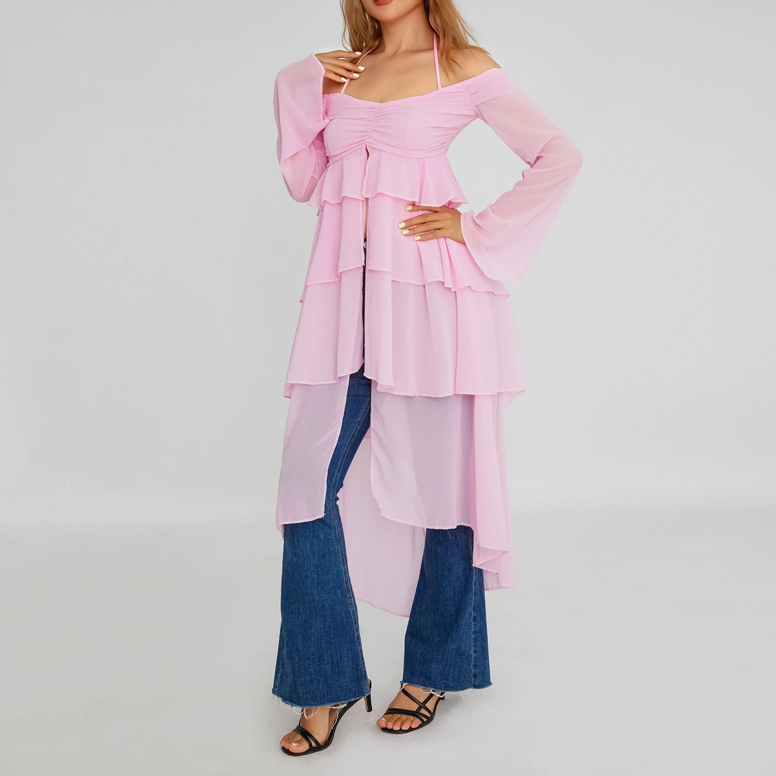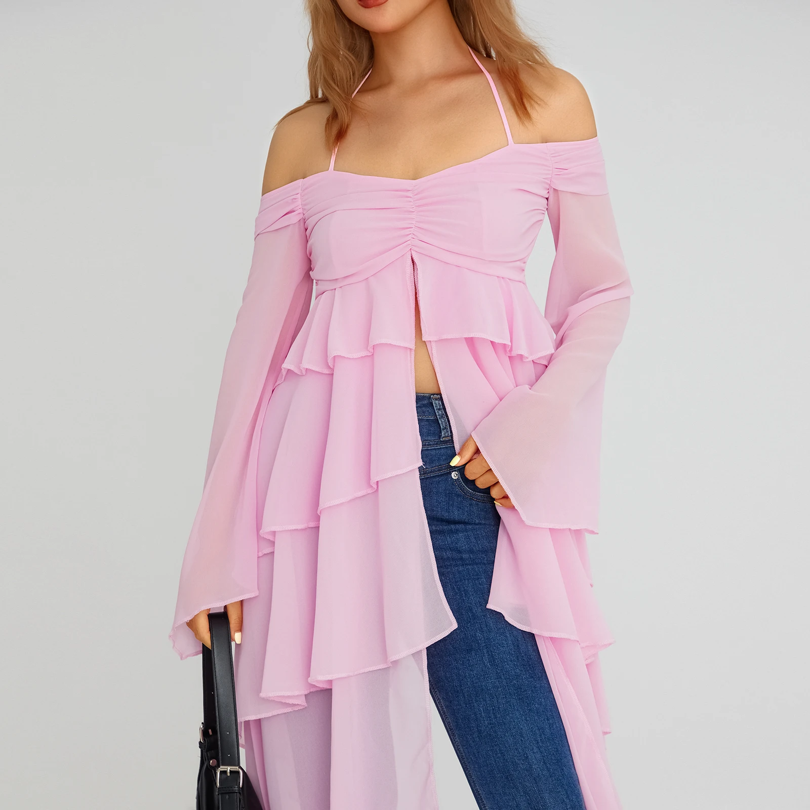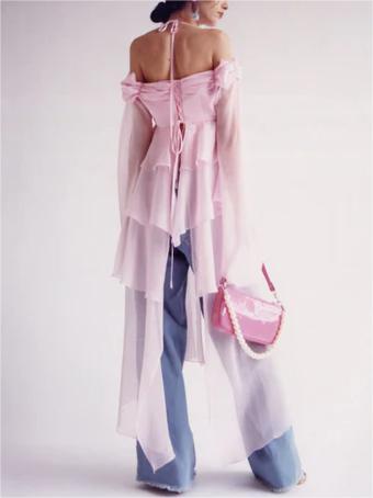 Yipinpay Fashion Women Spring Summer Slim Tops Pink Long Sleeve Hanging Neck Irregular Ruffle Blouse Skin Friendly Hot Sale S M L