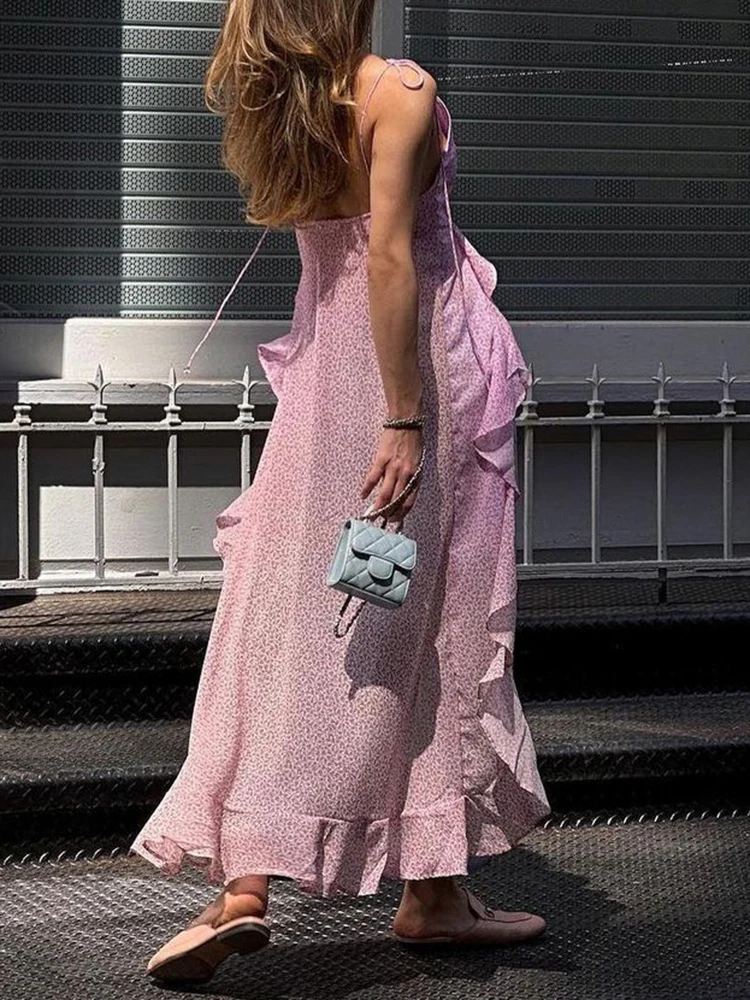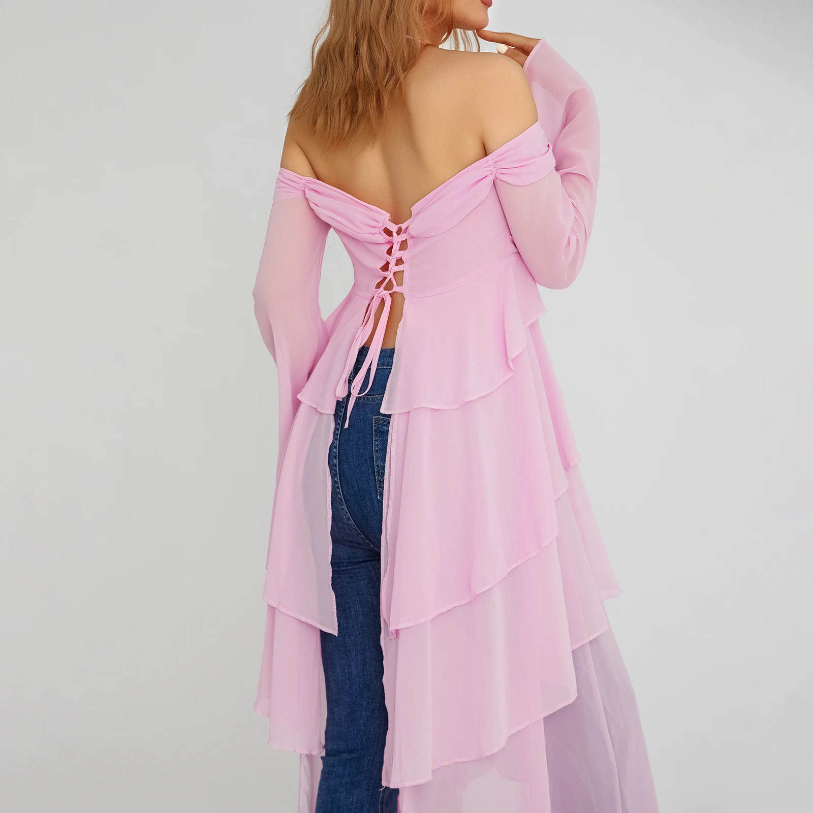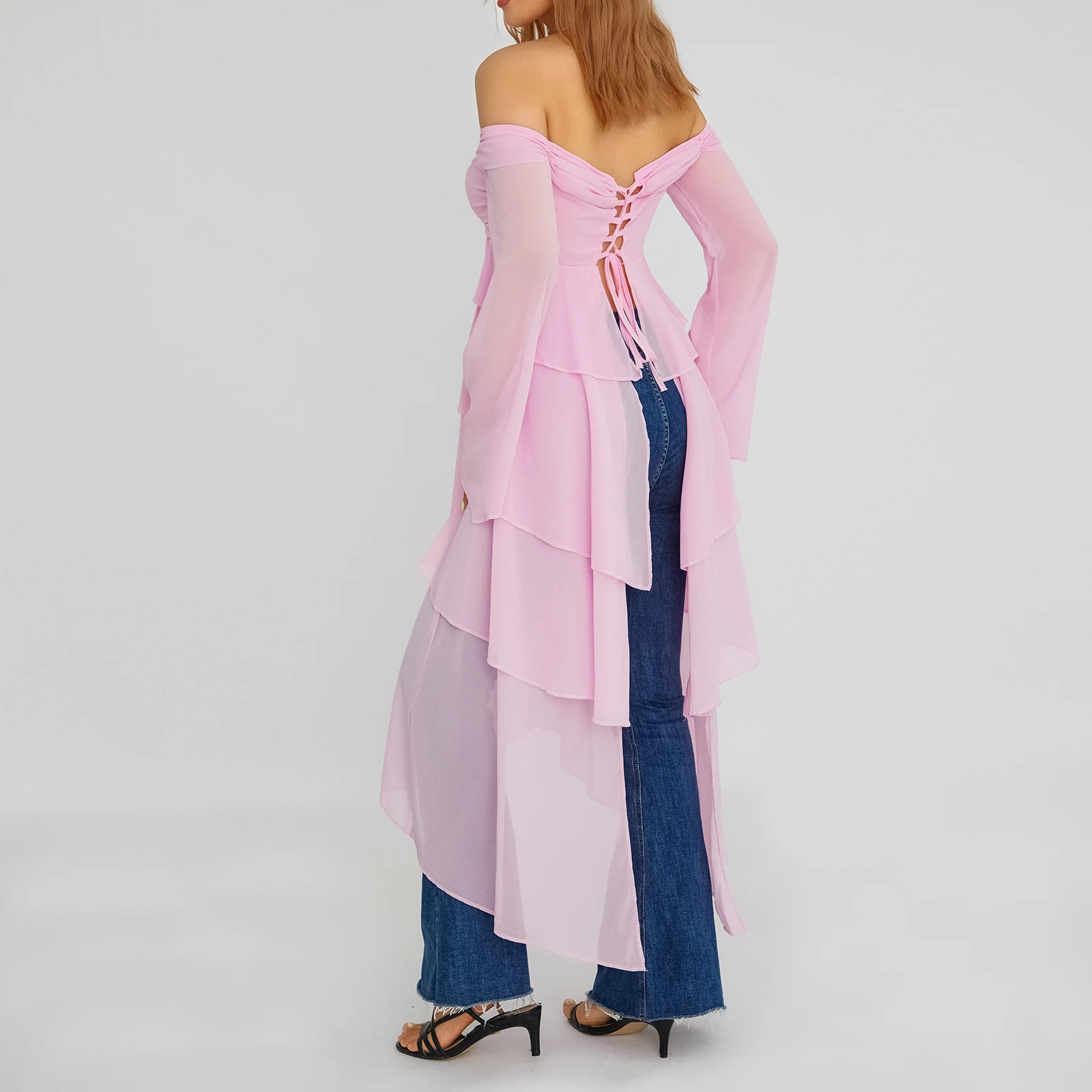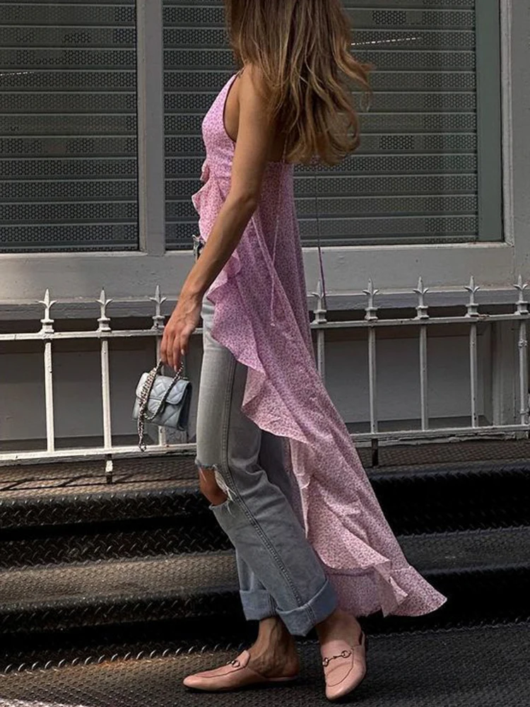 Yipinpay Fashion Women Spring Summer Slim Tops Pink Long Sleeve Hanging Neck Irregular Ruffle Blouse Skin Friendly Hot Sale S M L