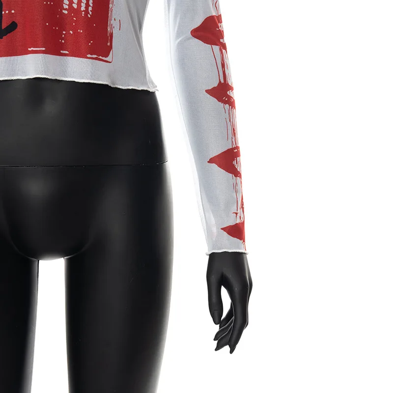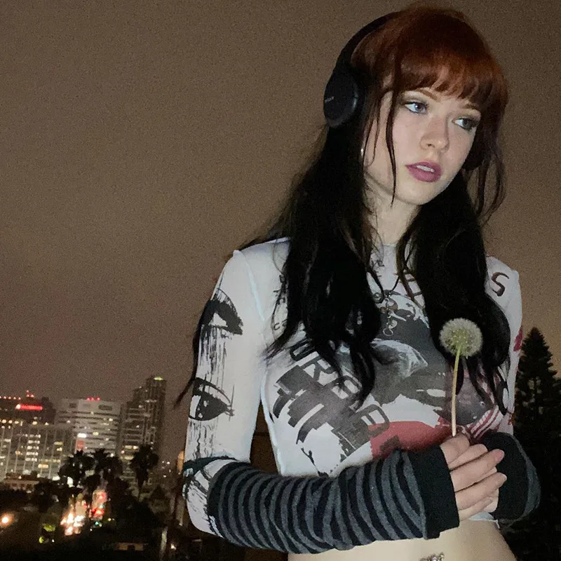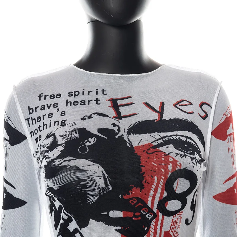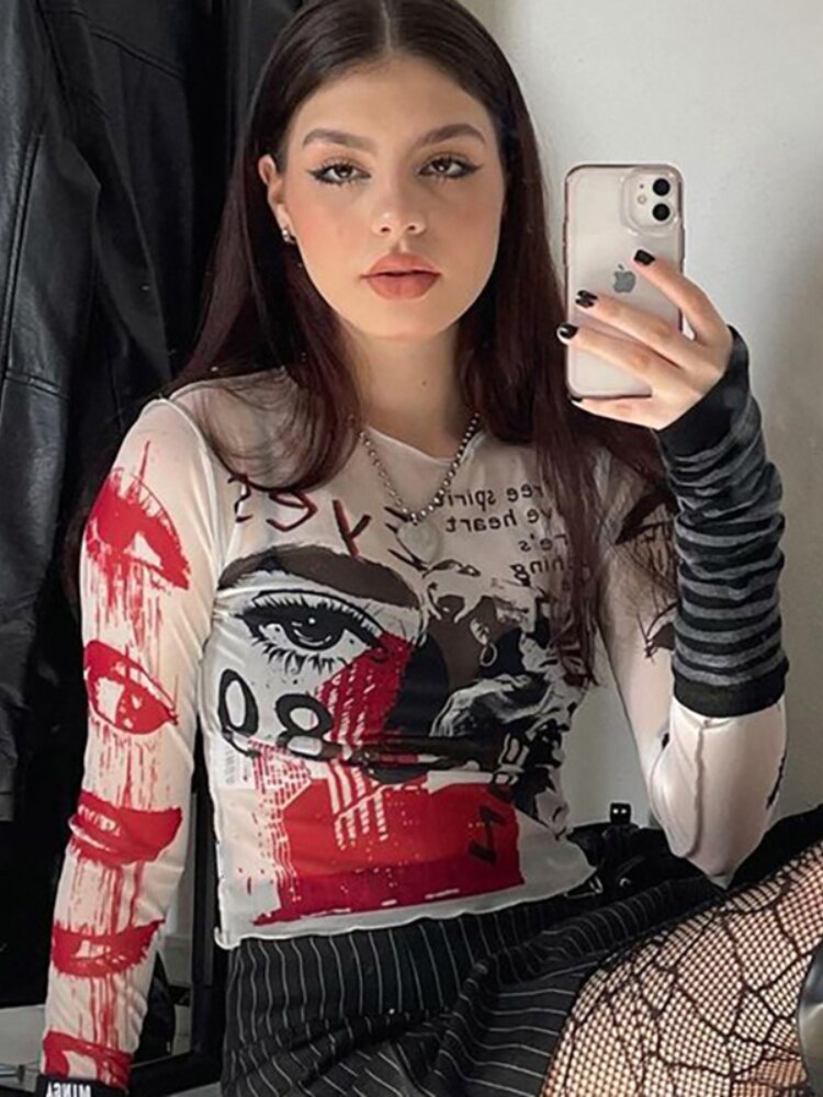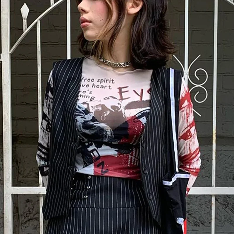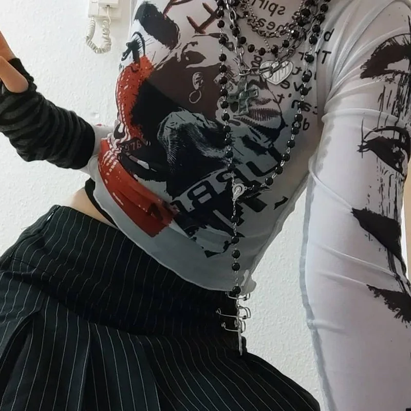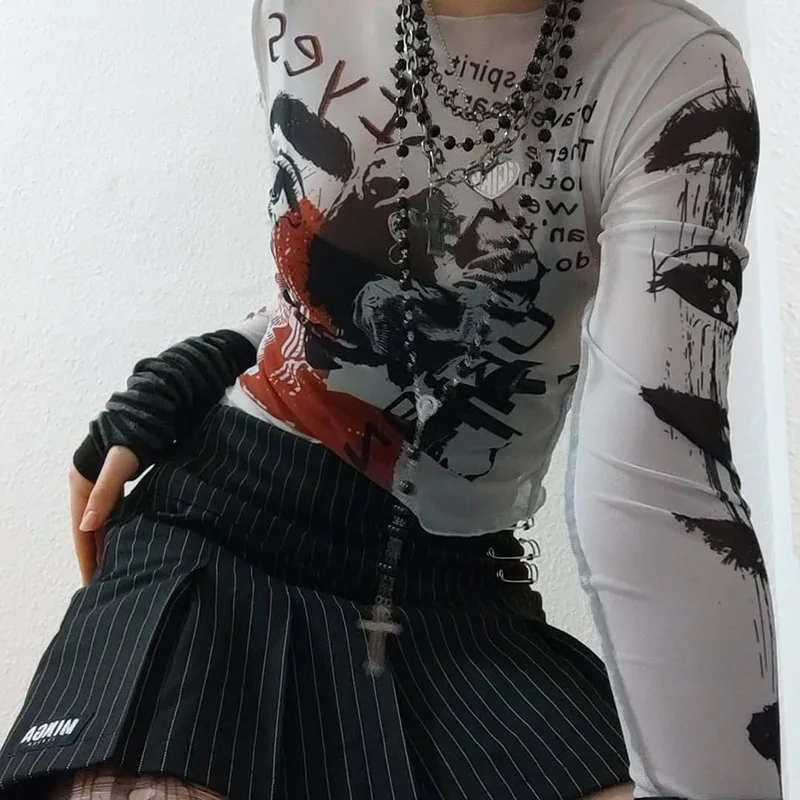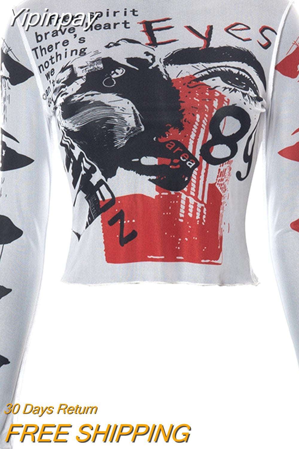 Yipinpay Gothic Aesthetic See Through Women T-shirts Grunge Sexy Printed Bodycon Crop Tops Punk E-girl Long Sleeve Clothes