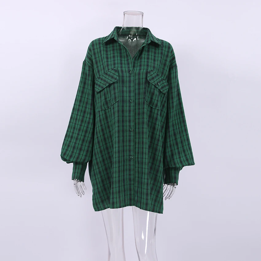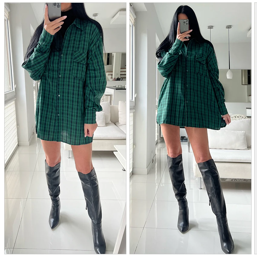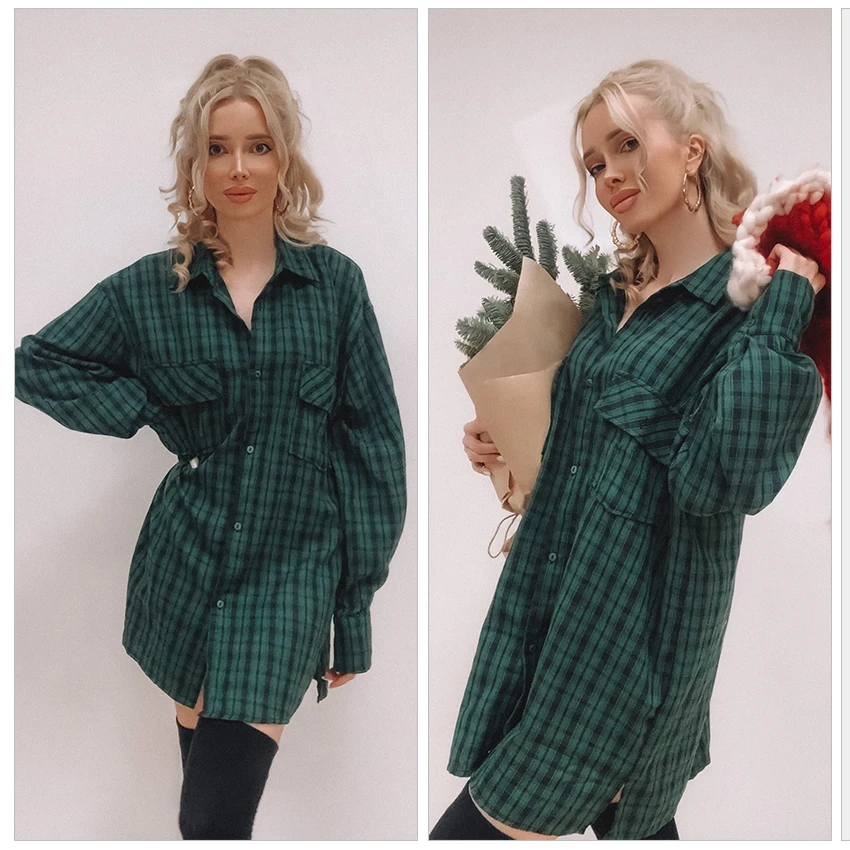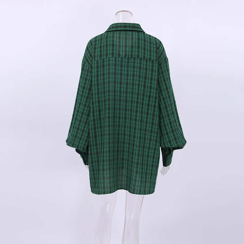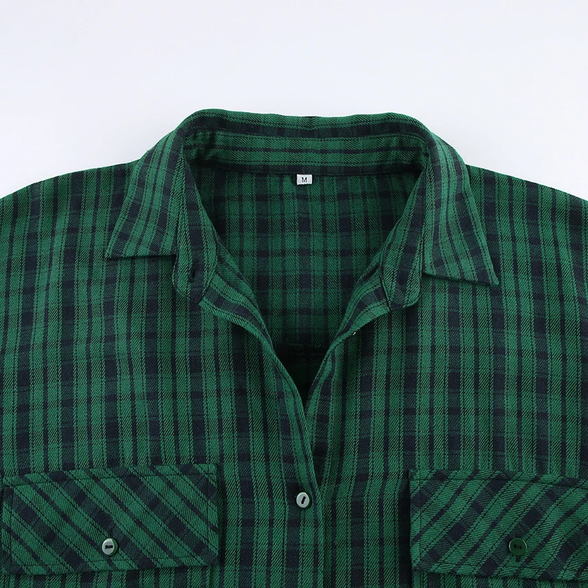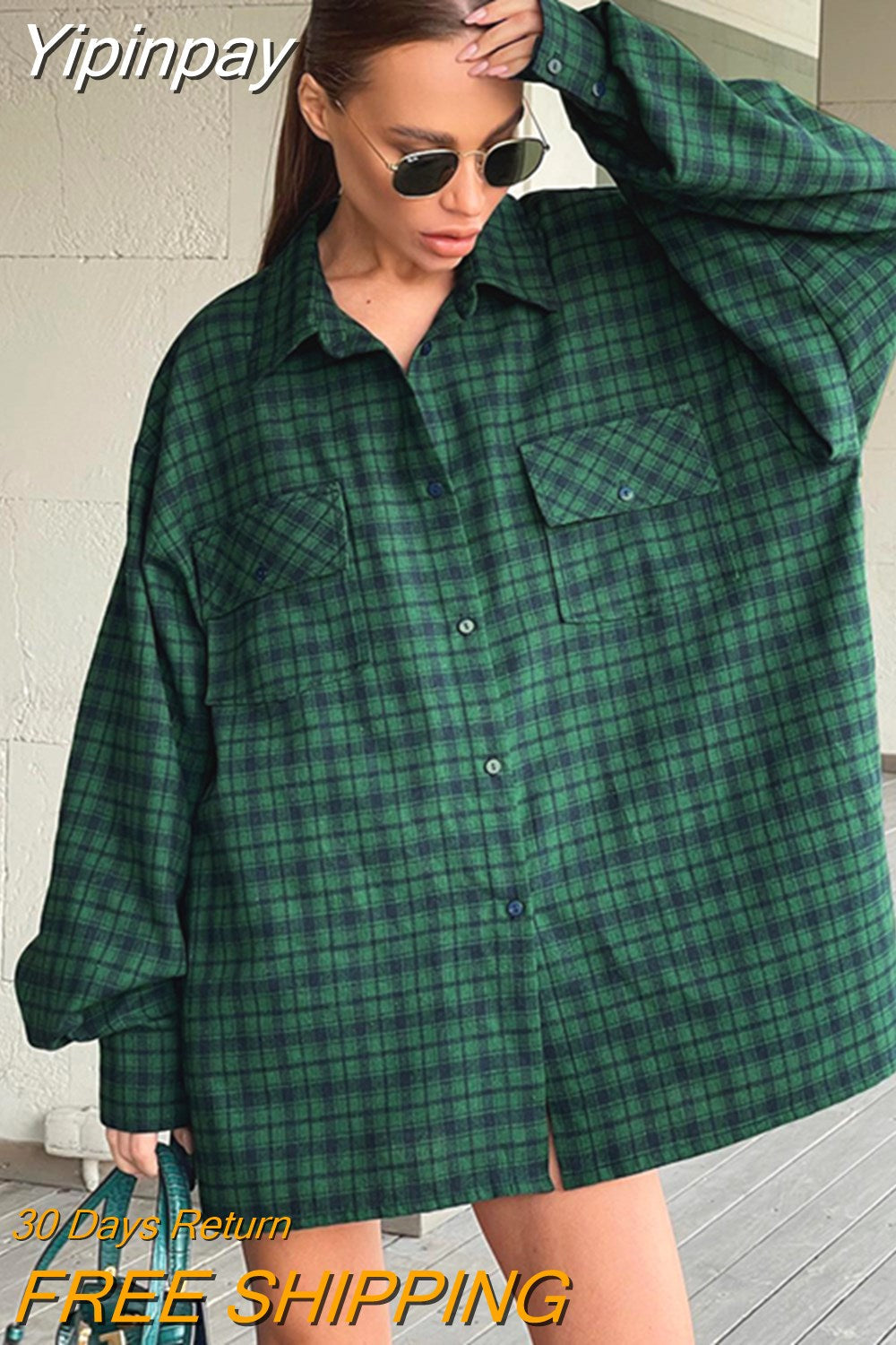 Yipinpay Green Shacket Oversize Shirts Women Dropped Shoulder Street Style Plaid Blouses Double Pockets Casual Loose Top 2023