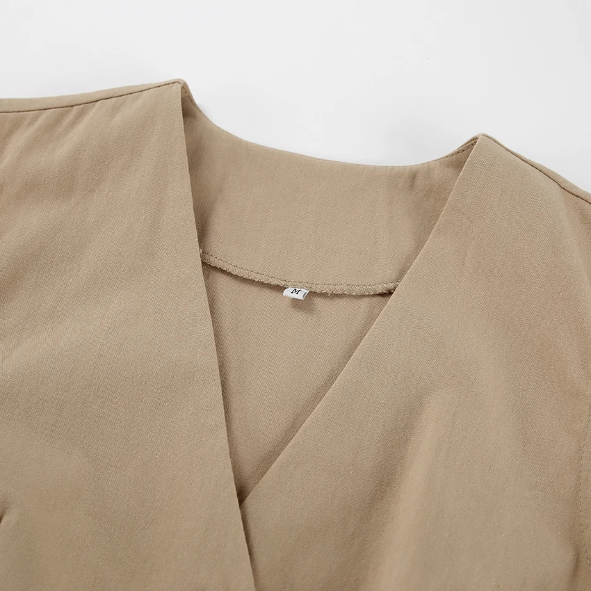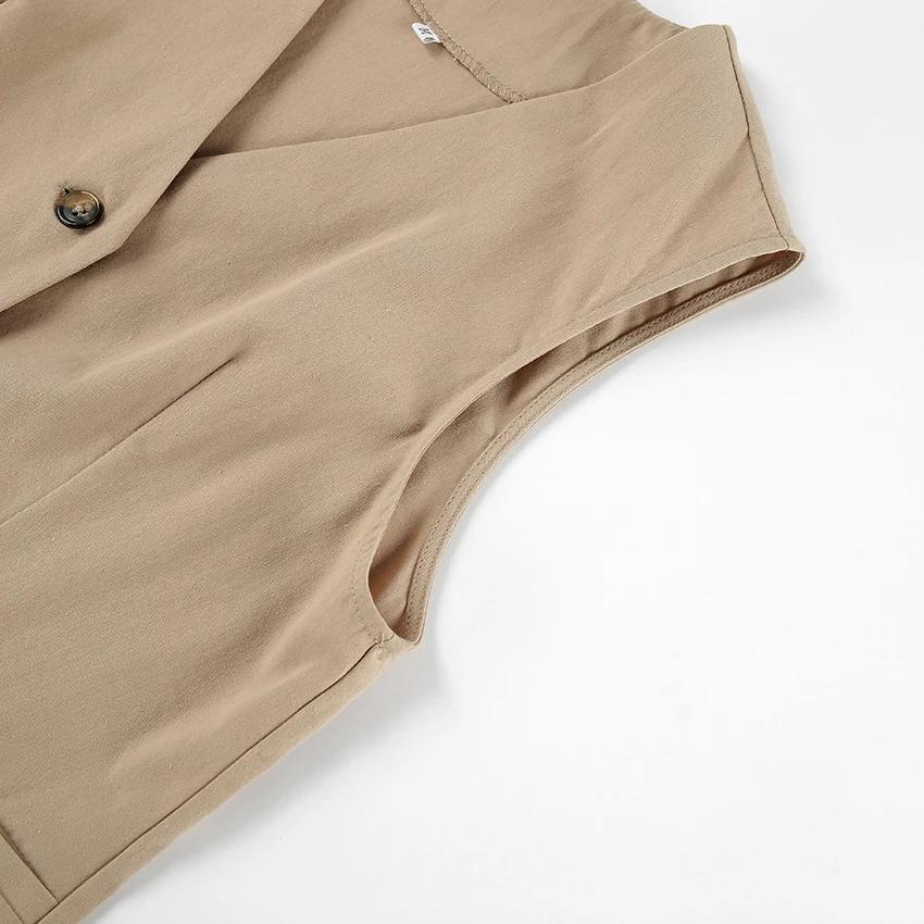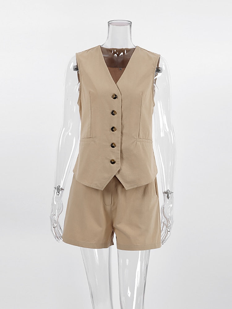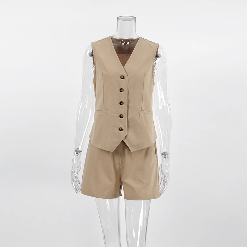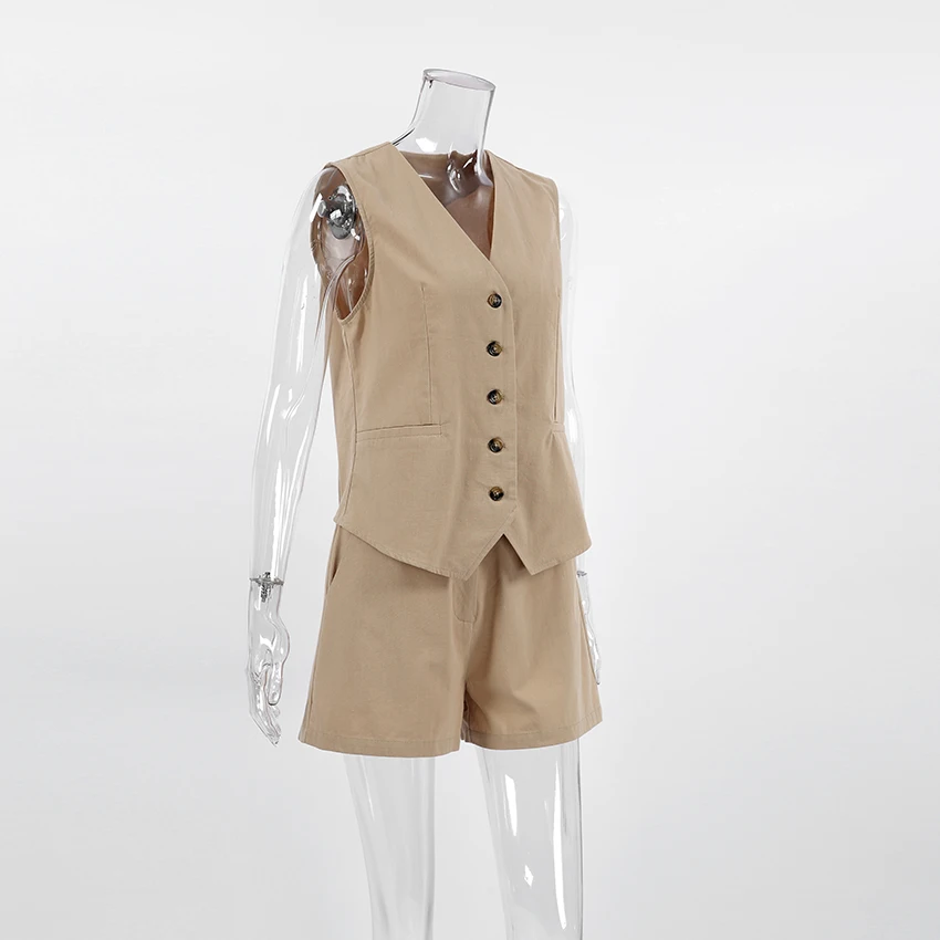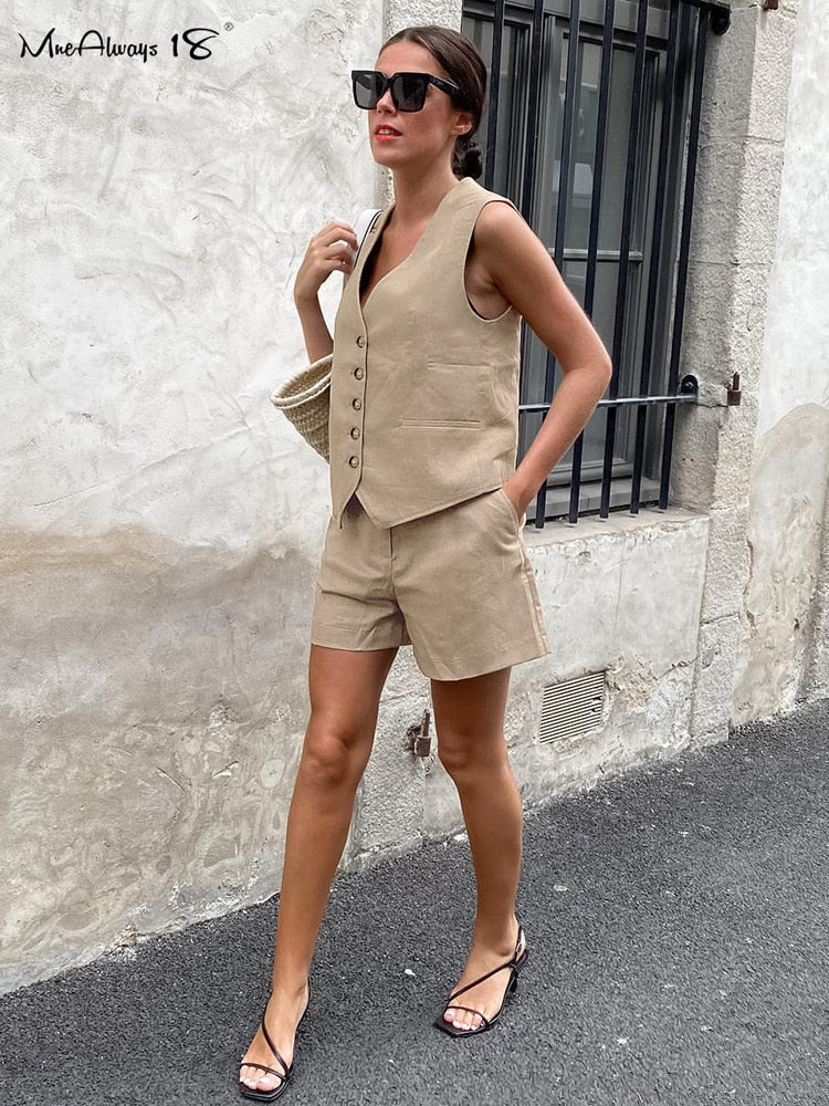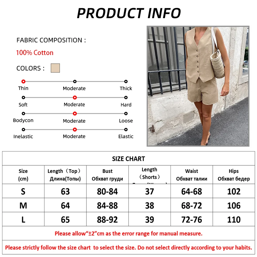Yipinpay Khaki Cotton Linen Shorts Suits Summer 2023 Women Vest Tops And Elastic Shorts 2 Pieces Suits Shorts Ladies Vacation