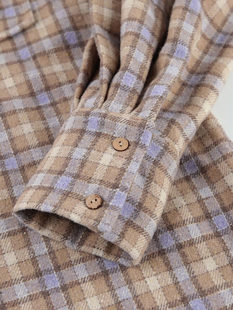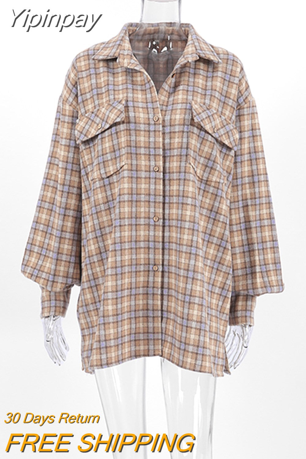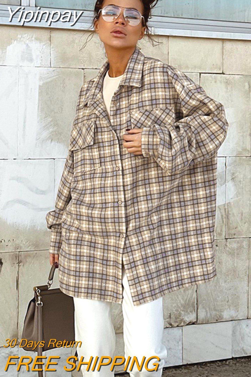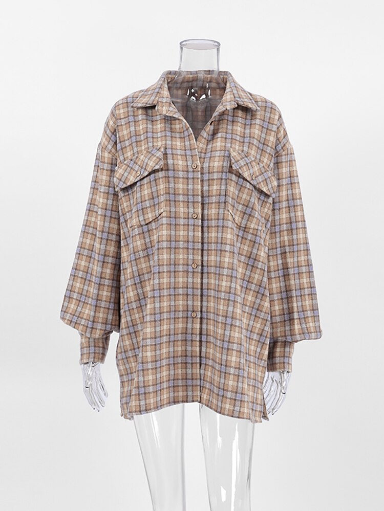 Yipinpay Khaki Shacket Oversized Shirts Womens Dropped Shoulder Plaid Blouses Outwear Street Style Pockets Casual Tops 2023