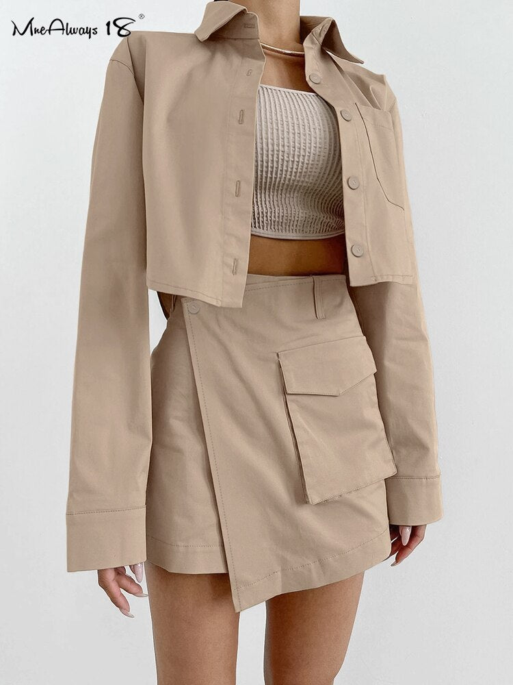 Yipinpay Khaki Street Women Cargo Skirts Suits Cropped Tops And Irregular Skirts Black 2 Pieces Sets Ladies Casual Skirts Set
