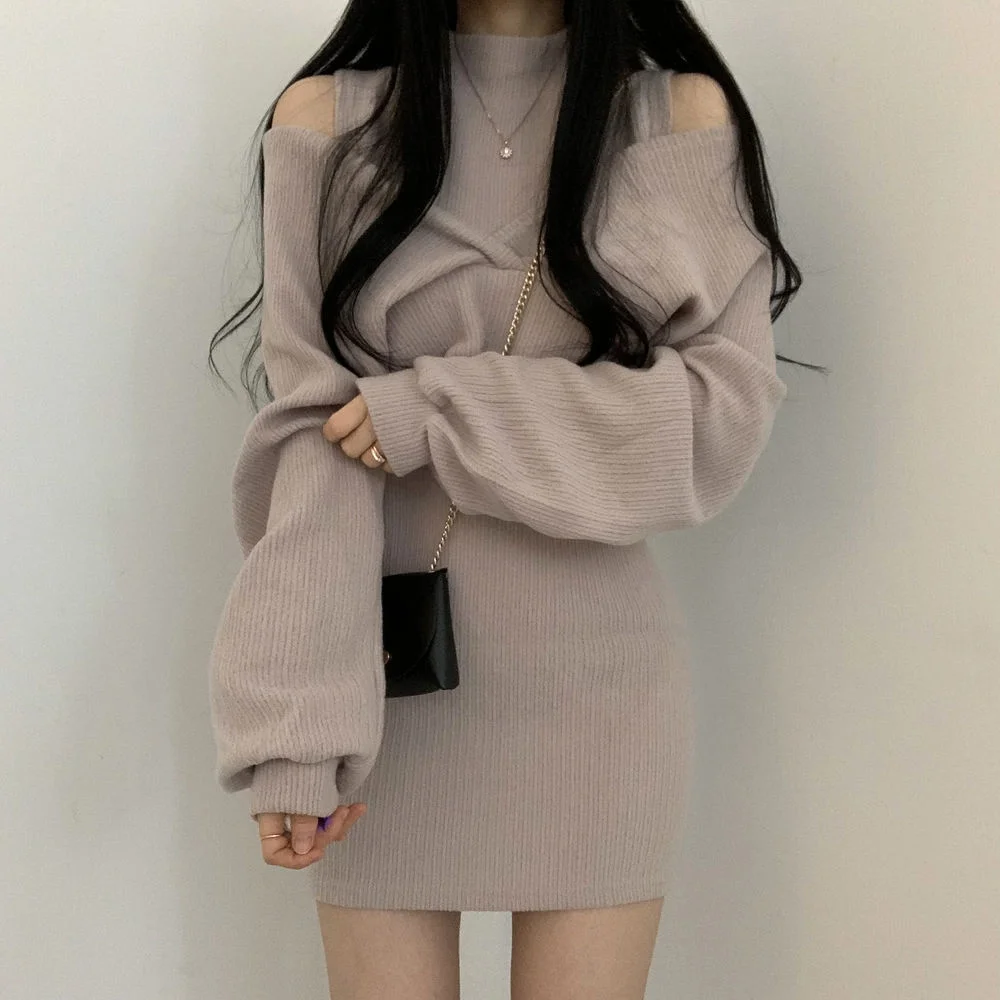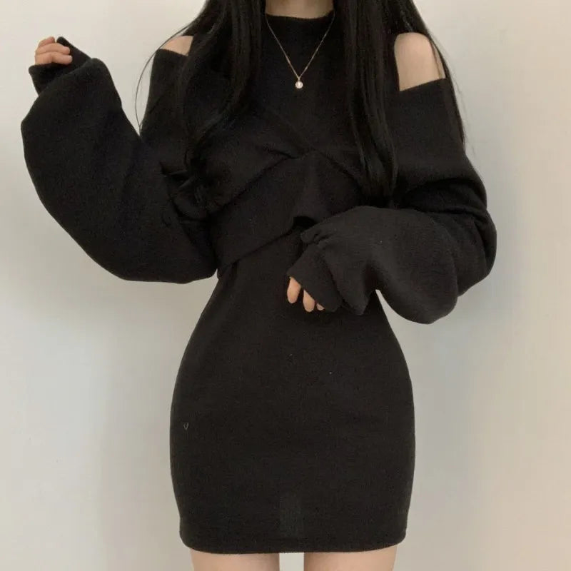 Yipinpay Knit Vest Turtleneck Dress Crop Long Sleeve Off Shoulder Sweater Top Two Piece Sets Vestidos Mujer 2023 Clothes Women