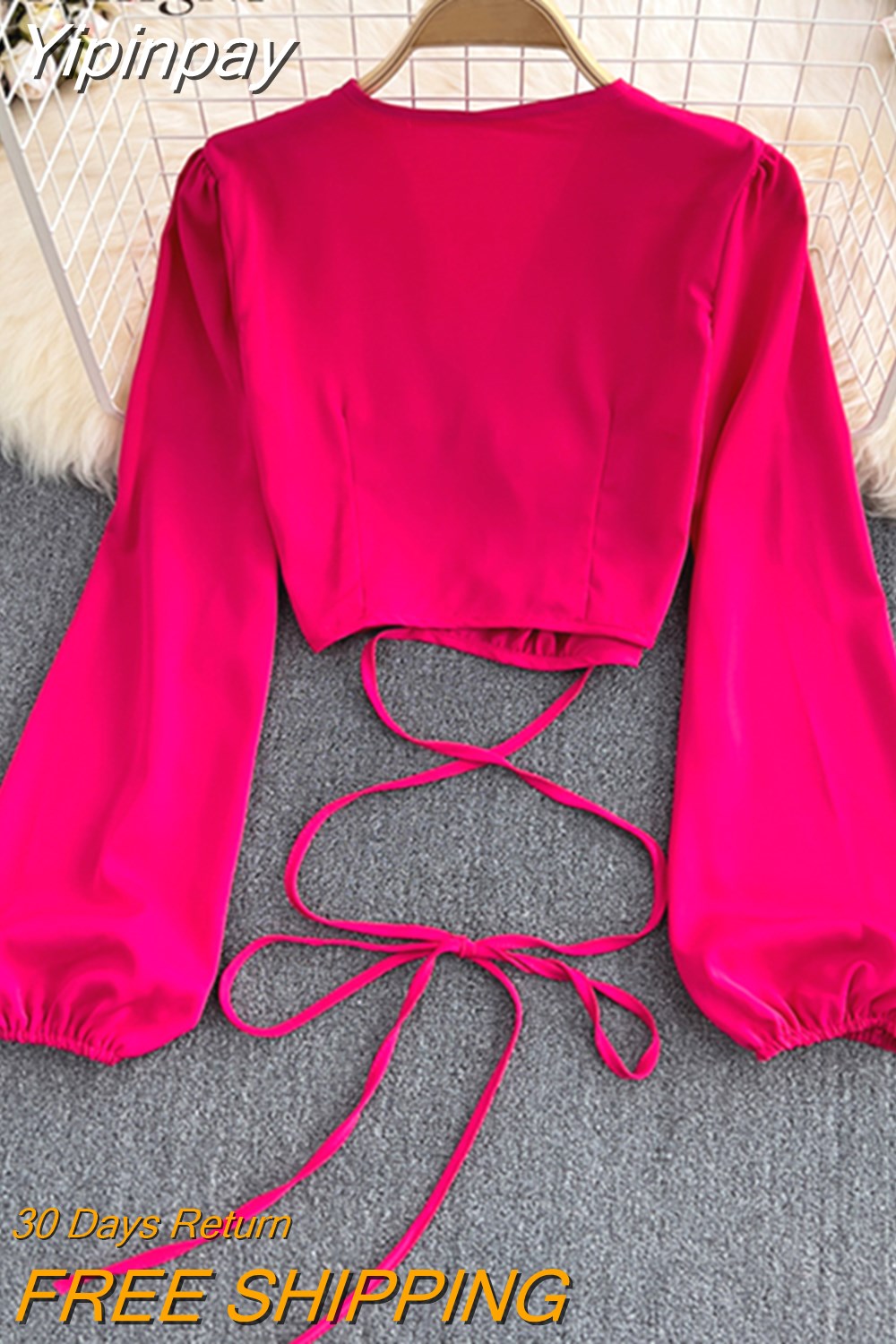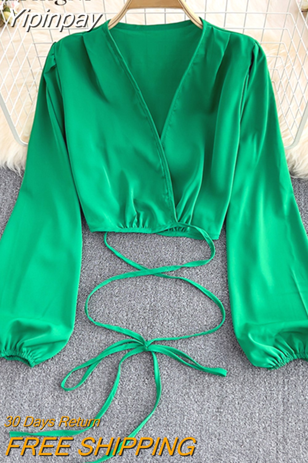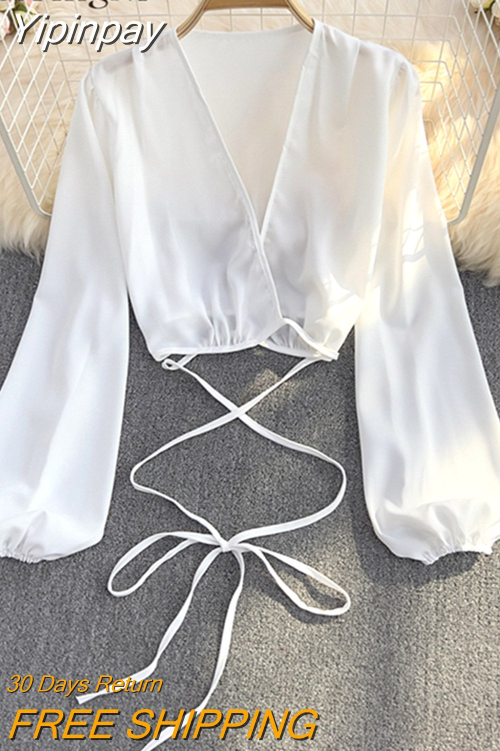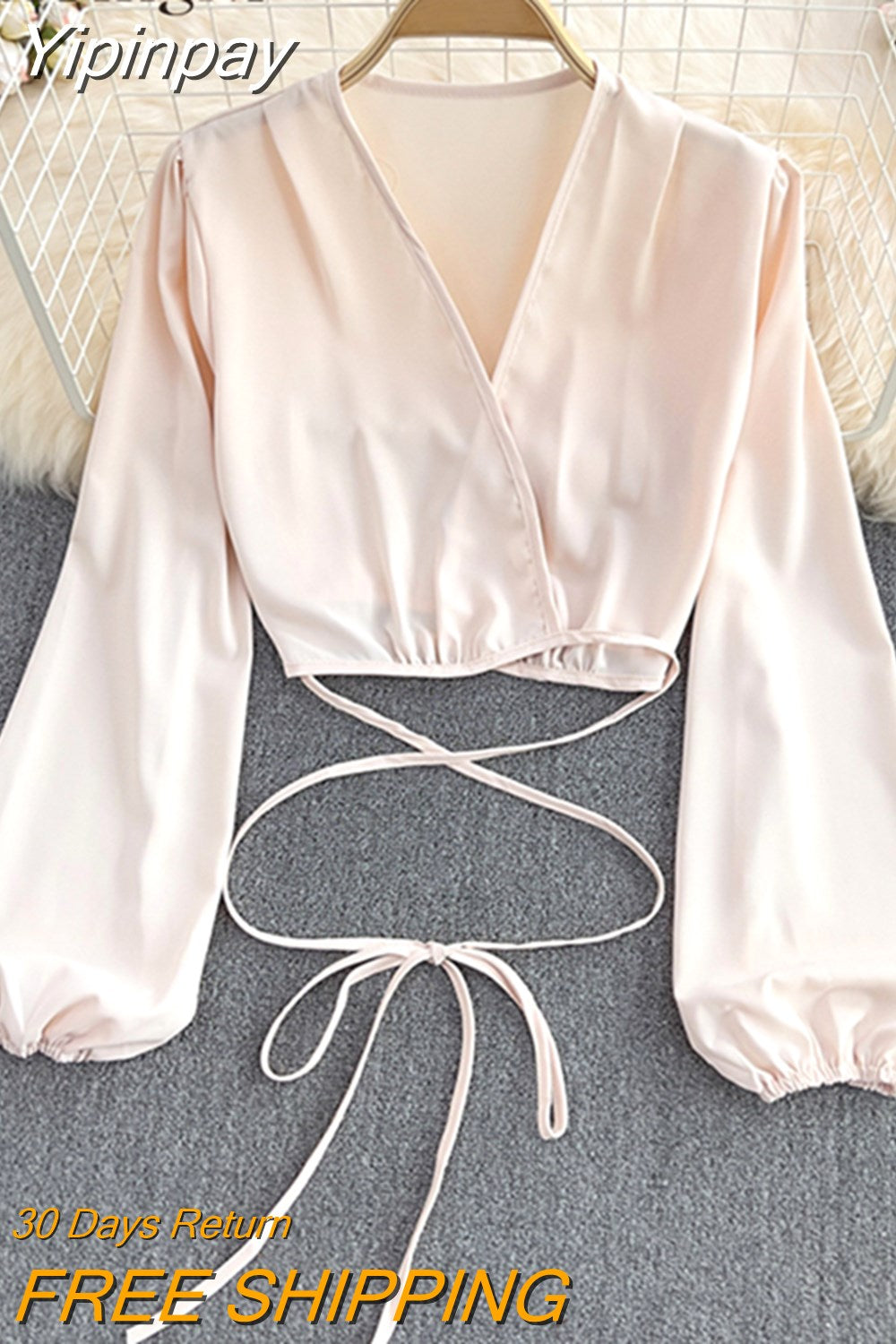 Yipinpay Korean Stylish Crop Top Shirts Women Lace-up Deep V Puff Sleeve Chic Female Blusas Casual Sexy Club Y2K Blouses Shirts