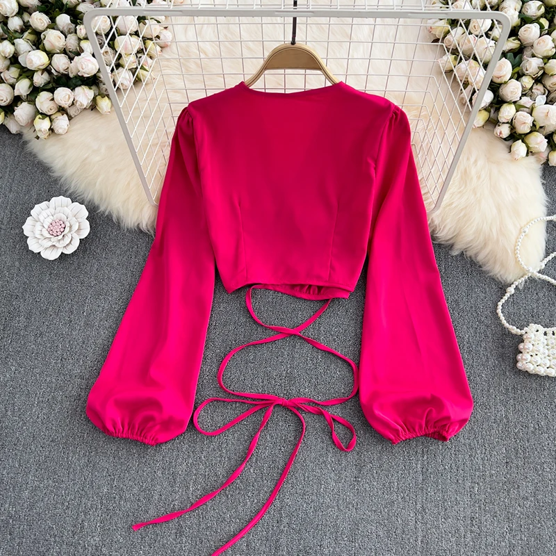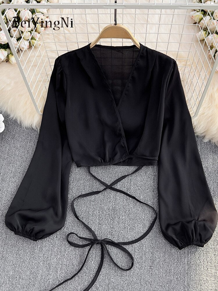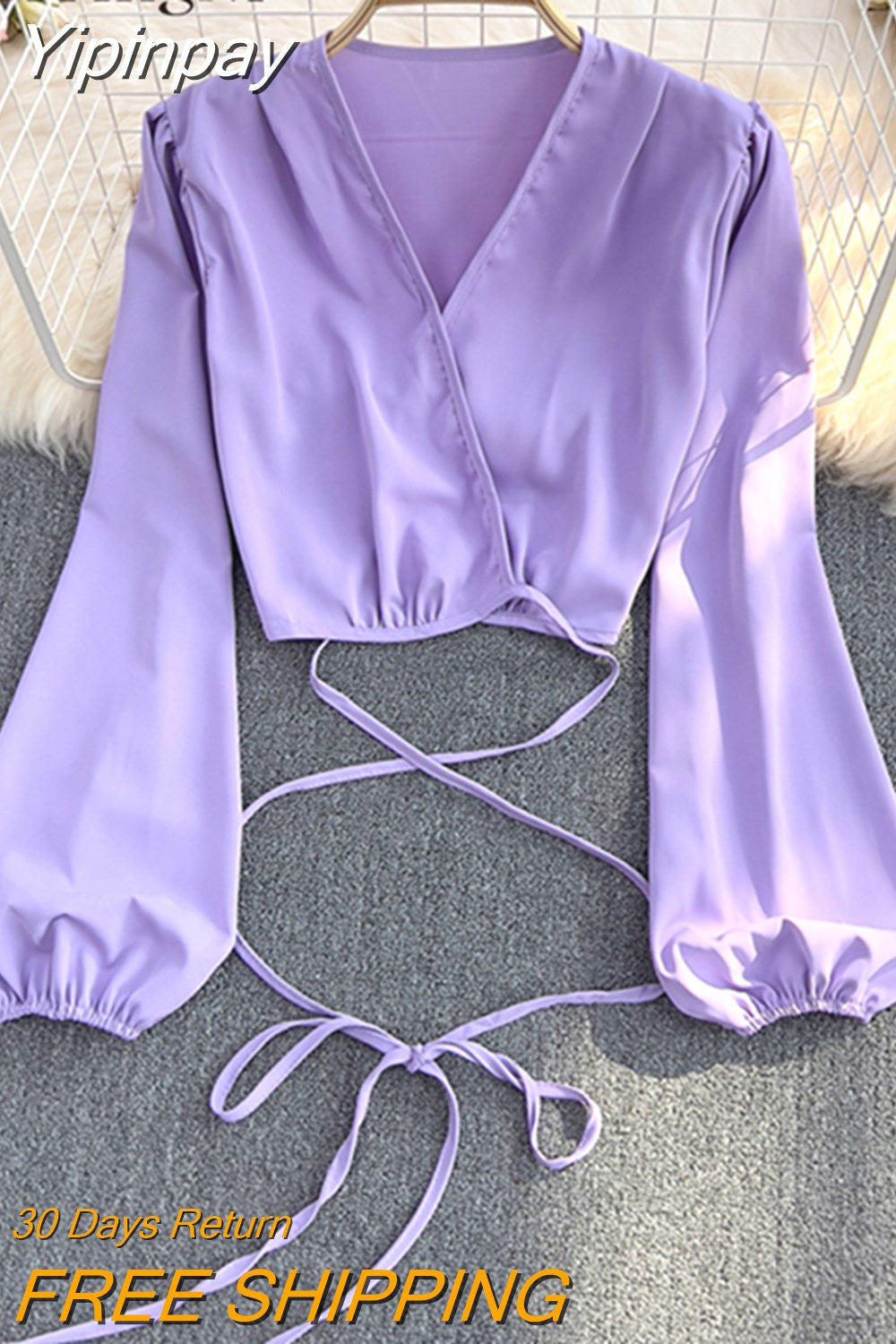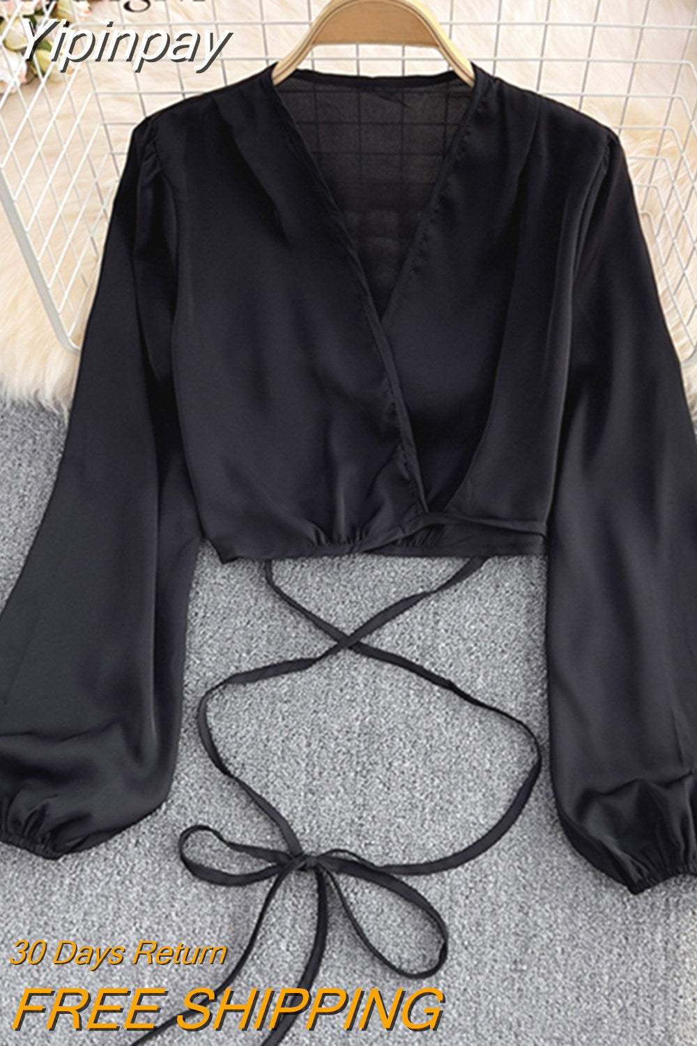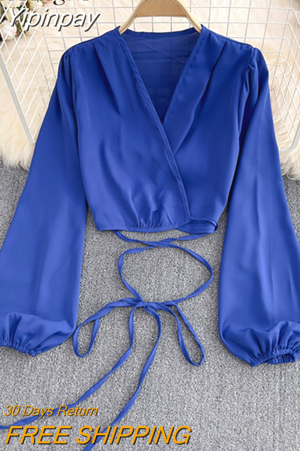 Yipinpay Korean Stylish Crop Top Shirts Women Lace-up Deep V Puff Sleeve Chic Female Blusas Casual Sexy Club Y2K Blouses Shirts