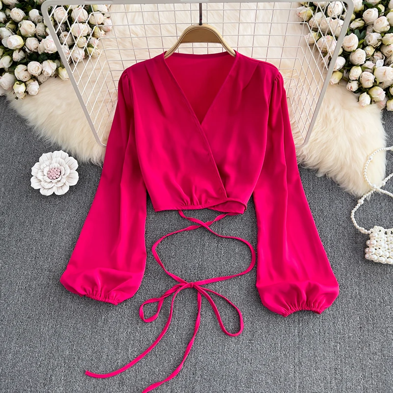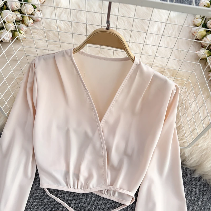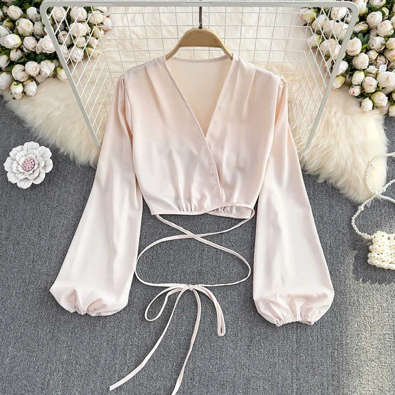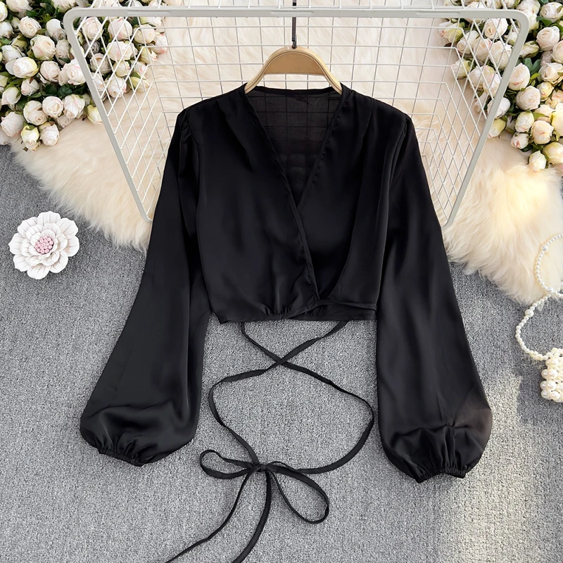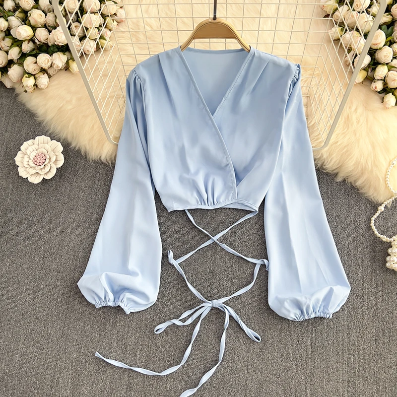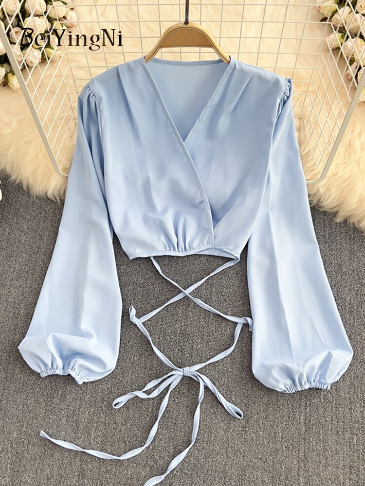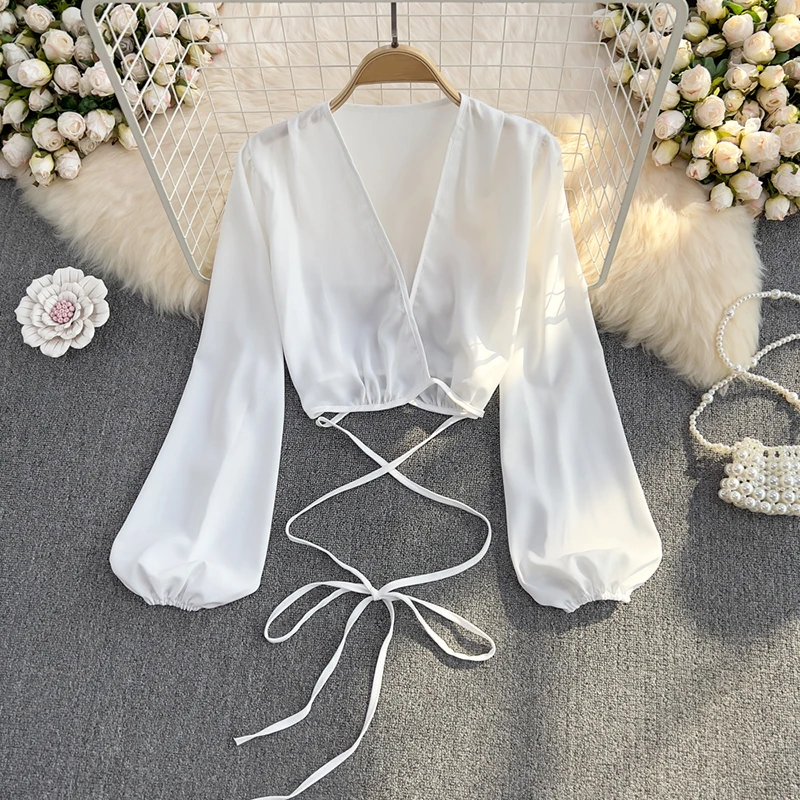 Yipinpay Korean Stylish Crop Top Shirts Women Lace-up Deep V Puff Sleeve Chic Female Blusas Casual Sexy Club Y2K Blouses Shirts