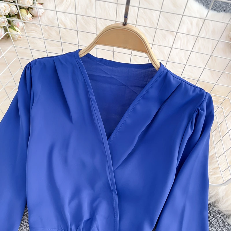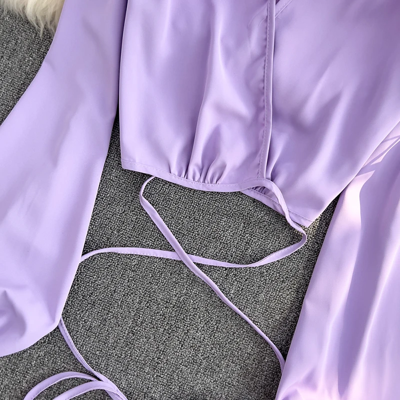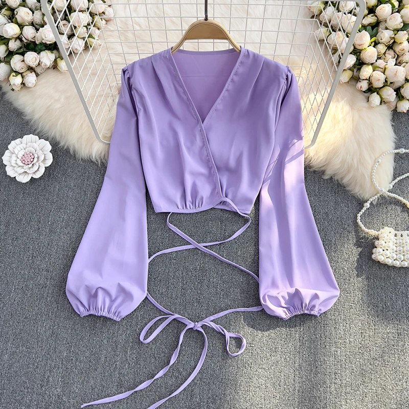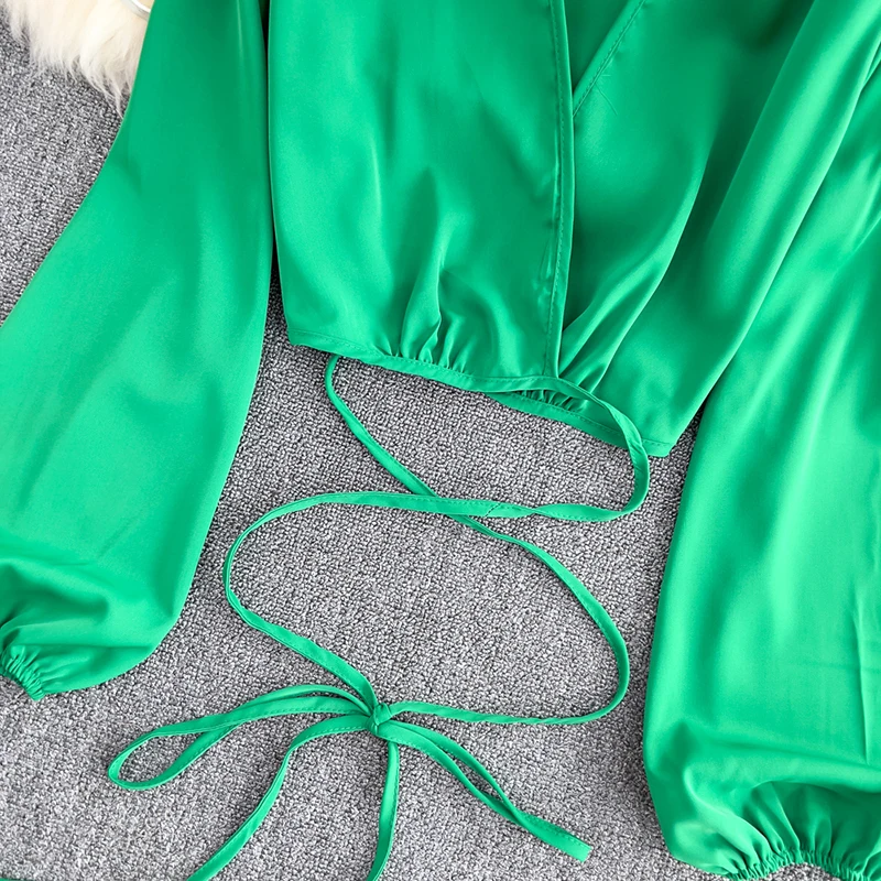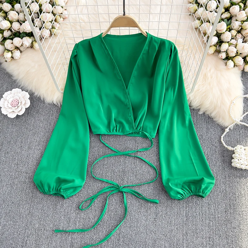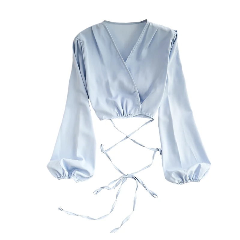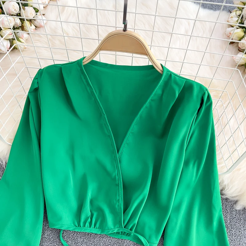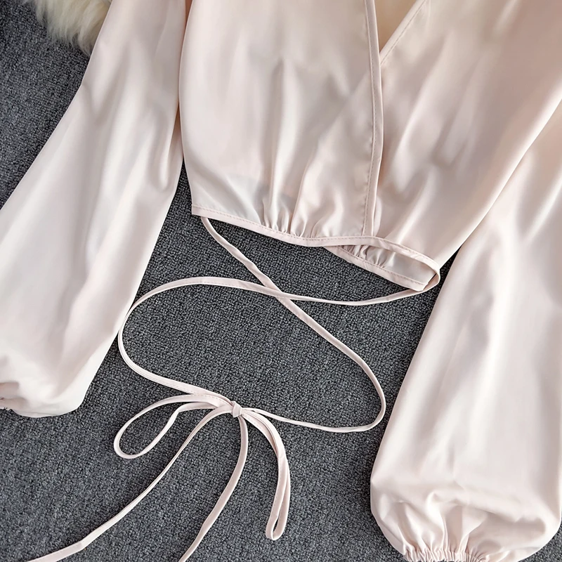 Yipinpay Korean Stylish Crop Top Shirts Women Lace-up Deep V Puff Sleeve Chic Female Blusas Casual Sexy Club Y2K Blouses Shirts