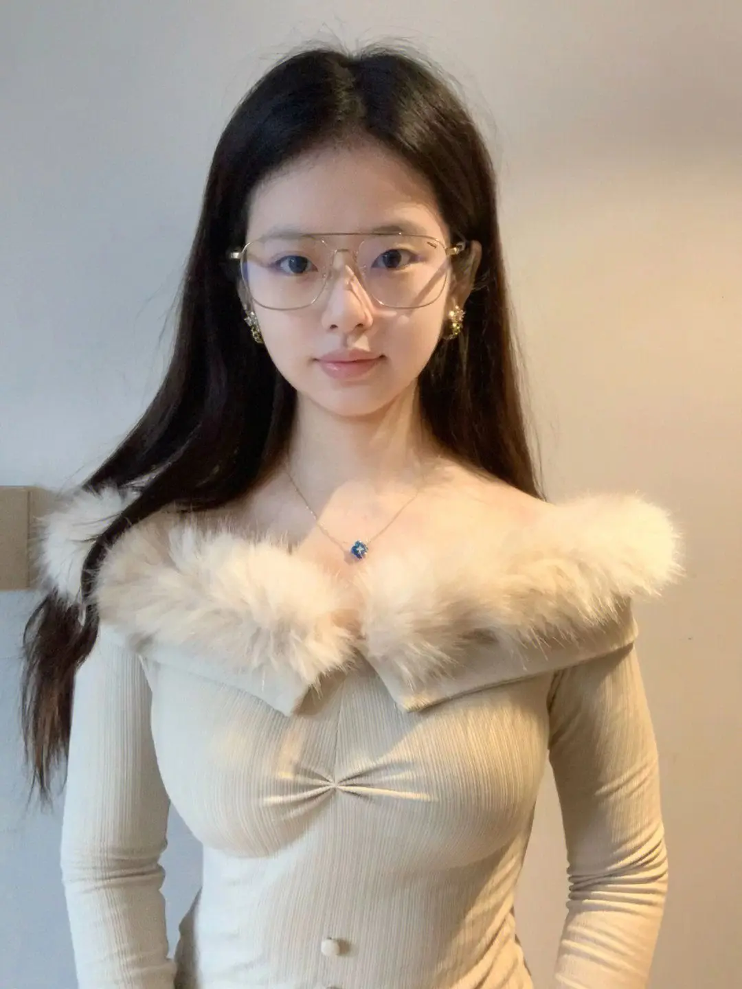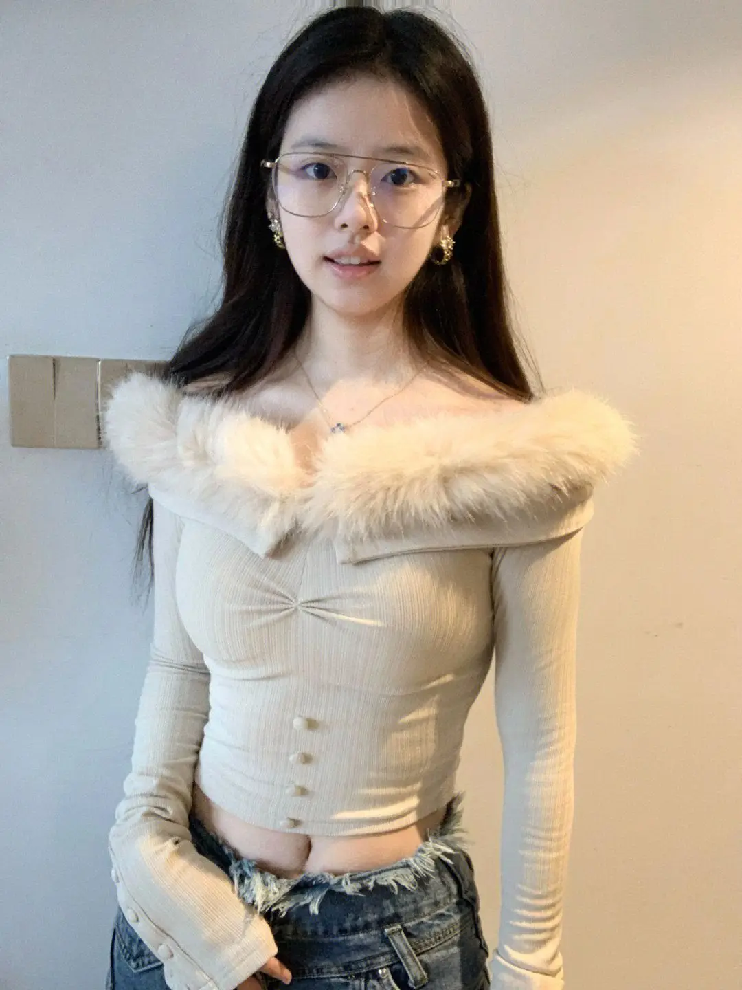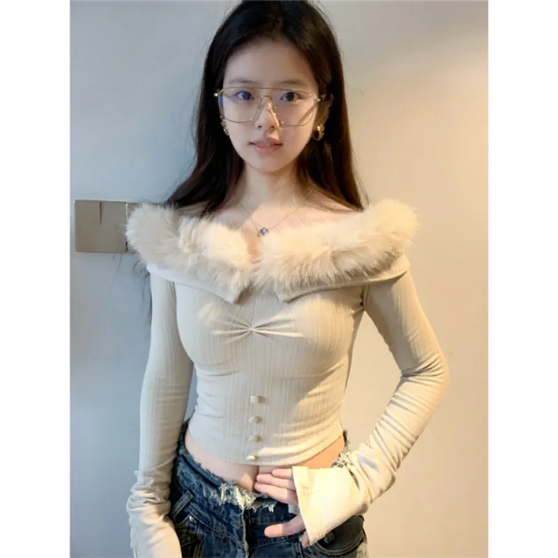 Yipinpay Neck Fur Collar Sexy Long Sleeve Y2k Clothes Crop Top Slim Women Tshirt Knitted Spring T-shirts Sweater Grunge Tee