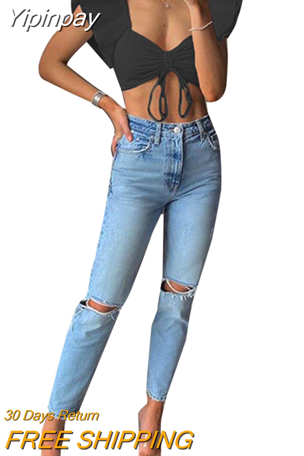 Yipinpay New Sexy Ruffles Fly Sleeve Crop Tops for Women Summer Solid Color V-Neck Lace-up Bandeau Tops Chic Female T-Shirt