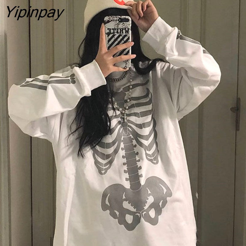 Yipinpay new skull print street hip-hop couple long-sleeved T-shirt graphic t shirts harajuku y2k tops women shirts clothes