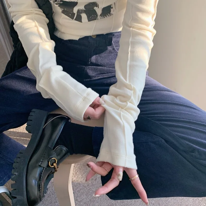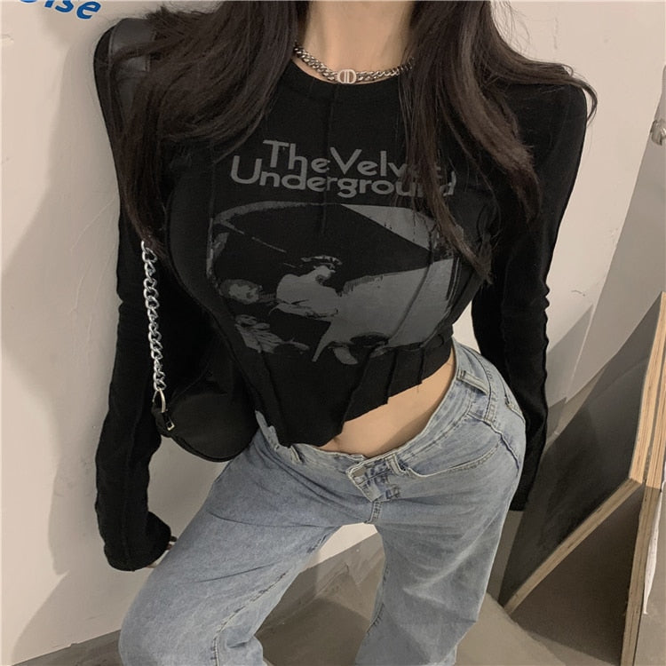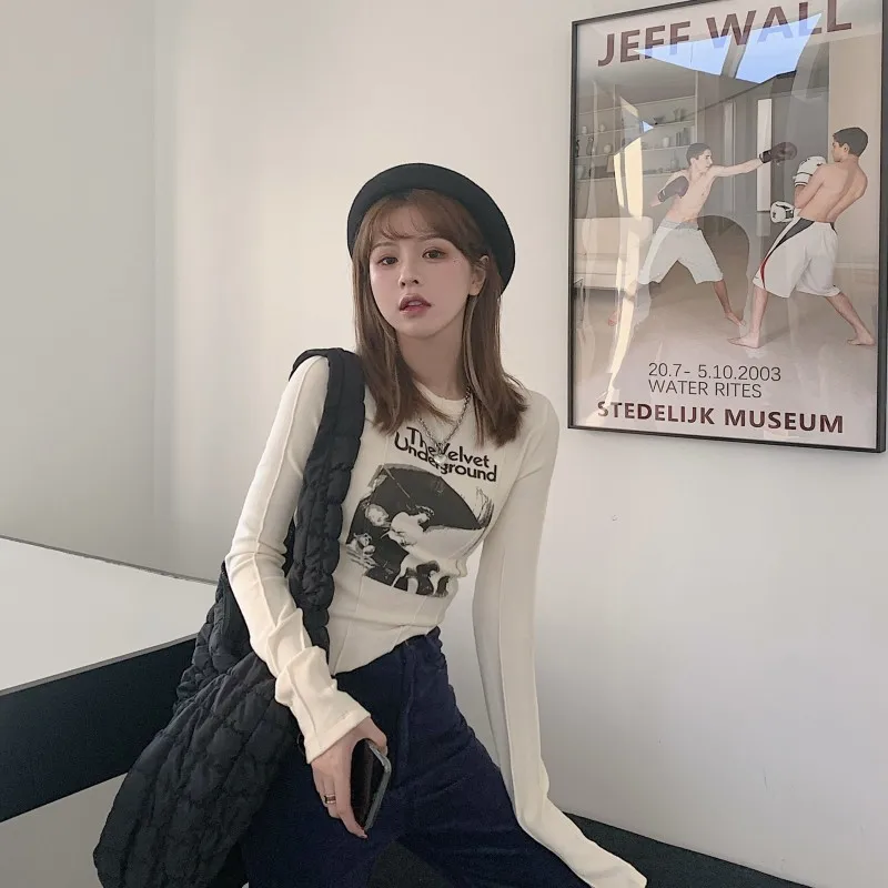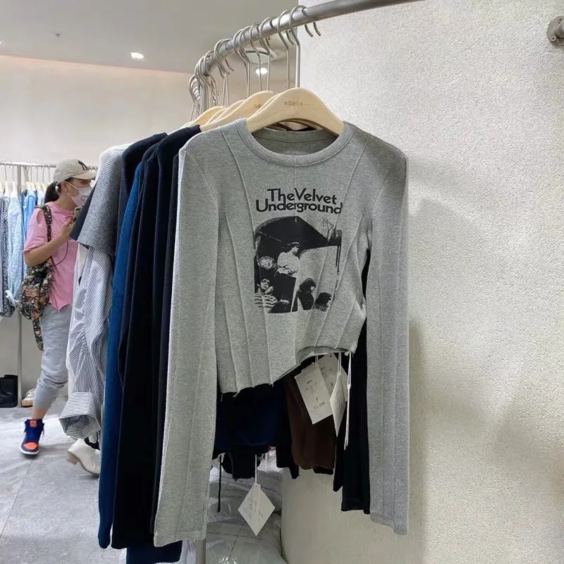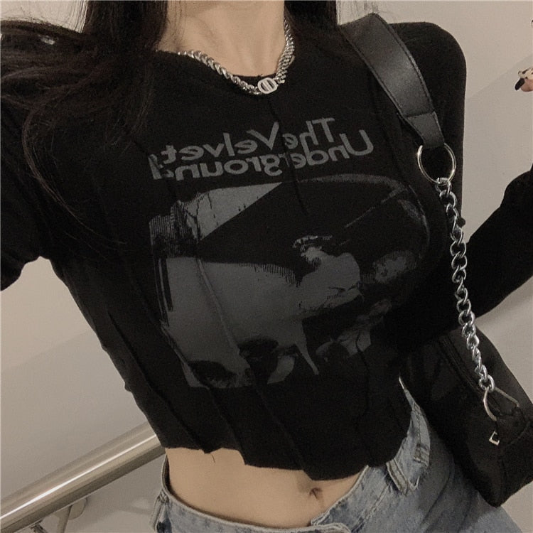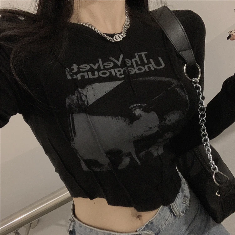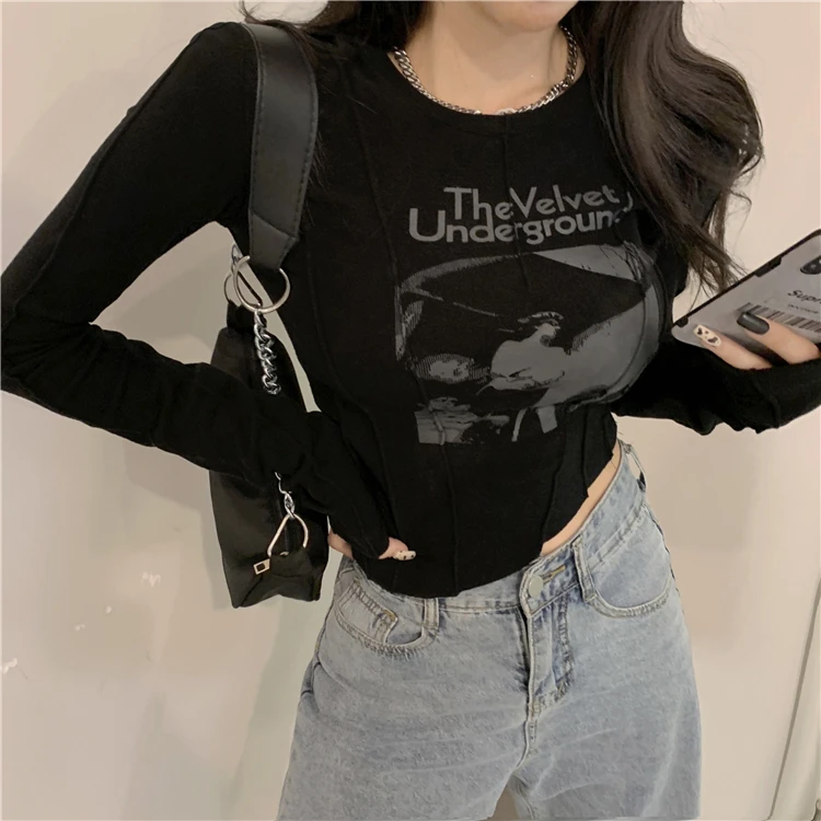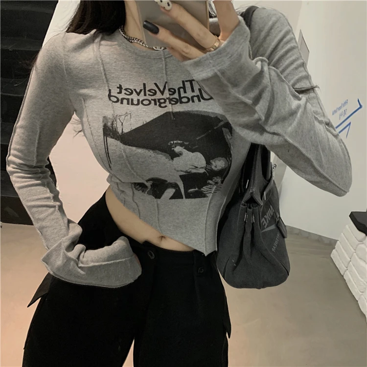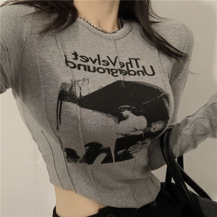 Yipinpay Print Cropped Tops 90s Vintage Women Long Sleeve Skinny T-shirt Y2K Female Autumn Basice Tees Harajuku Streetwear