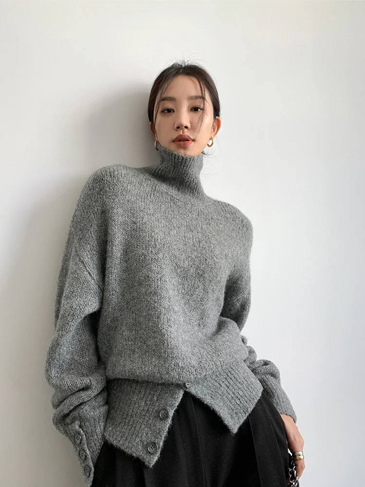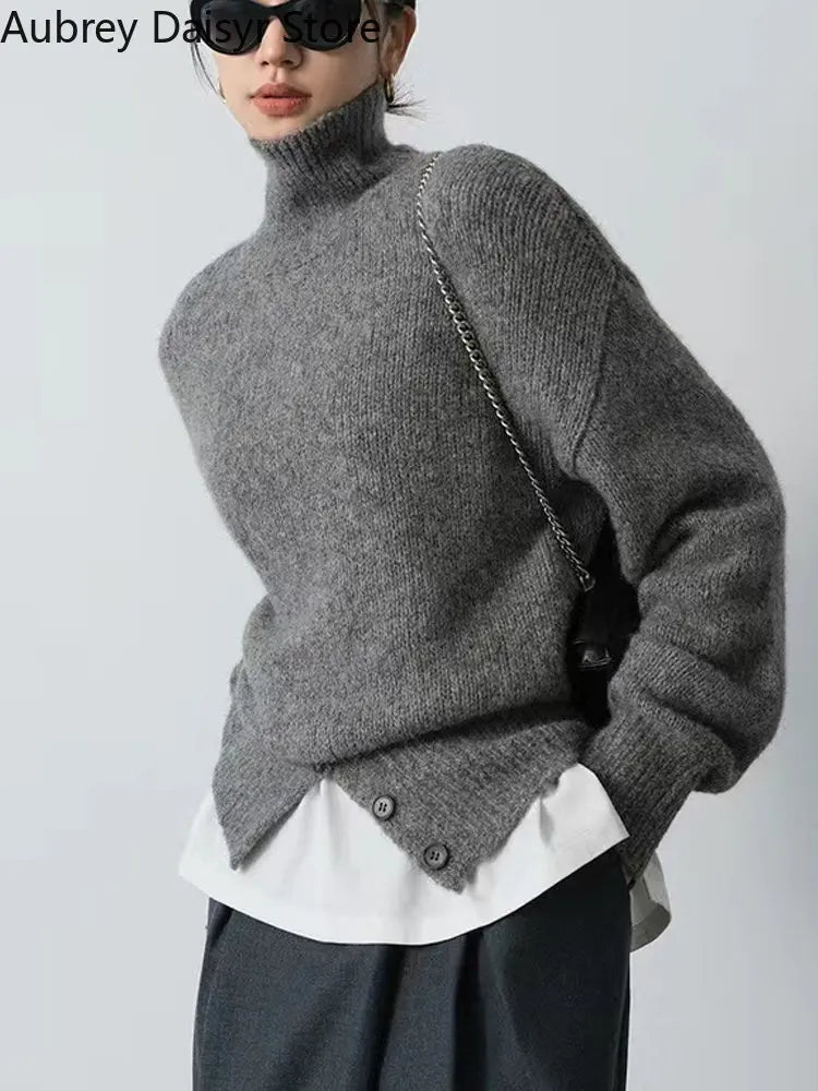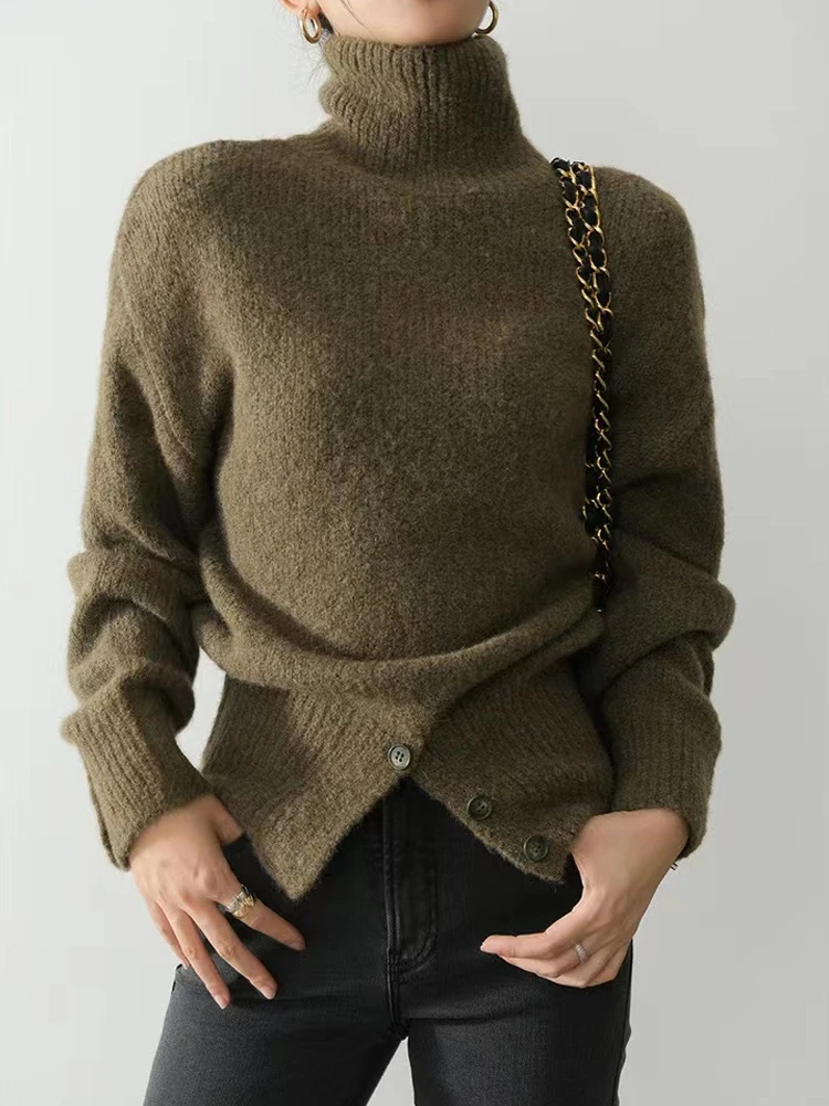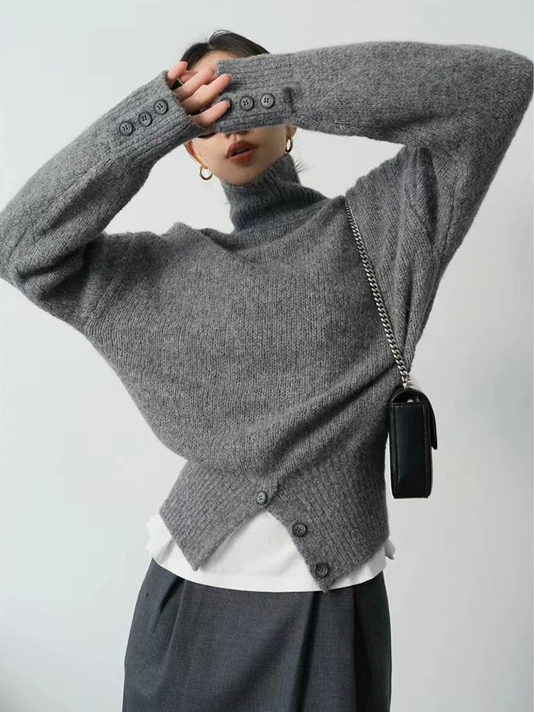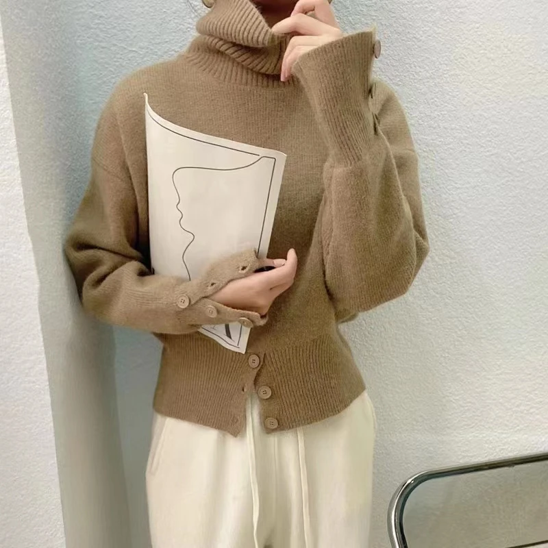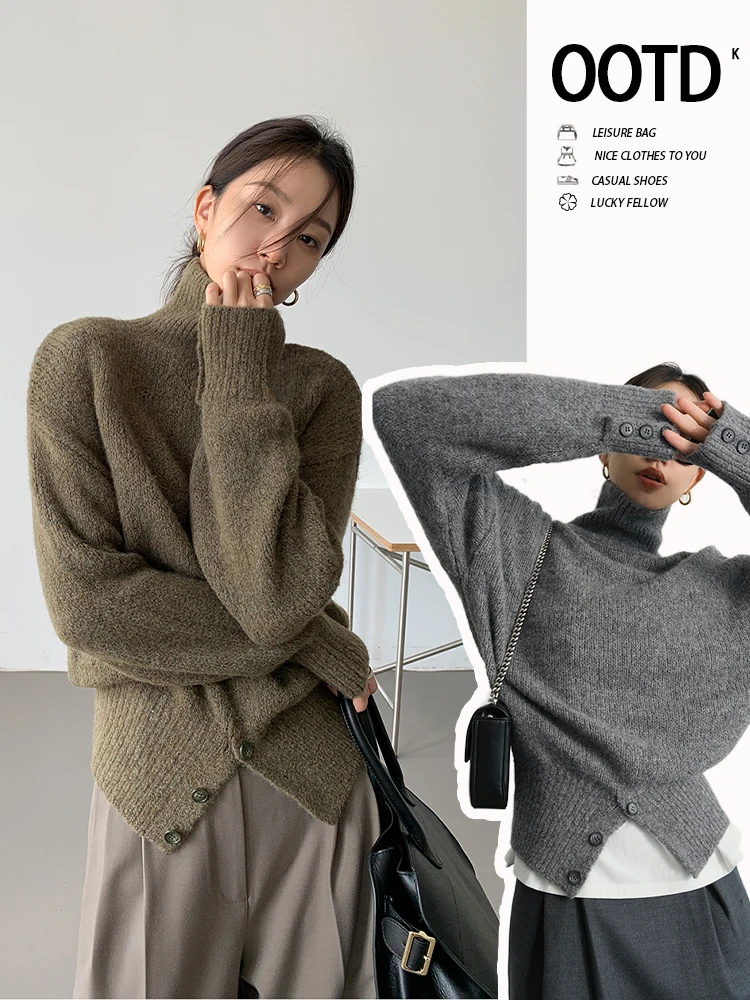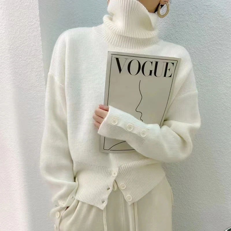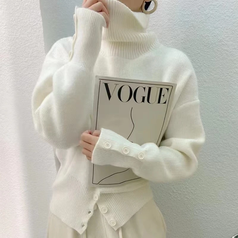 Yipinpay Pullover Sweater Women Irregular Button Design Knitted Sweater Female Korean Fashion Elegant Turtleneck Slit Pullover Top