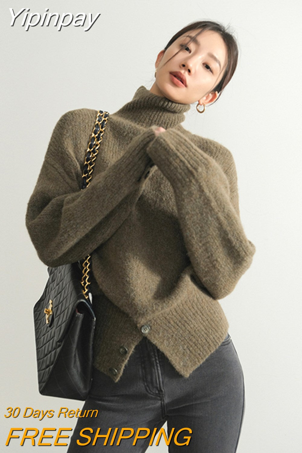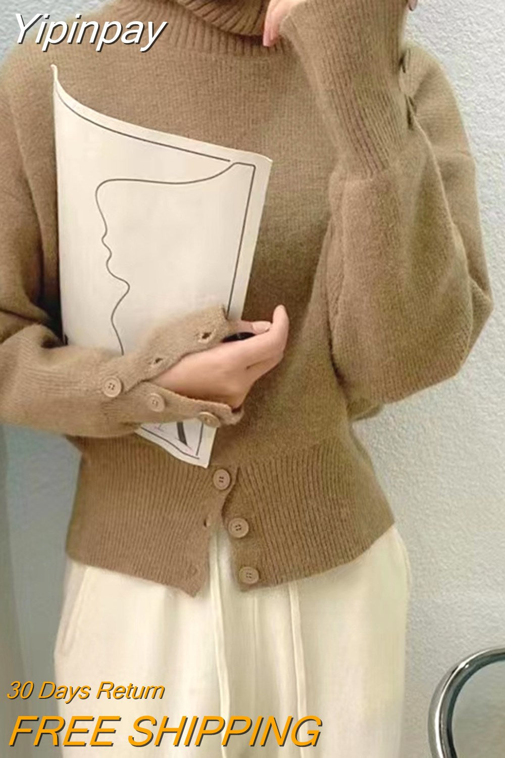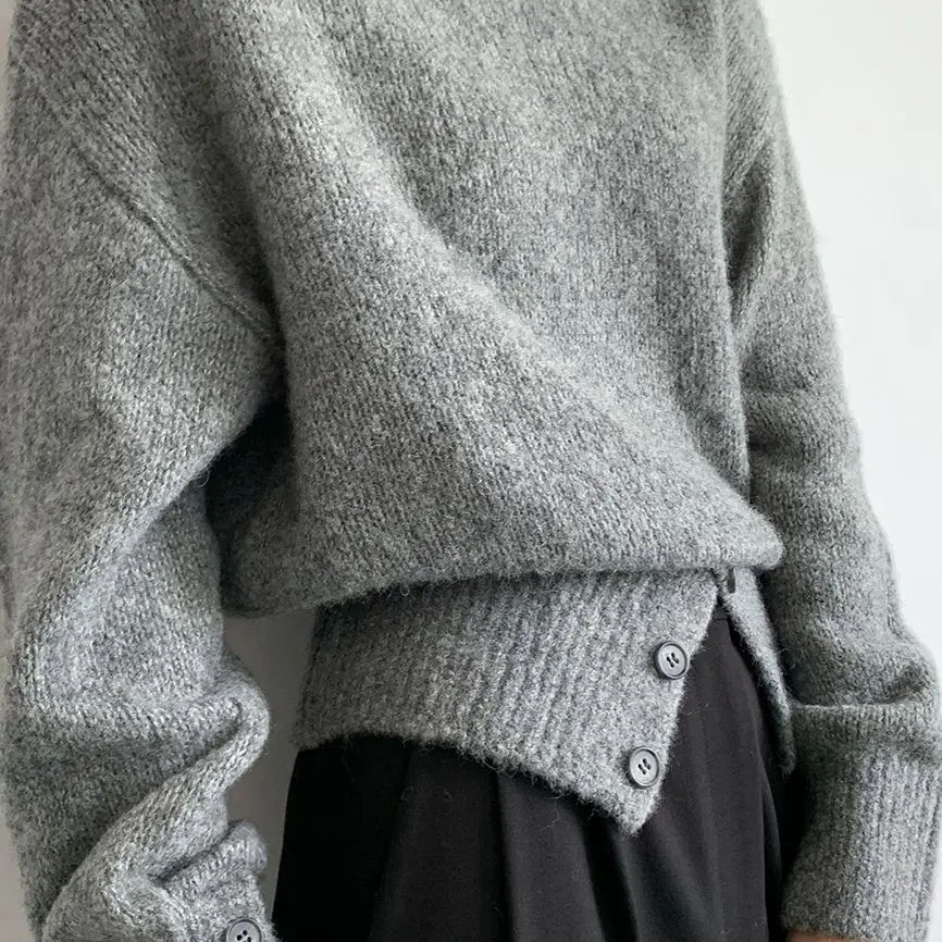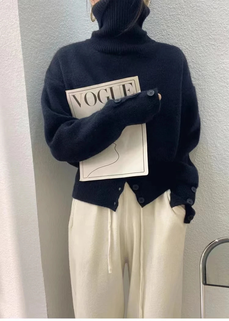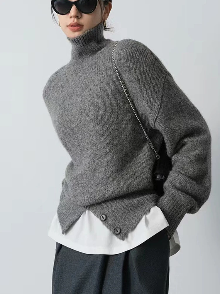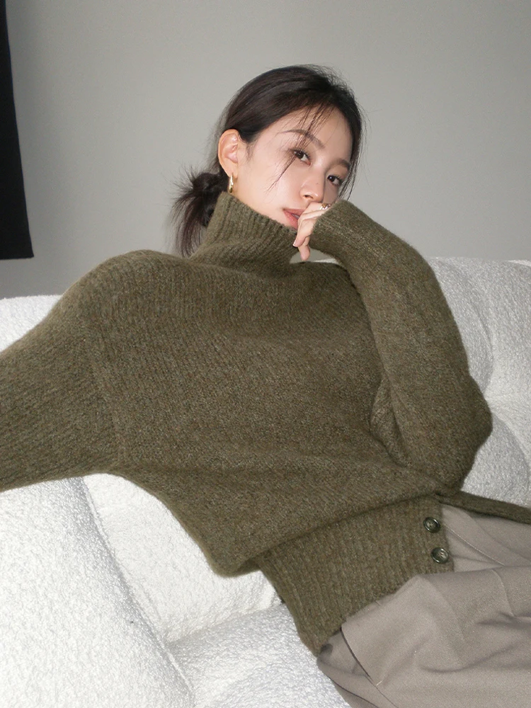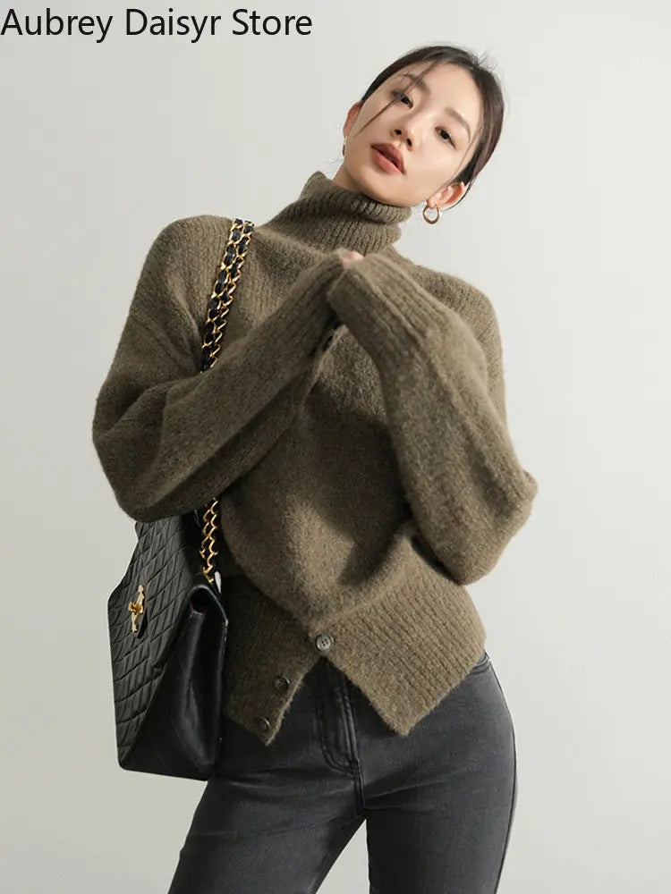 Yipinpay Pullover Sweater Women Irregular Button Design Knitted Sweater Female Korean Fashion Elegant Turtleneck Slit Pullover Top