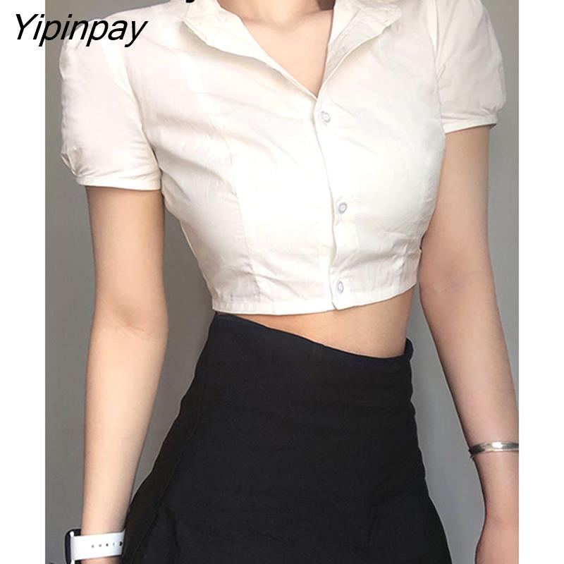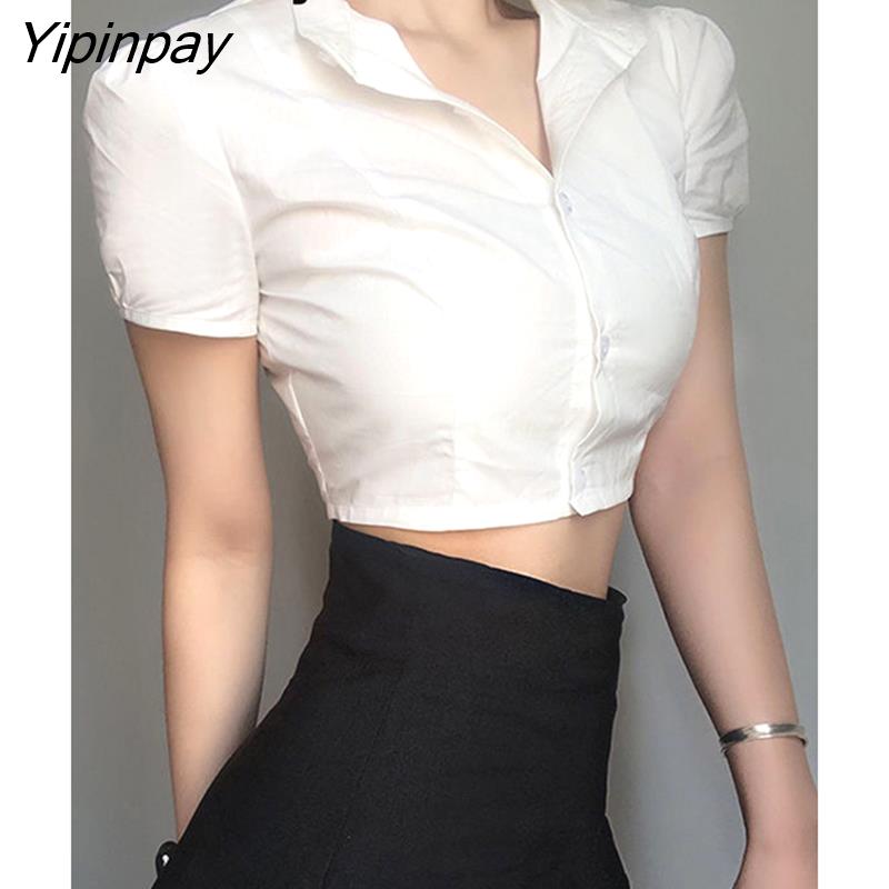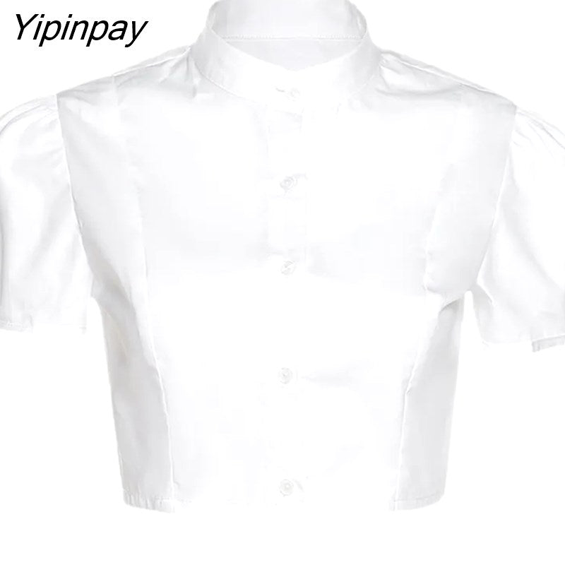 Yipinpay Sexy White Shirt Women Stand Neck Button Short Sleeve Slim Crop Blouse 2023 Summer New Party Y2k Female Clothing Tops